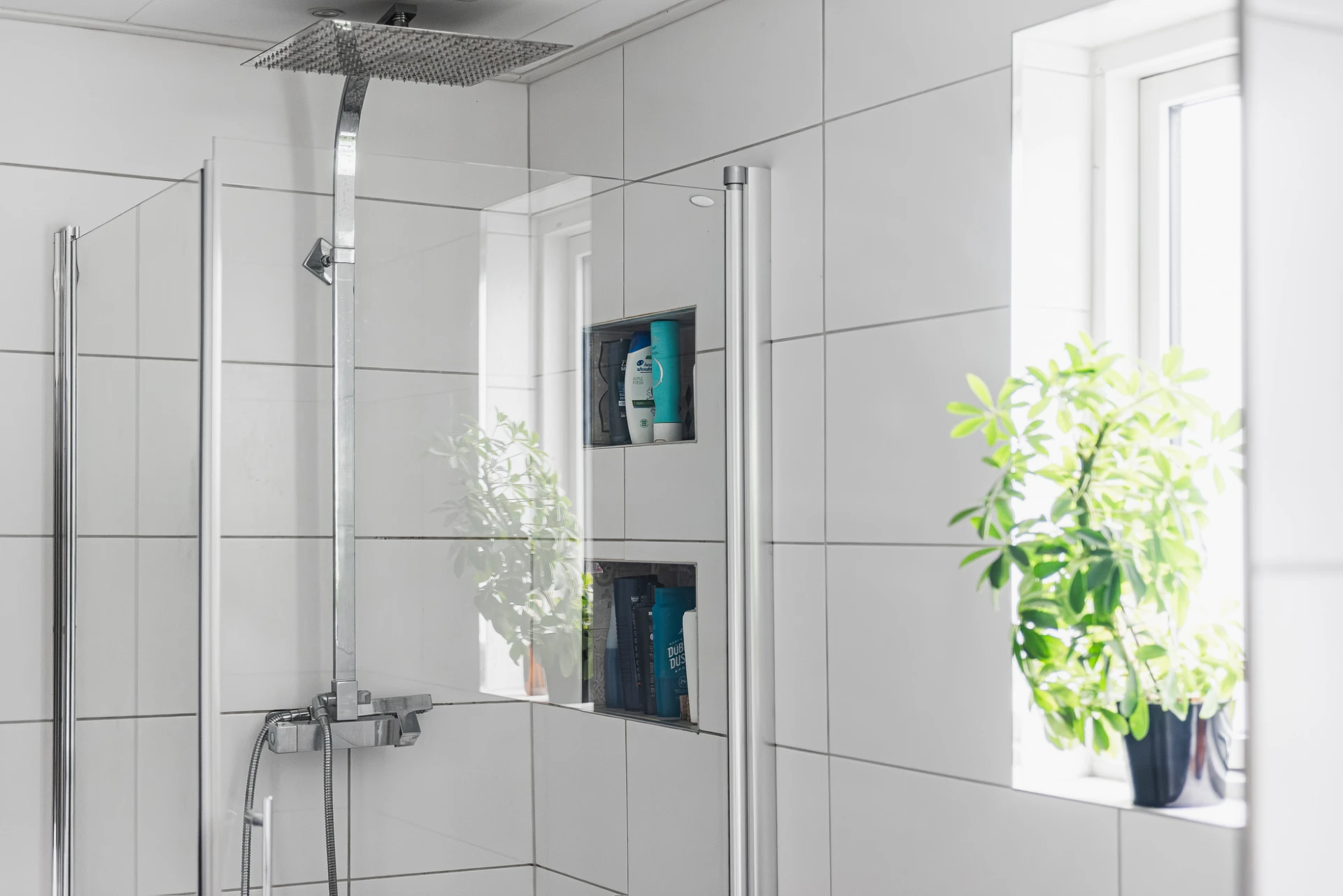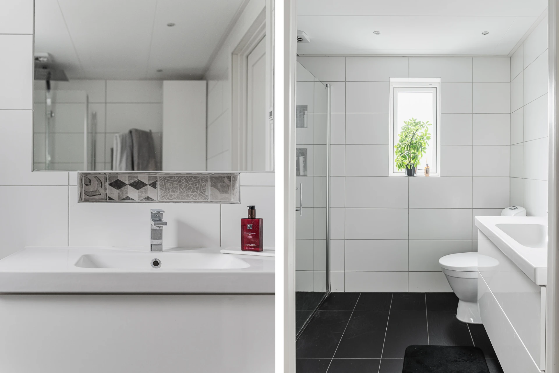 Mörkgrå klinker och vitt kakel. Badrummet är utrustat med WC, dusch, handfat med kommod, spegelskåp och handdukstork.