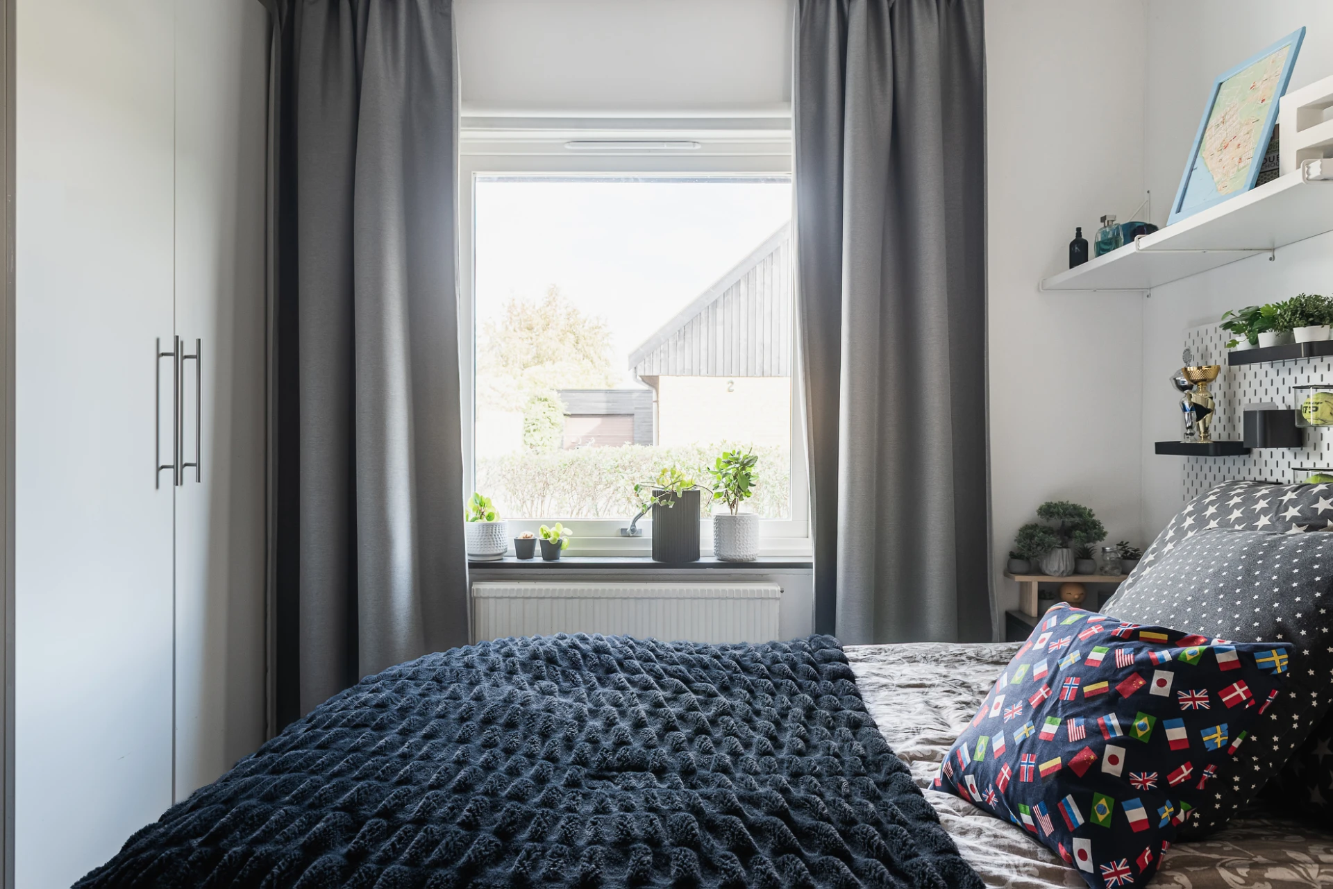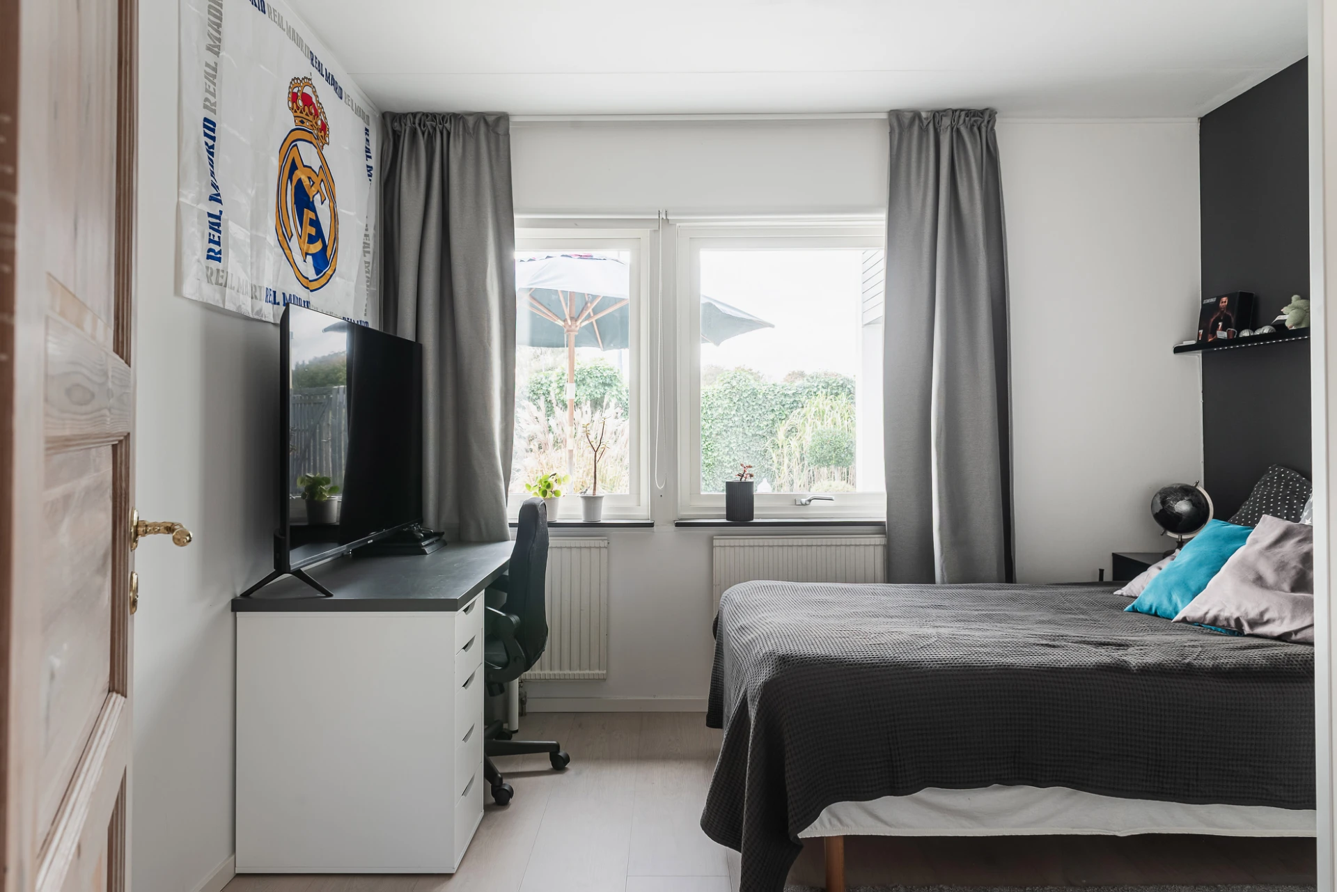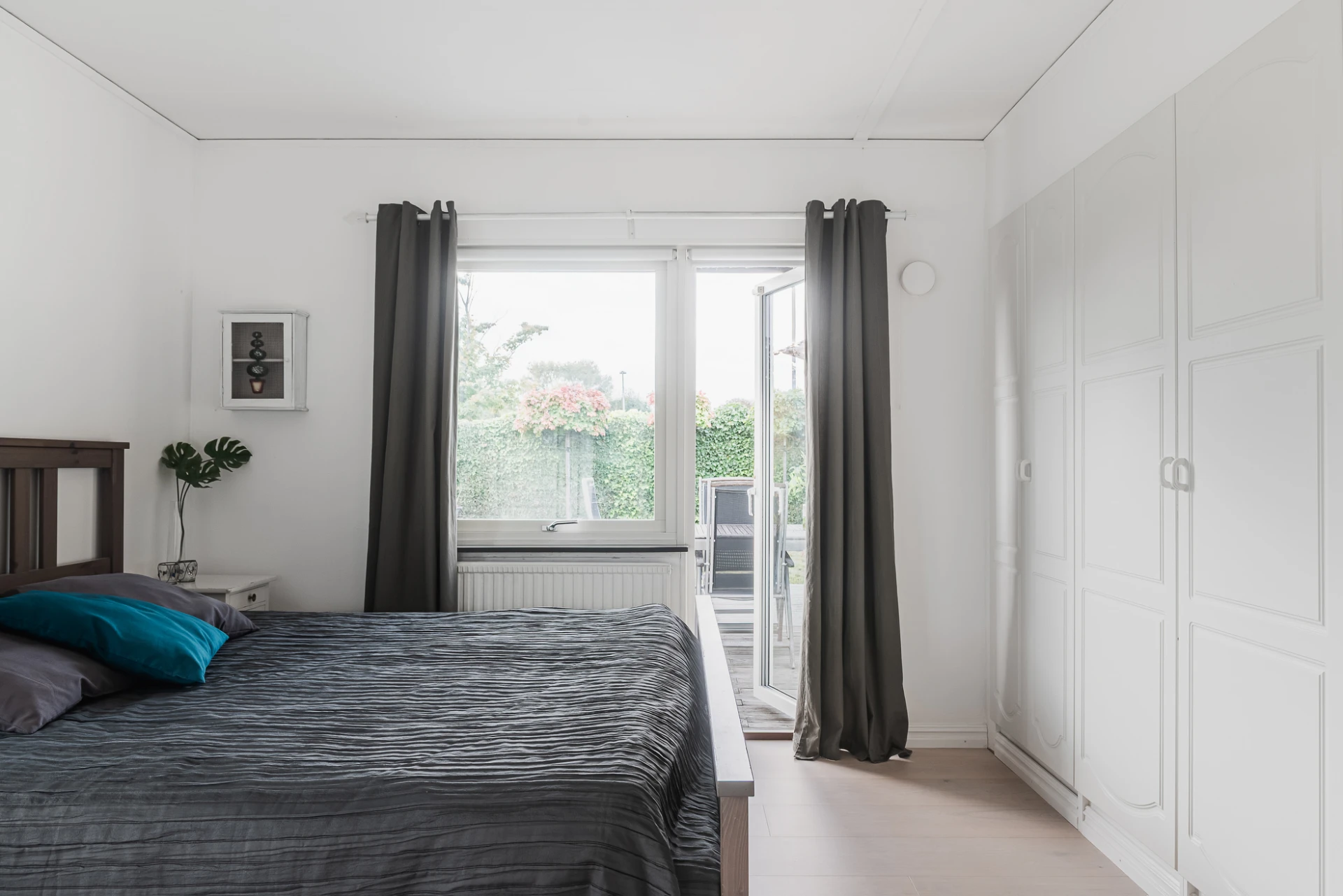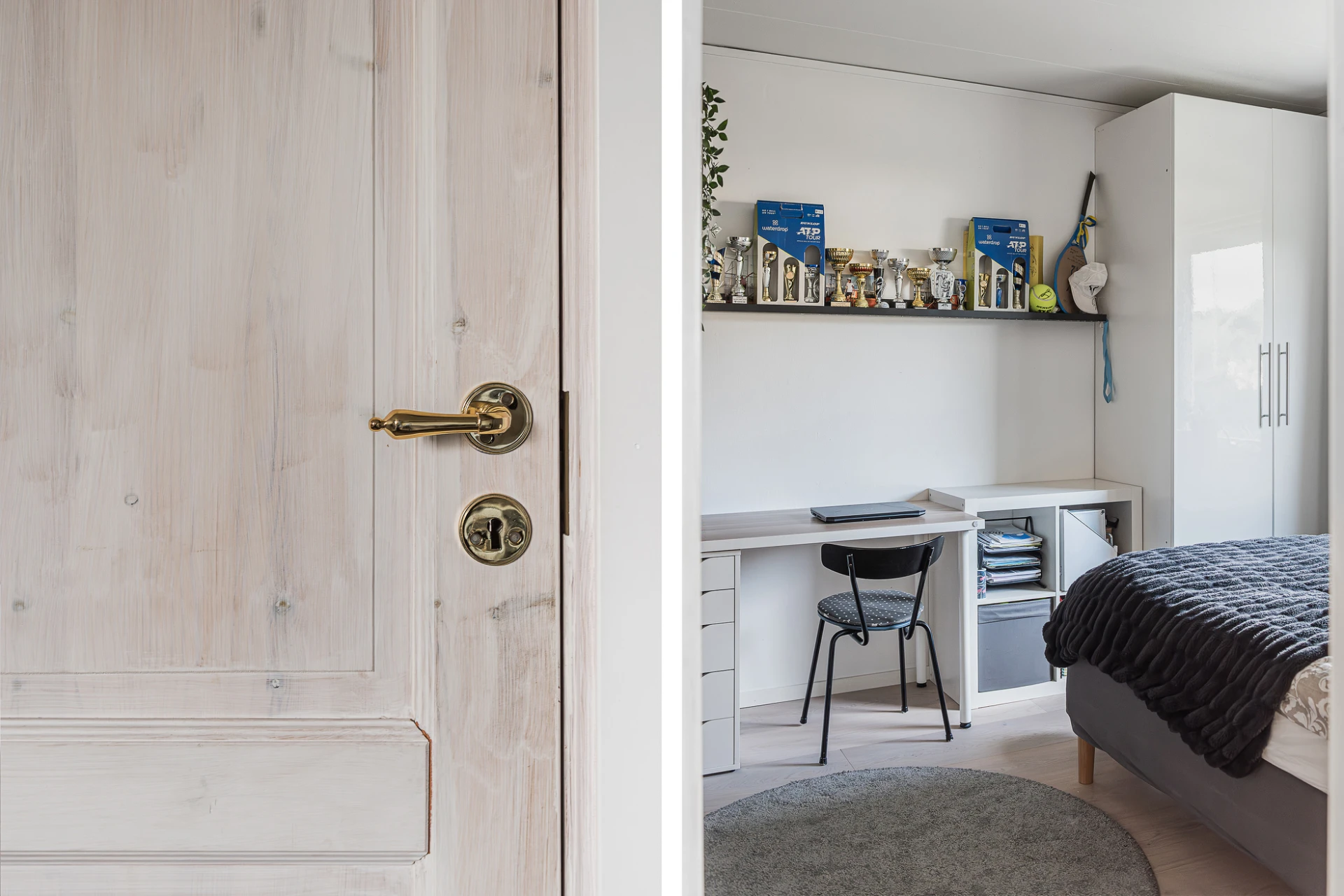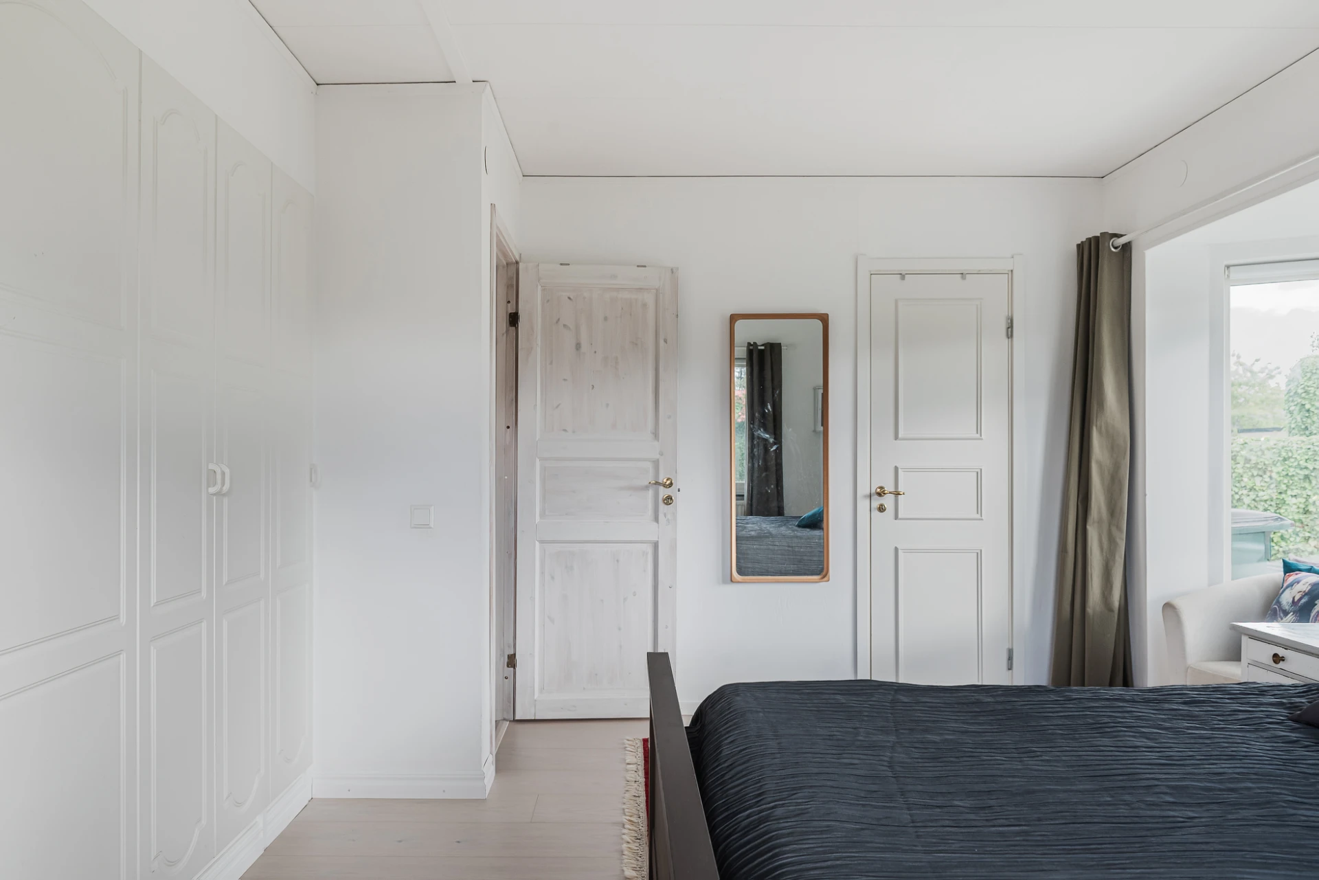 Härdat vitlackat trägolv från Bjelin och väggar målade i vitt. Förvaring i fem garderober och klädkammare med laminatparkett och vit strukturtapet.