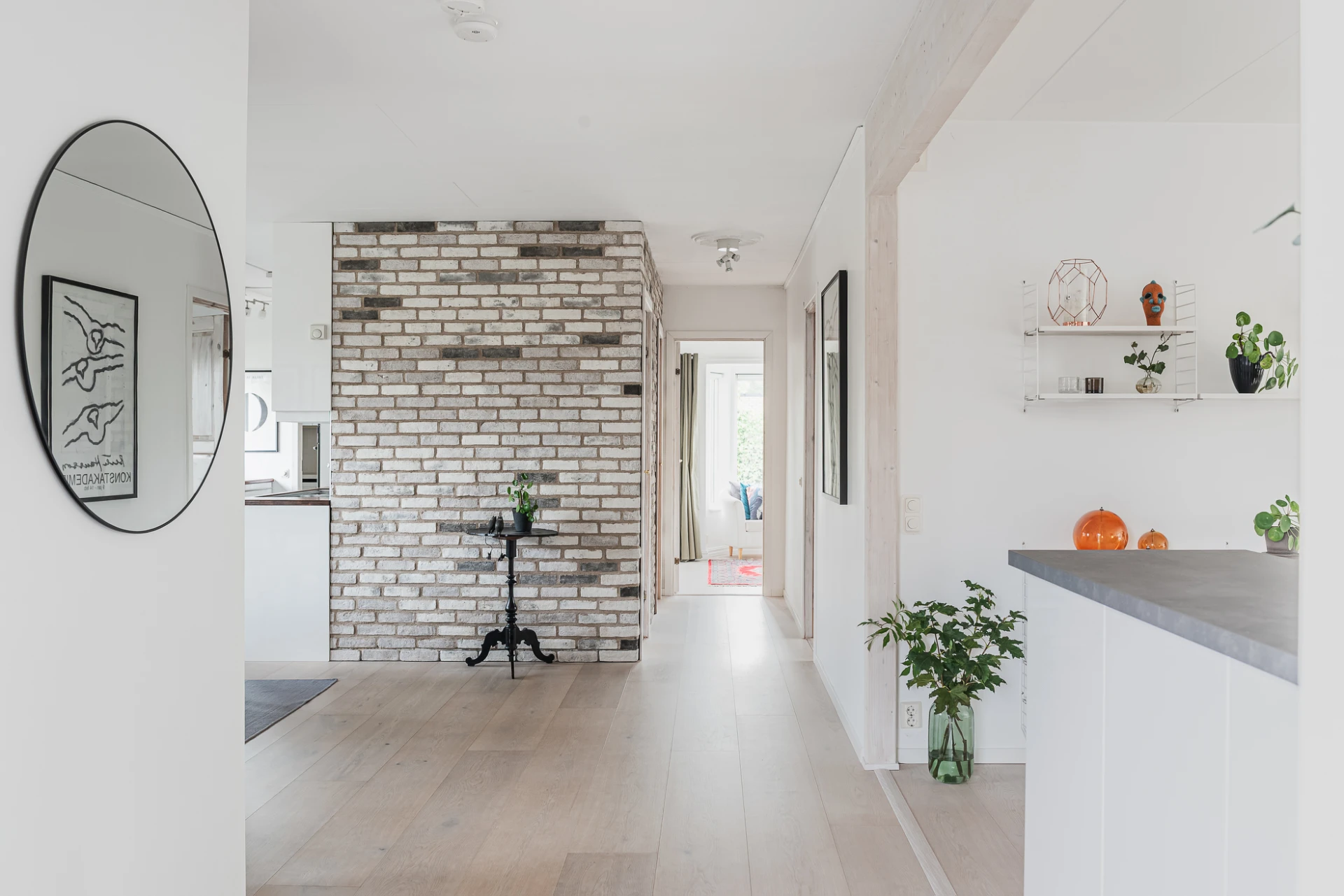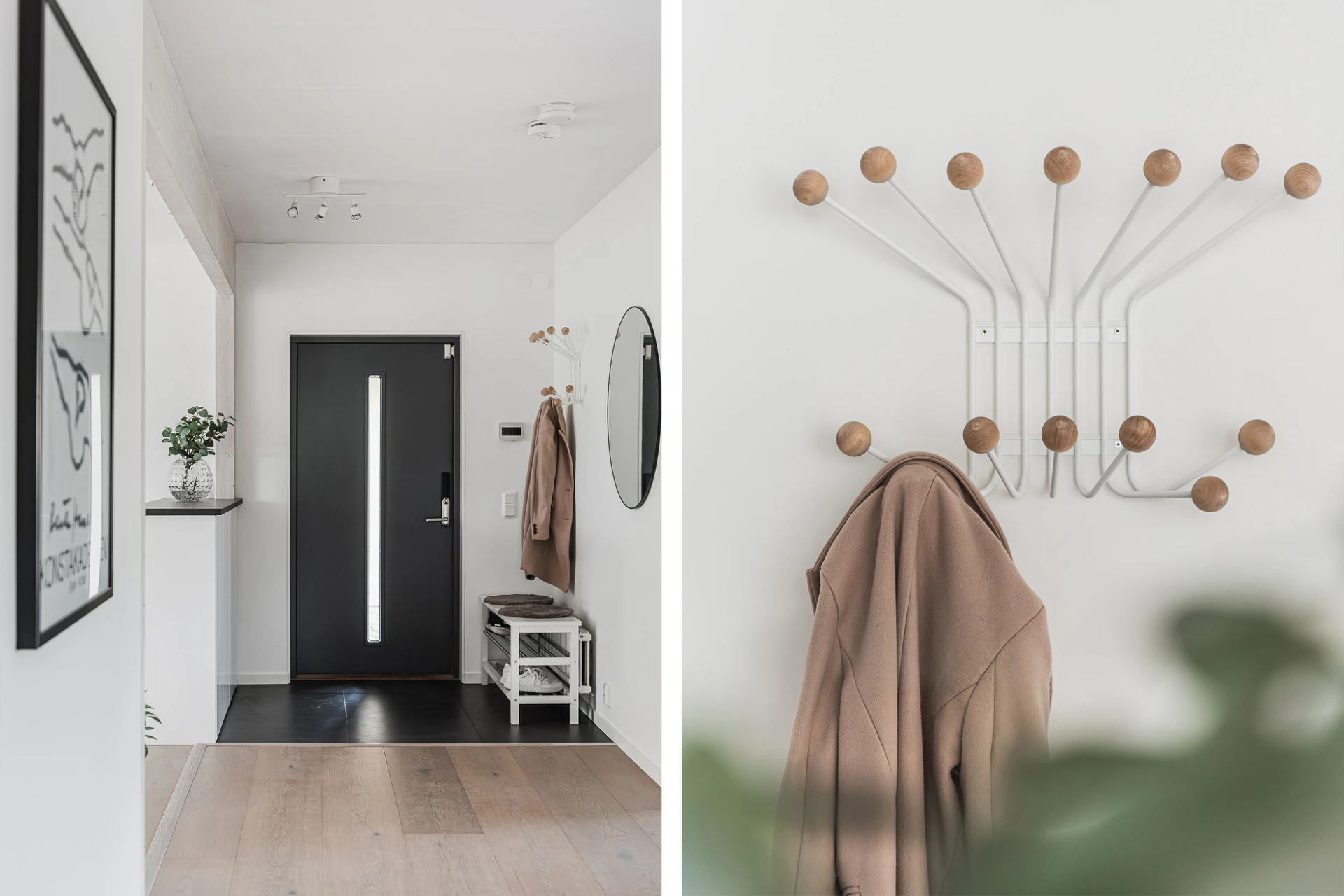 Härdat vitlackat trägolv från Bjelin och mörkgrå klinker, väggar målade i vitt. Förvaring i garderob. Spotlights och säkerhetsdörr.