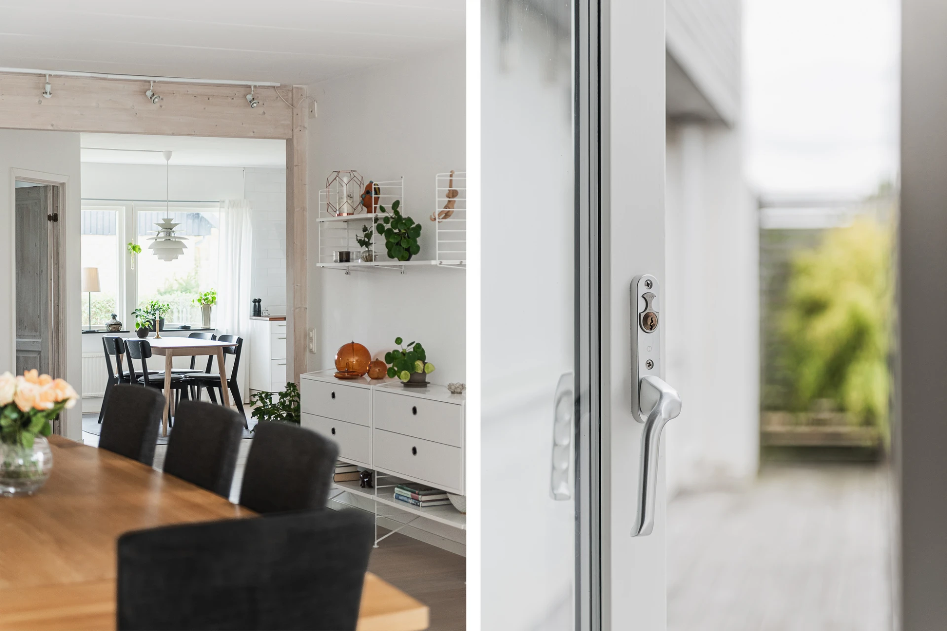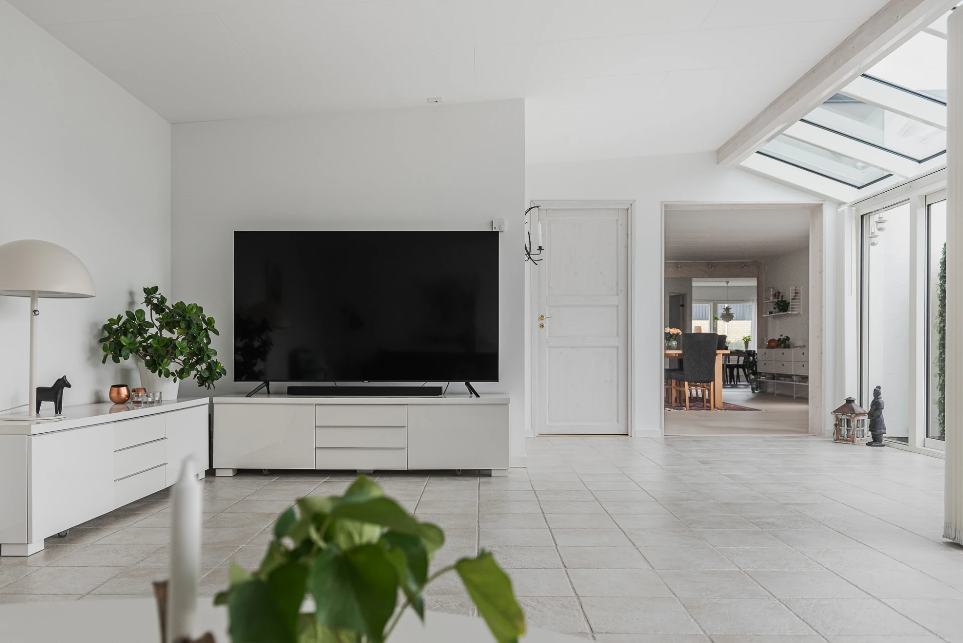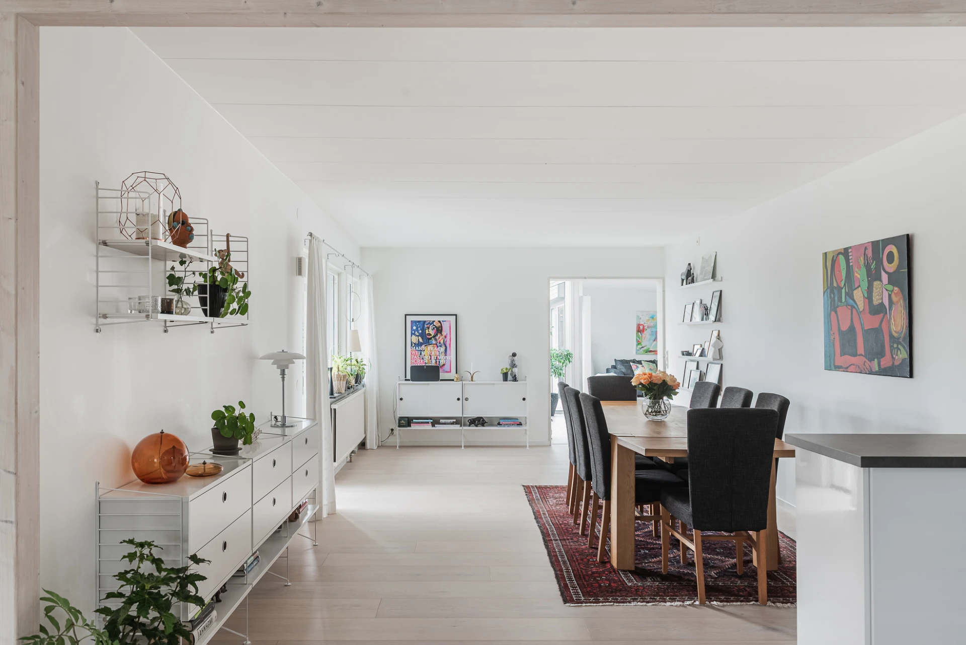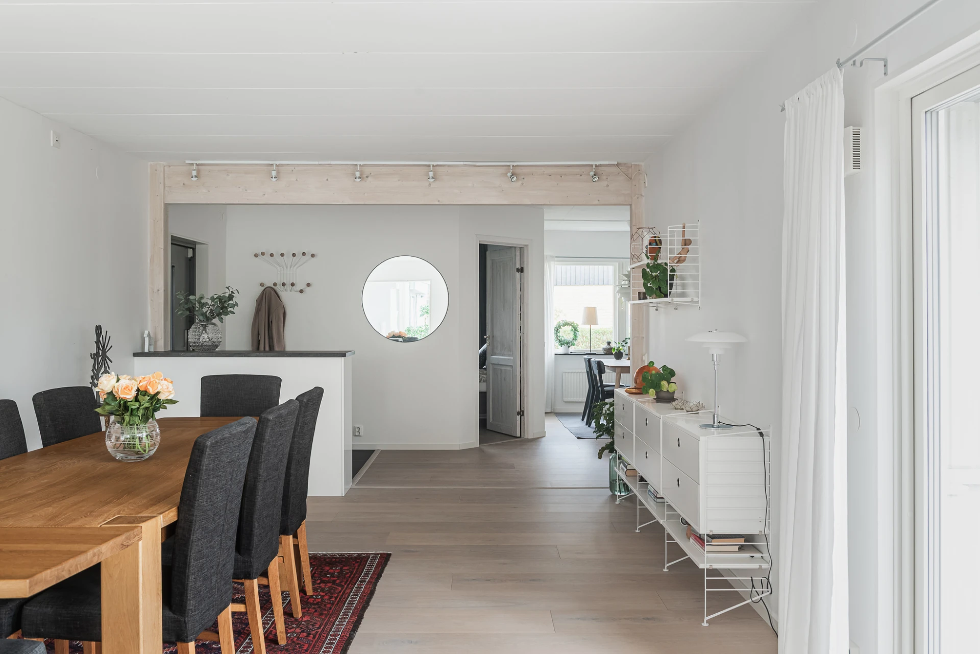 Härdat vitlackat trägolv från Bjelin i matsalsrummet och ljus klinker i allrum, väggar målade i vitt. Stora fönsterpartier med skjutdörrar för utgång till trädgården. Golvvärme (i tillbyggnad) och spotlights med dimmer.