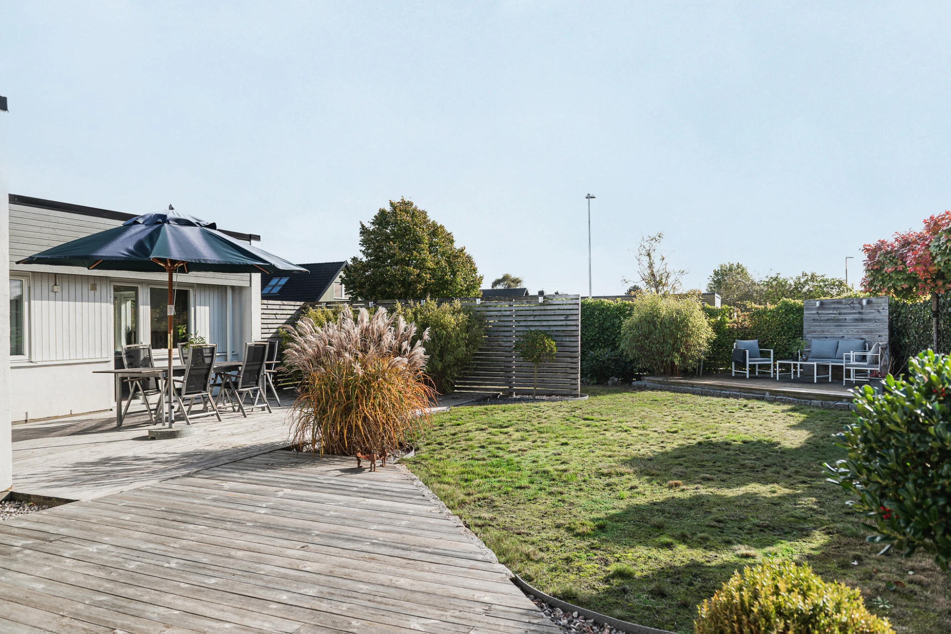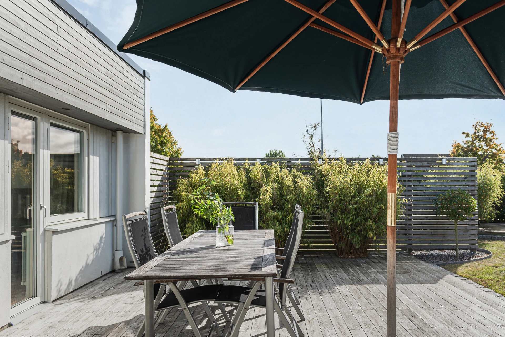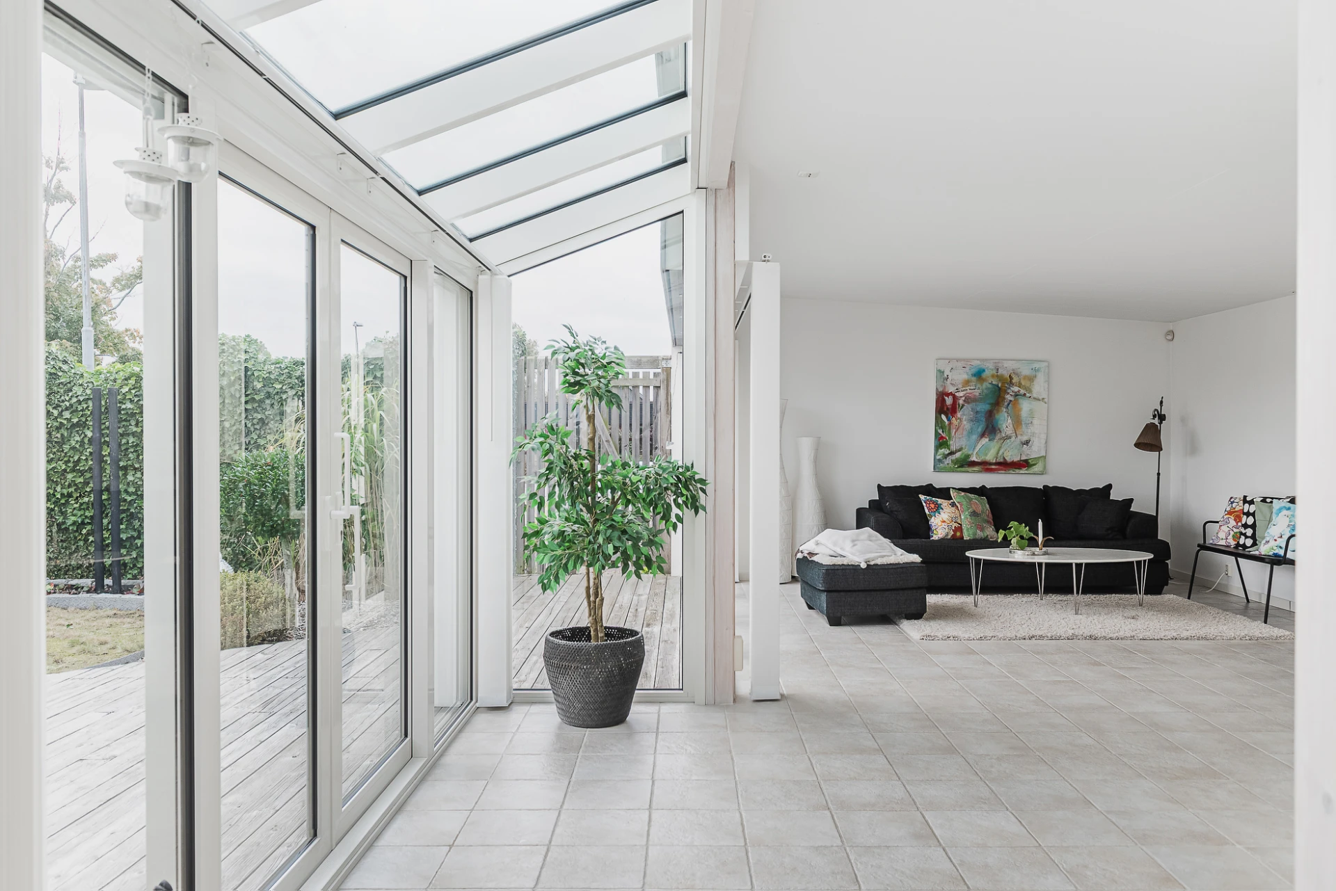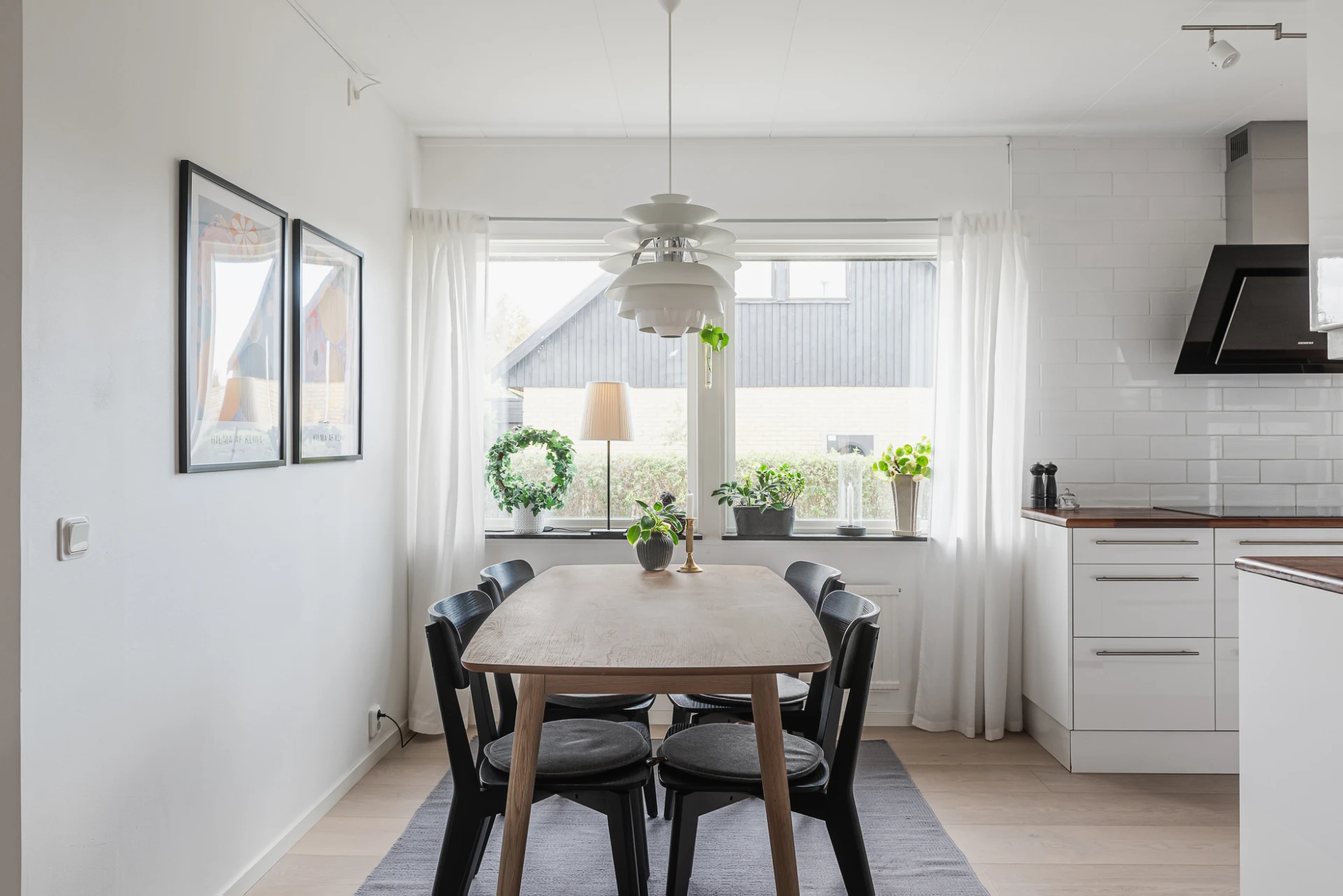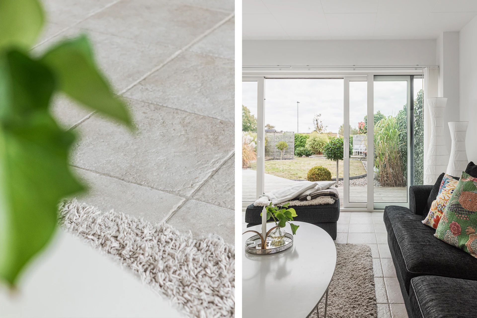 Härdat vitlackat trägolv från Bjelin i matsalsrummet och ljus klinker i allrum, väggar målade i vitt. Stora fönsterpartier med skjutdörrar för utgång till trädgården. Golvvärme (i tillbyggnad) och spotlights med dimmer.