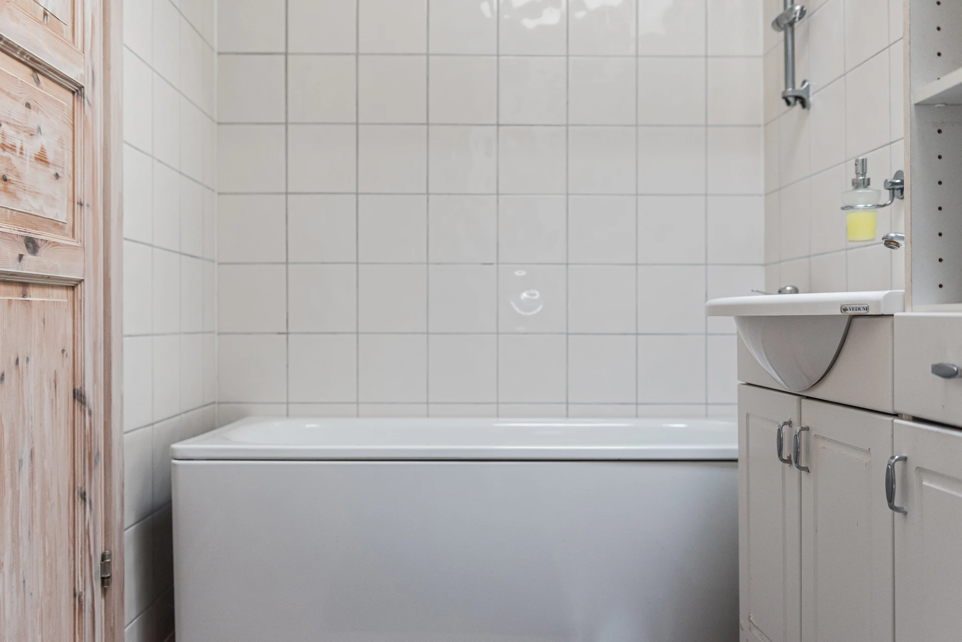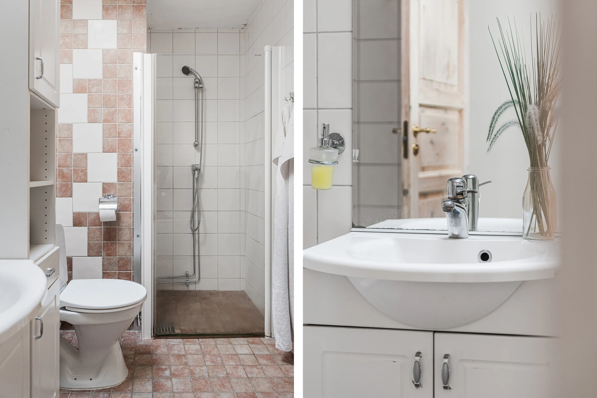 Flerfärgad klinker och flerfärgad samt vitt kakel. Badrummet är utrustat med WC, handfat med kommod, spegel, dusch och badkar.