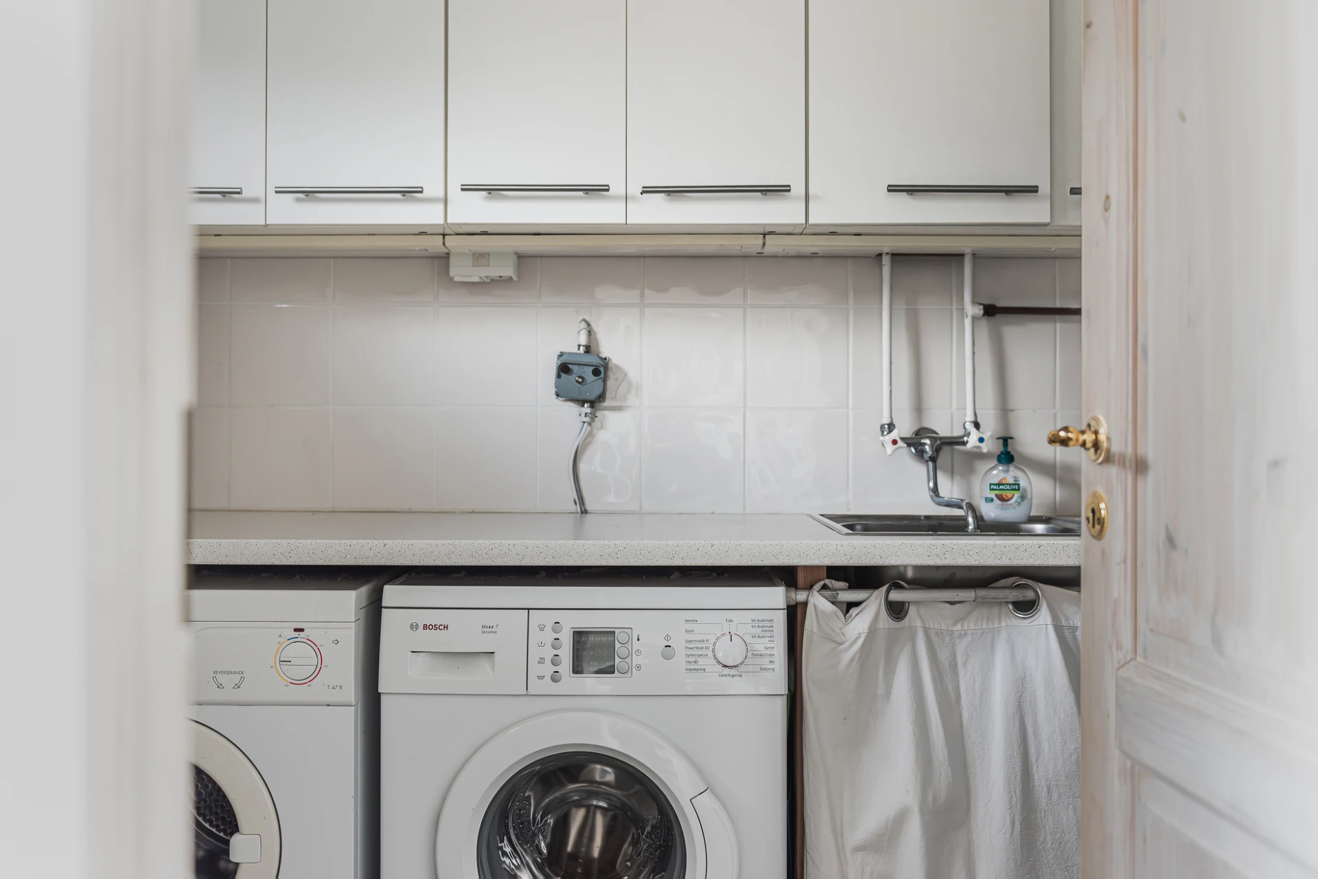 Laminatgolv och väggar delvis kaklade och delvis målade i vitt. Tvättstugan är utrustad med tvättmaskin (Bosch, 2010), torktumlare, arbetsbänk och överskåp.
