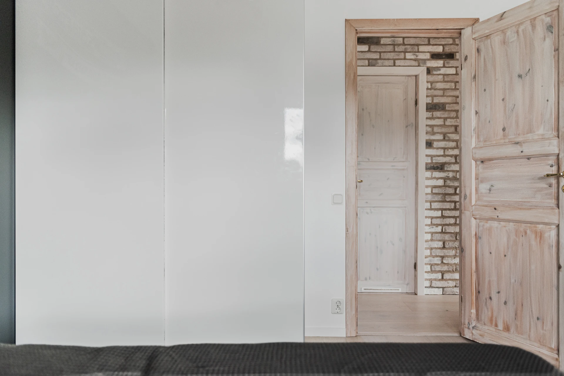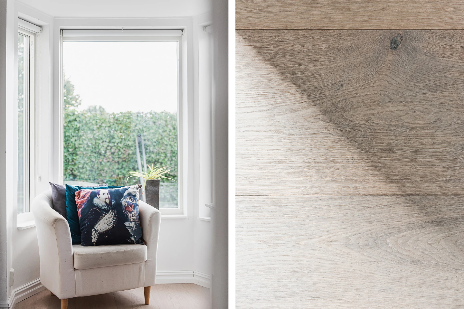 Härdat vitlackat trägolv från Bjelin och väggar målade i vitt. Förvaring i garderob.