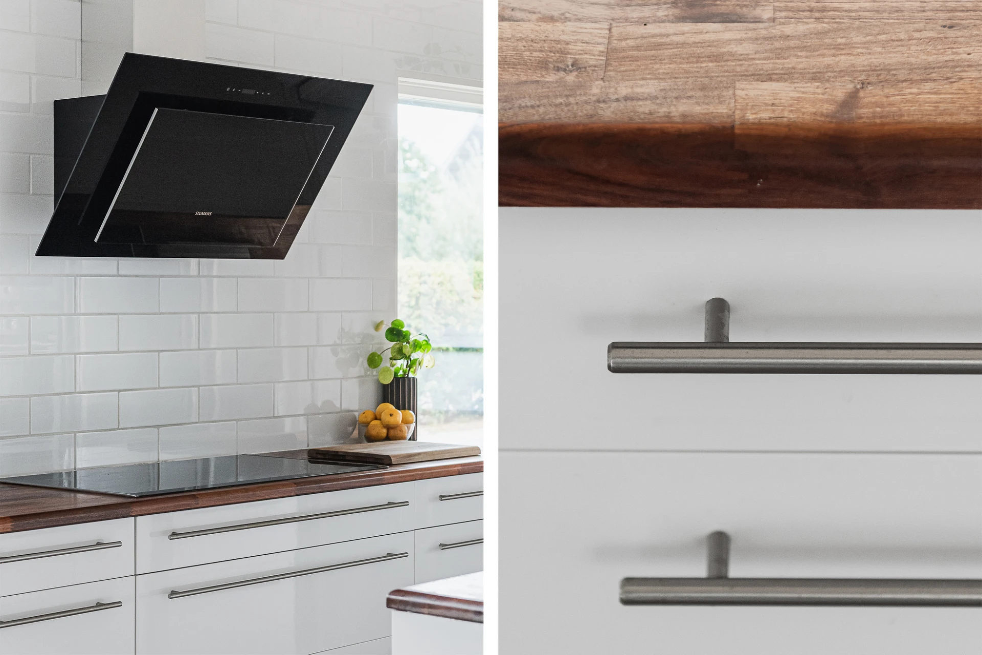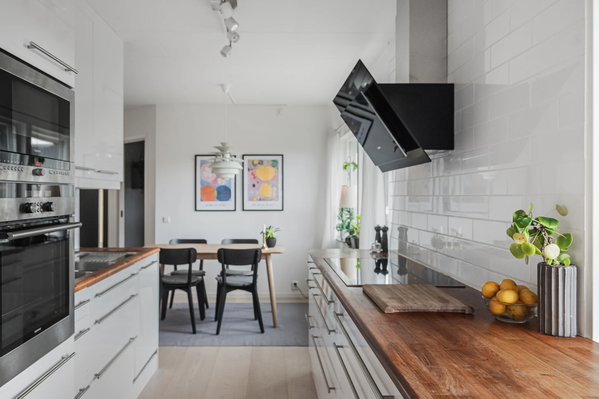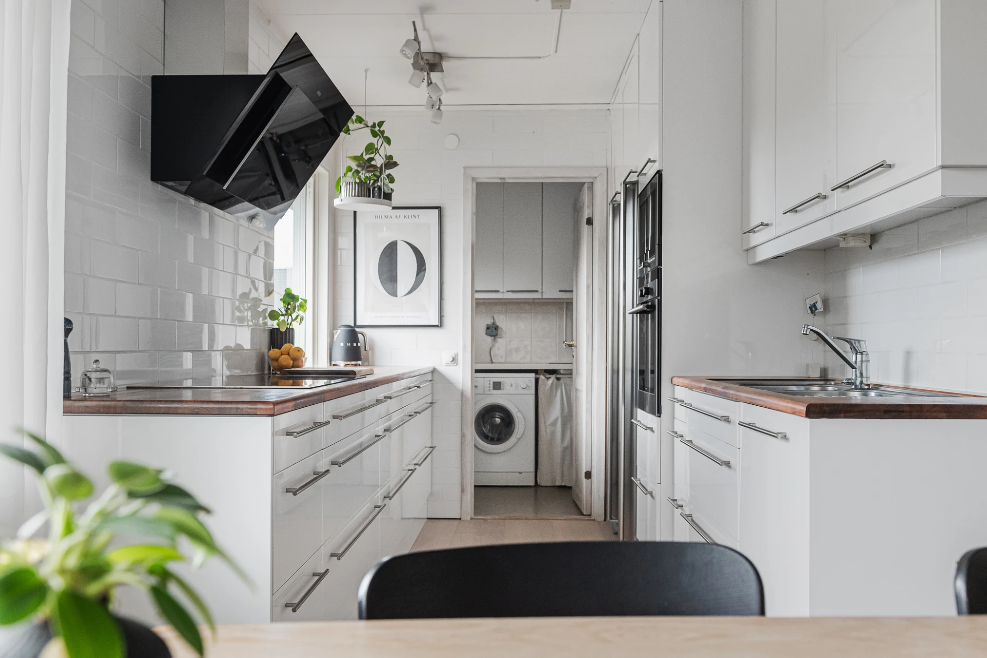 Härdat vitlackat trägolv från Bjelin och väggar målade i vitt. Köksinredning från NordDesign Kök i vitt, bänkskiva i trä och rostfritt stål, stänkskydd i vitt kakel. Köket är utrustat med kyl/ frys (Husqvarna, 2013), induktionshäll, inbyggd ugn, inbyggd mikro, diskmaskin (Siemens, 2009) och fläkt (Siemens, 2022). Matplats för cirka 4 personer.