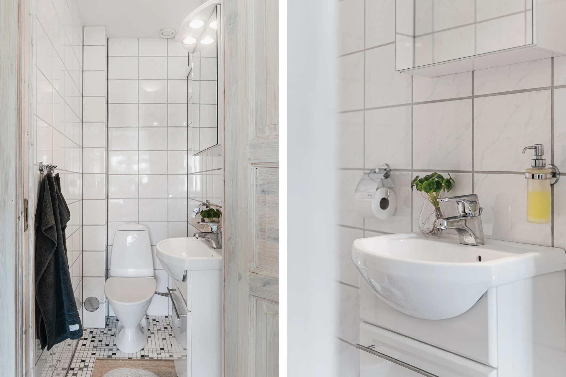Vit klinker och kakel. Badrummet är utrustat med WC, handfat med kommod och spegelskåp.