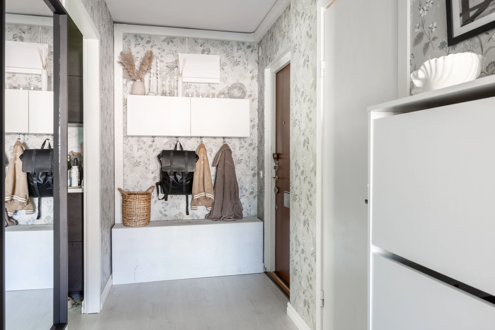 Laminatgolv och tapeter på väggarna. Här finns plats för avhängning och två hyllskåp för förvaring.