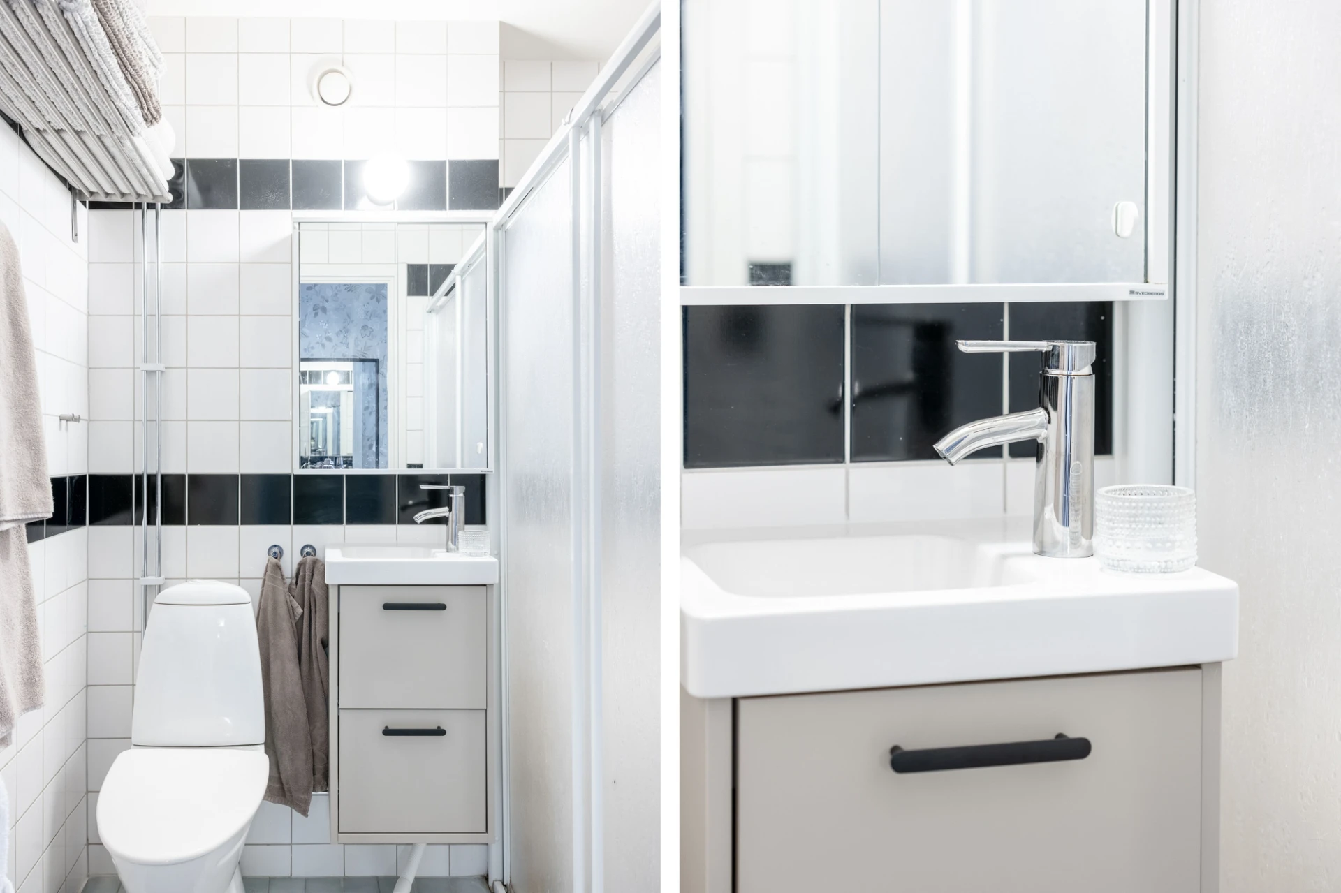 Ljus klinker och vitt/svart kakel. Badrummet är utrustat med WC, handfat, kommodskåp, spegelskåp, dusch och vägghylla.