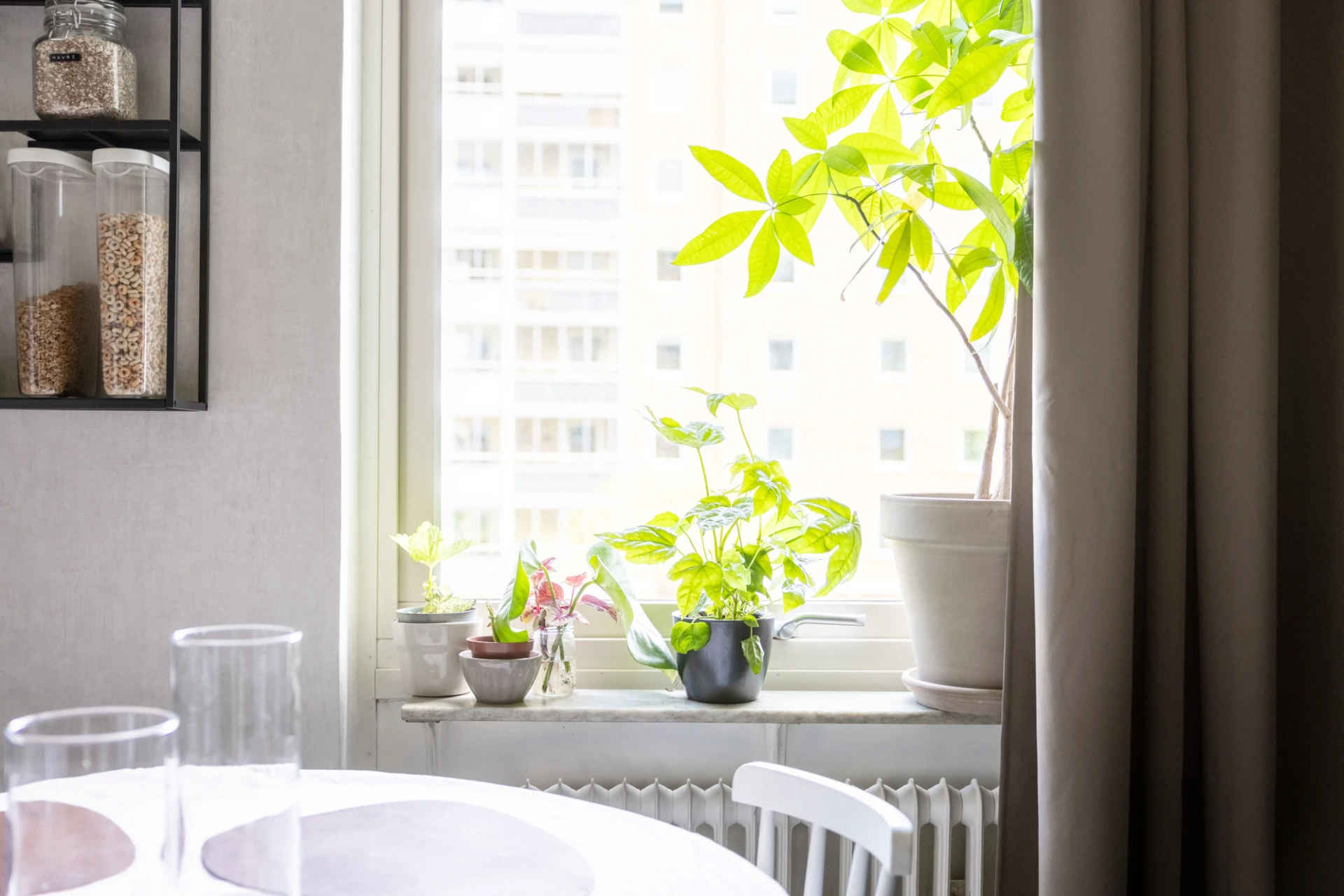 Laminatgolv och beiga väggar. Fönsterbräda i sten.