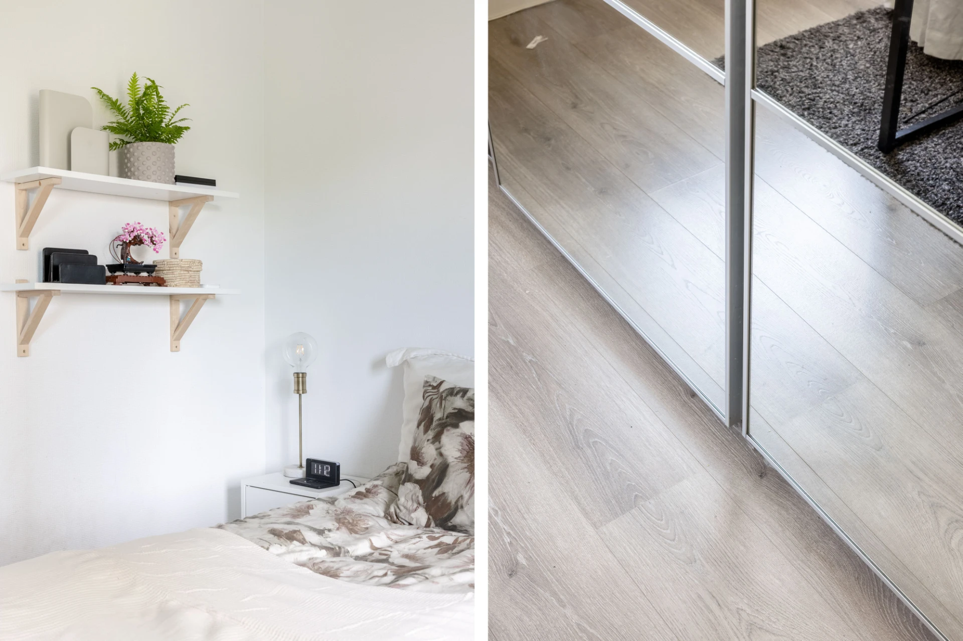 Laminatgolv och vita väggar. Här finns även en garderob med skjutdörrar samt fönsterbräda i sten.