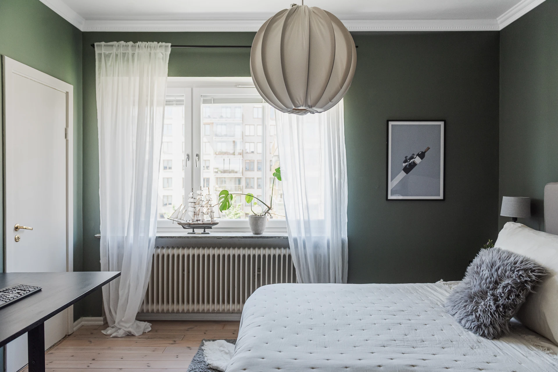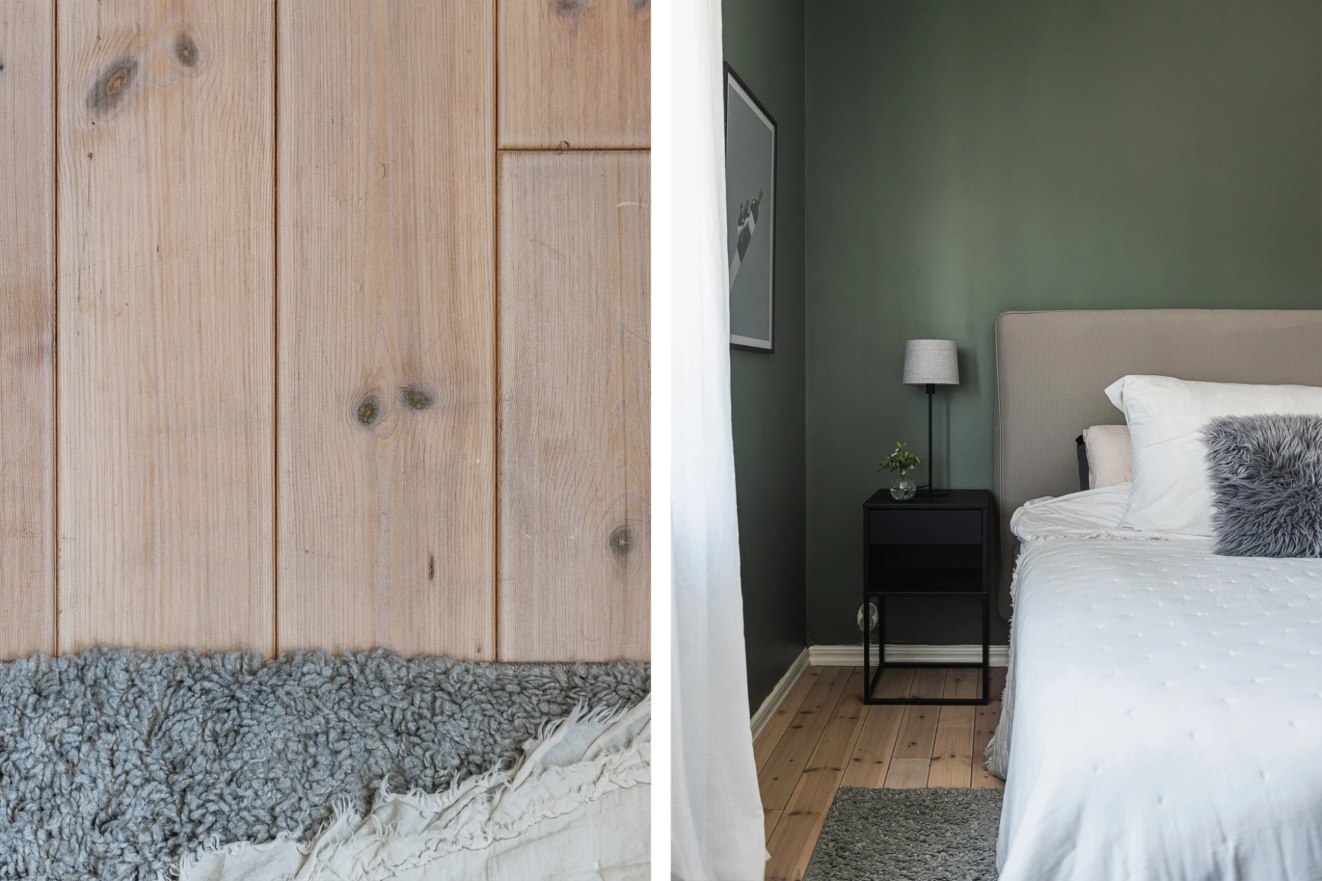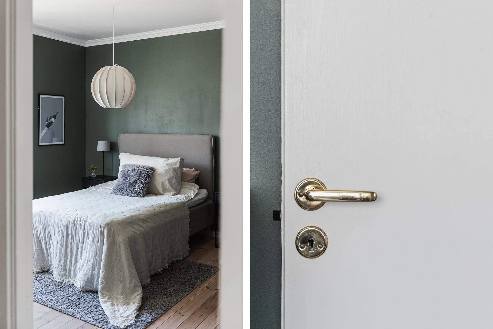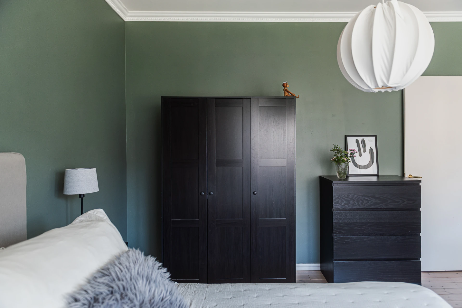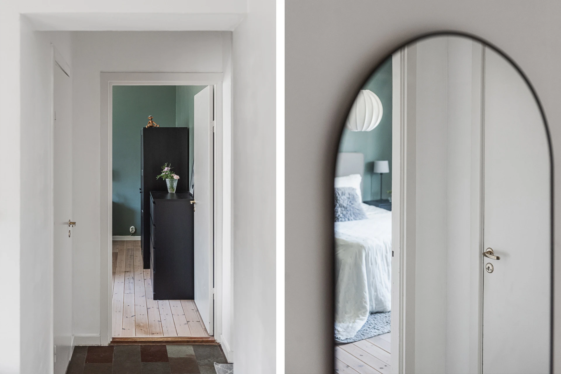 Brädgolv och gröna väggar. Förvaring i inbyggd garderob.