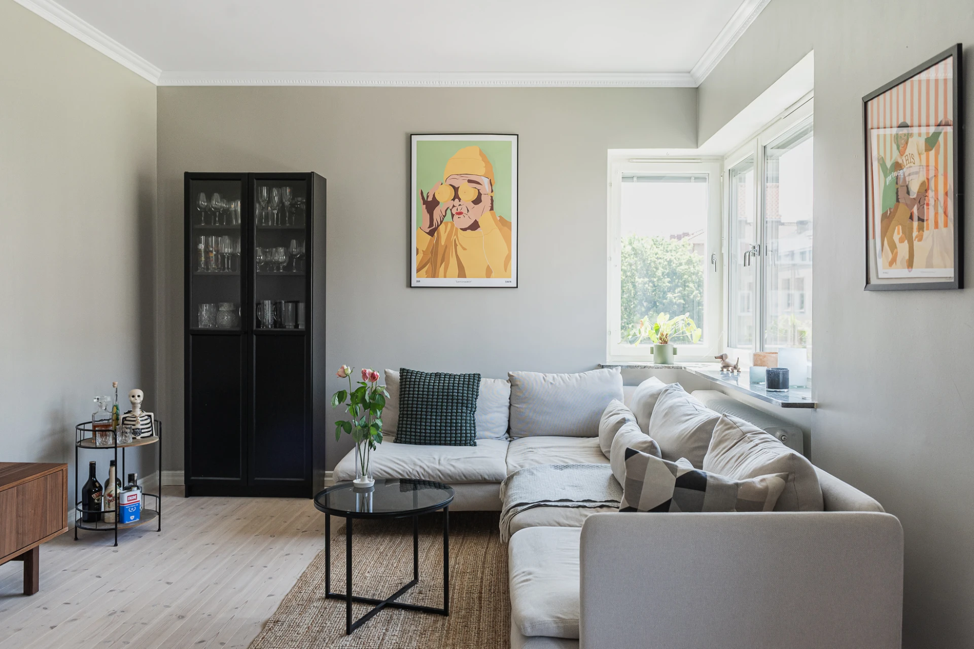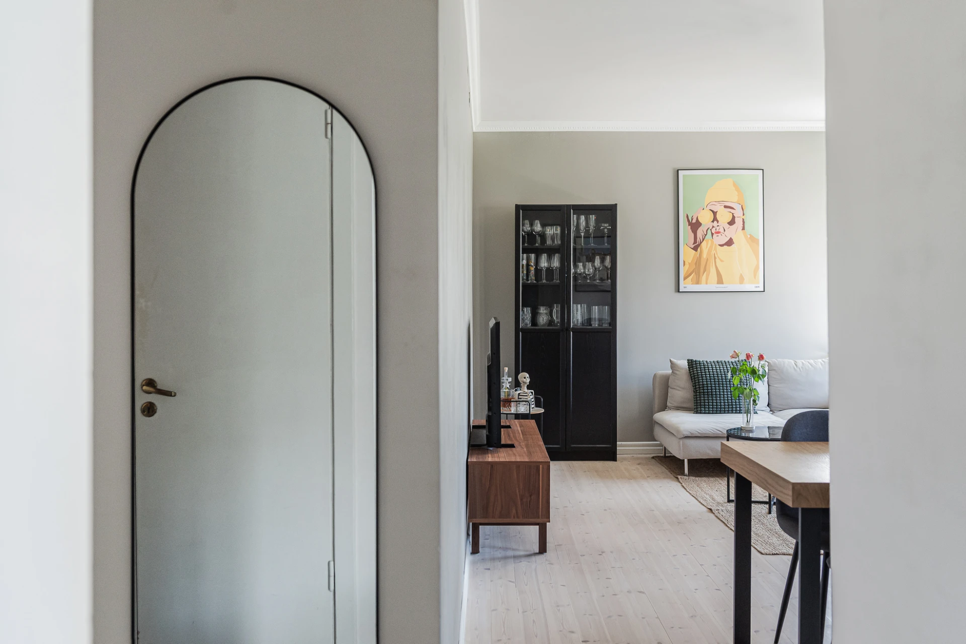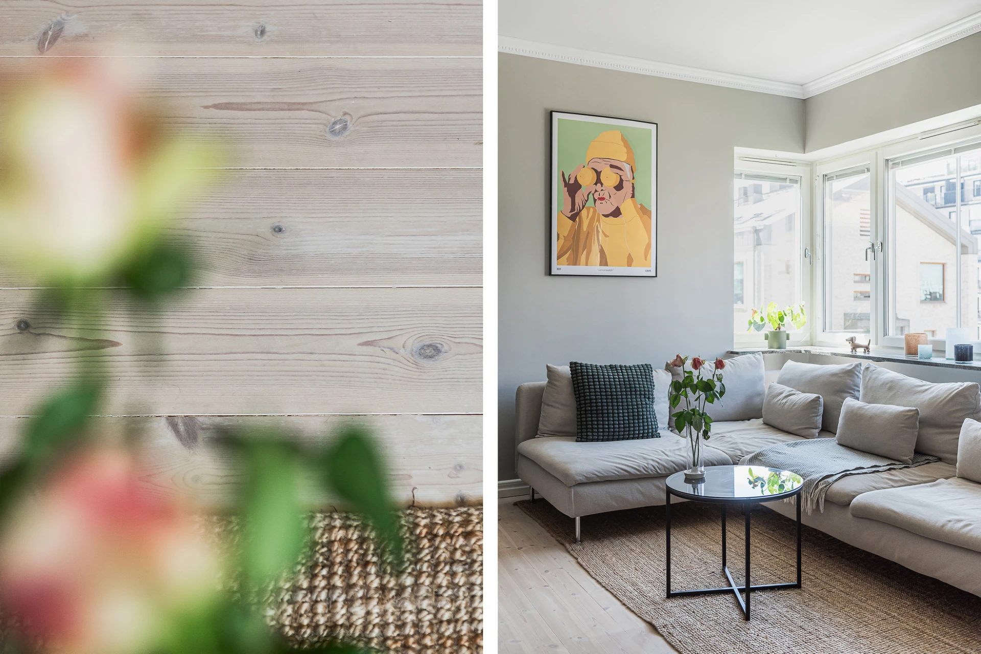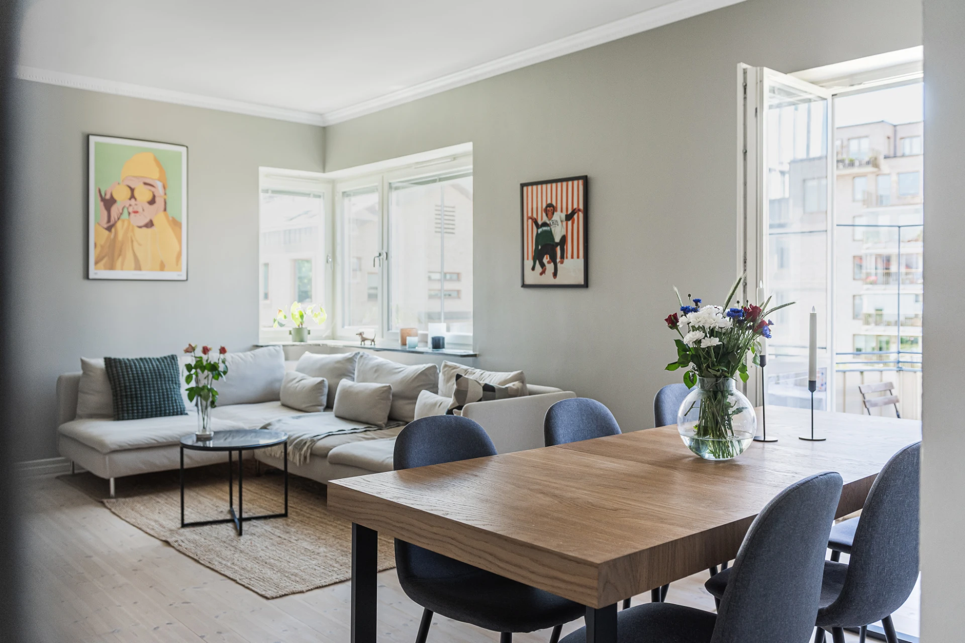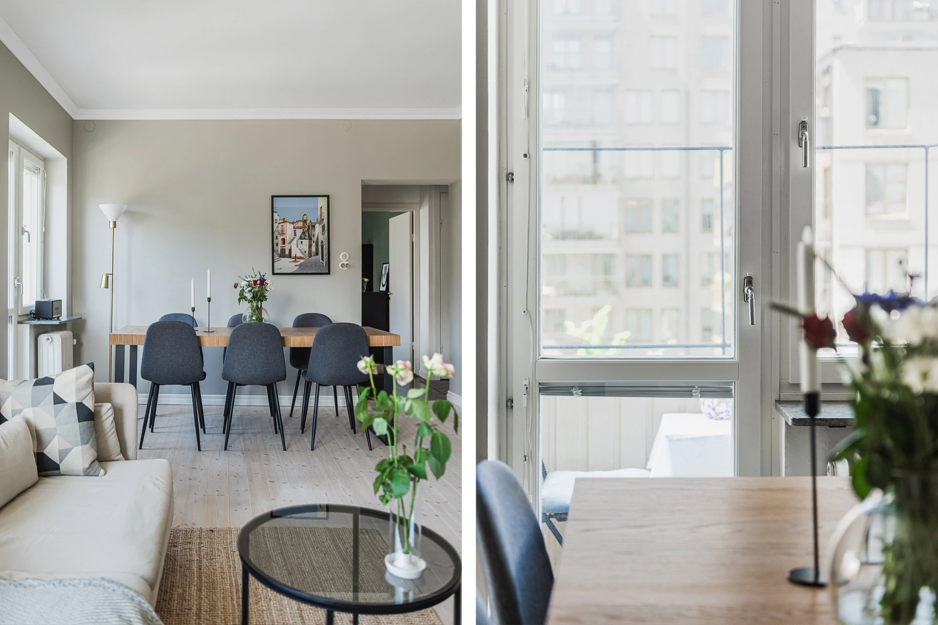 Brädgolv och gråa väggar. Utgång till balkong i västerläge.