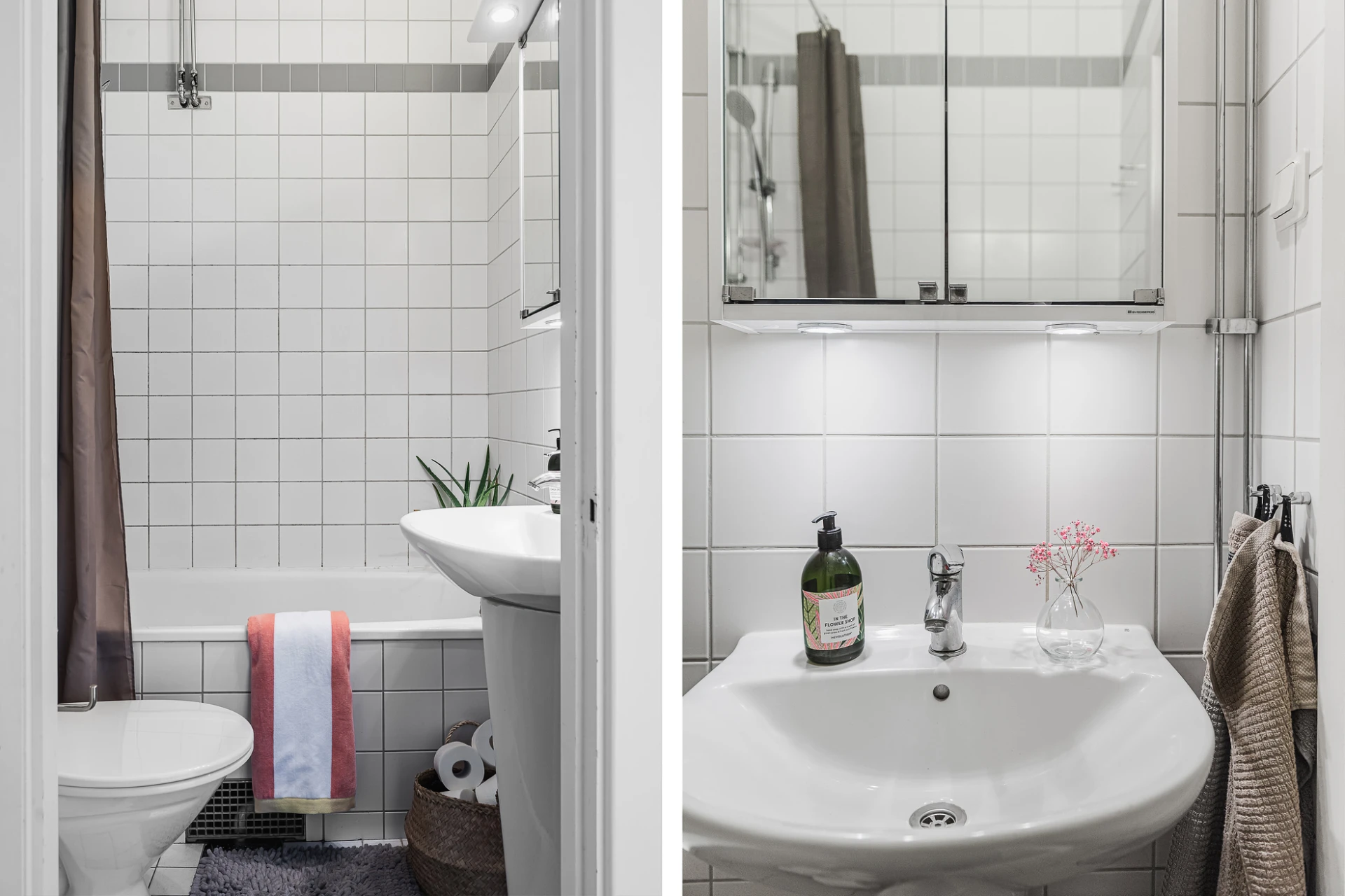 Vit klinker och vitt kakel. Badrummet är inrett med wc, handfat, spegelskåp med infällda spotlights och inkaklat badkar.