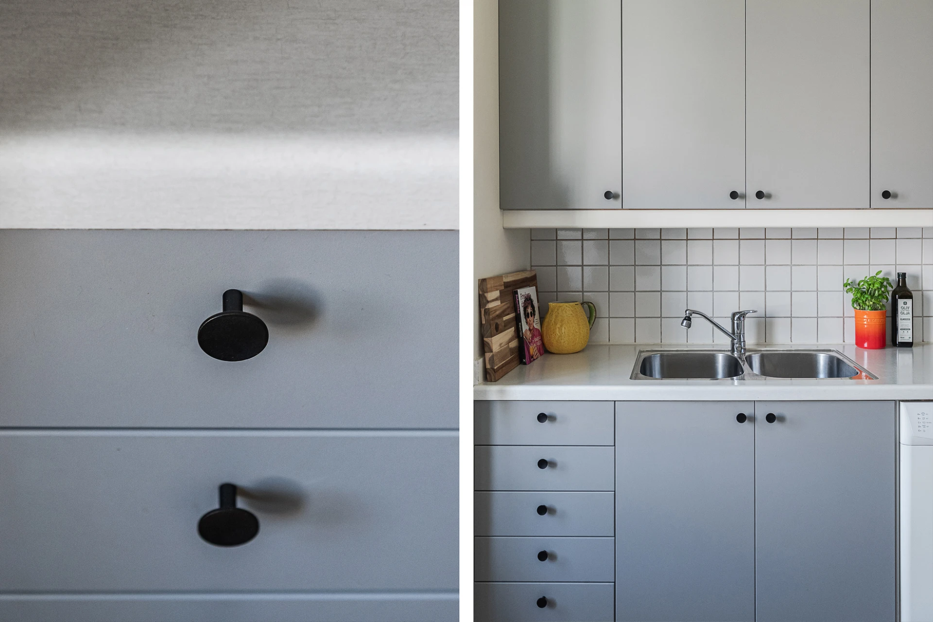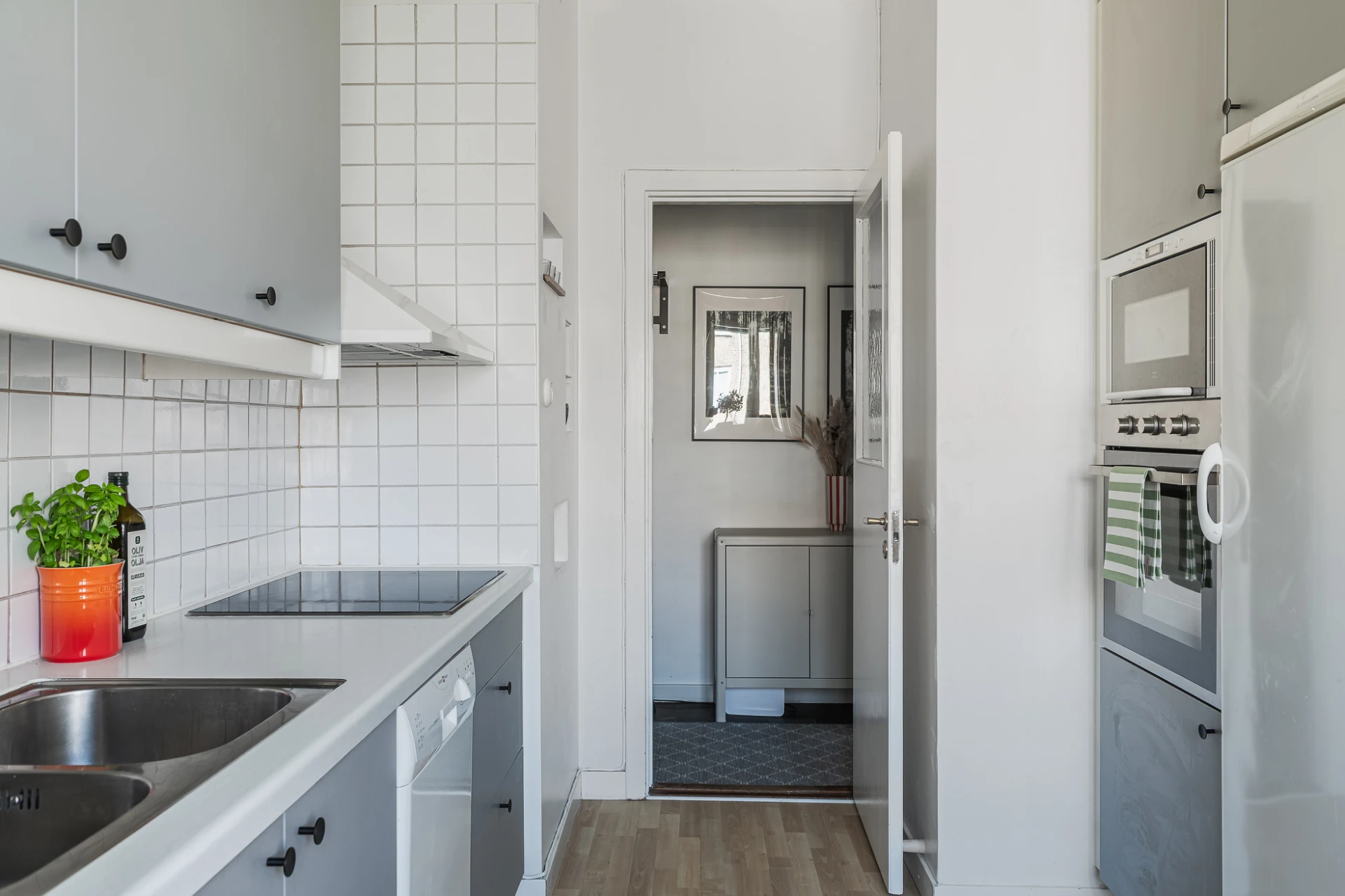 Parkettgolv och vita väggar. Grå köksinredning från Härjedalskök med vitt kakel ovan ljus arbetsbänk i laminat. Kyl och frys, induktionshäll, inbyggd ugn och mikrovågsugn, fläkt samt diskmaskin.