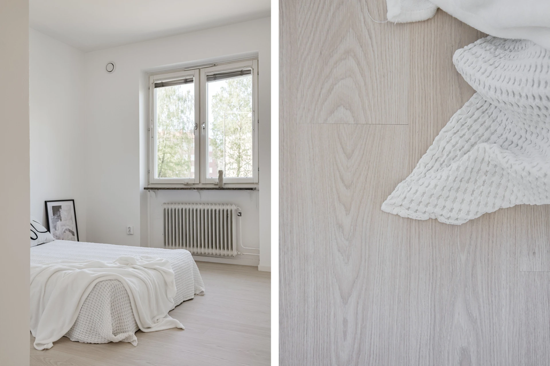 Laminatgolv och ljusa, målade väggar. Förvaring i skjutdörrsgarderob. Spotlights med dimmer.