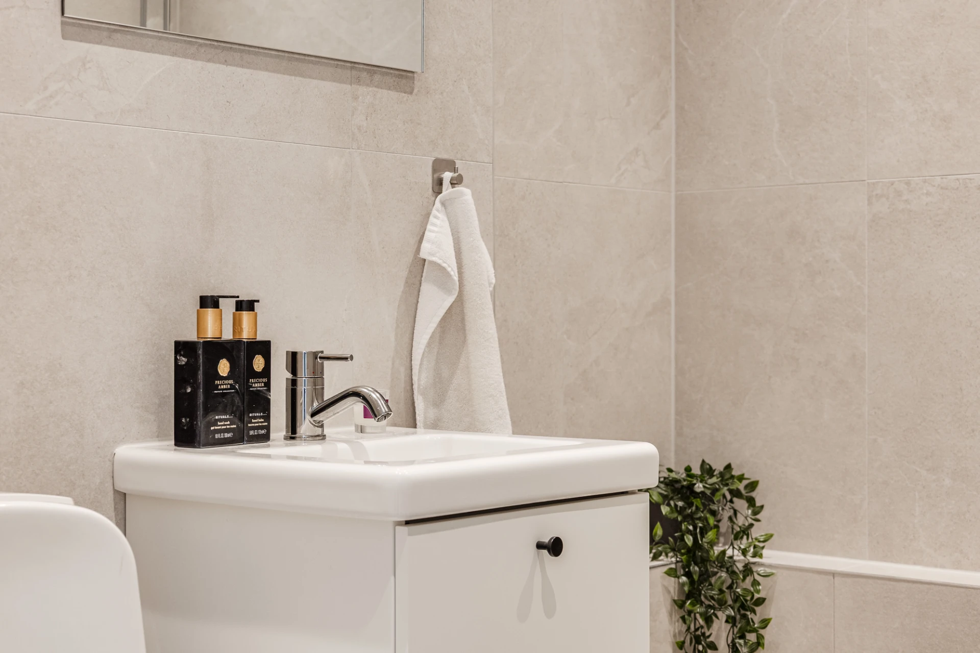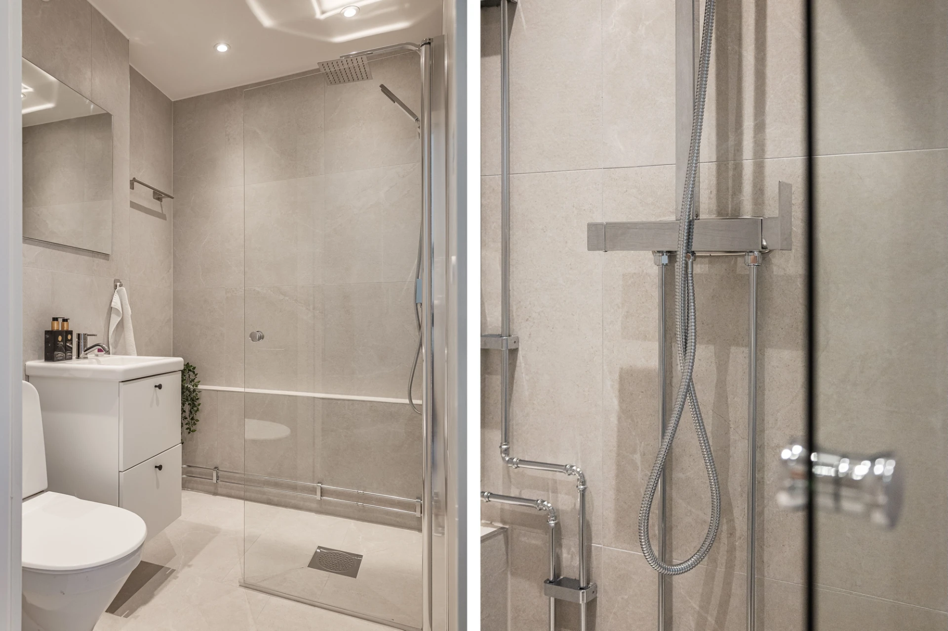Ljust klinker och kakel. Badrummet är utrustat med WC, spegel, dusch och handfat med kommod. Golvvärme och spotlights med dimmer.