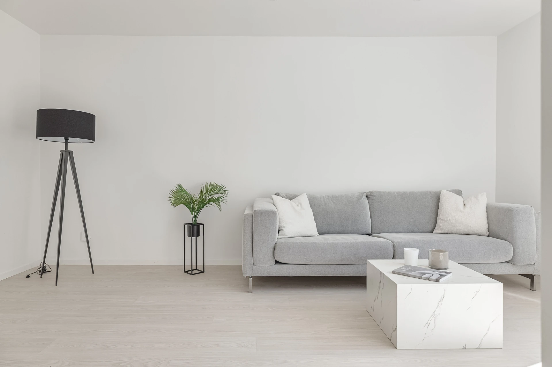 Laminatgolv och ljusa, målade väggar. Spotlights med dimmer.