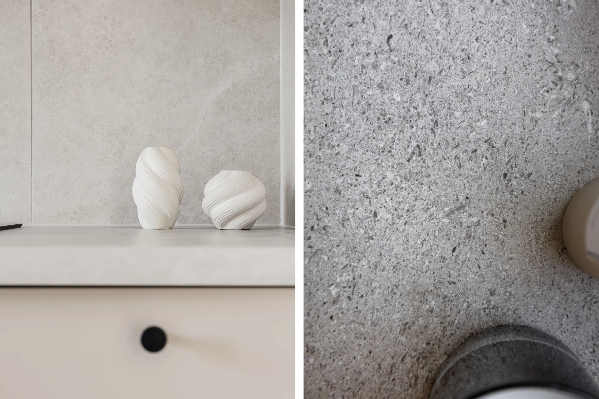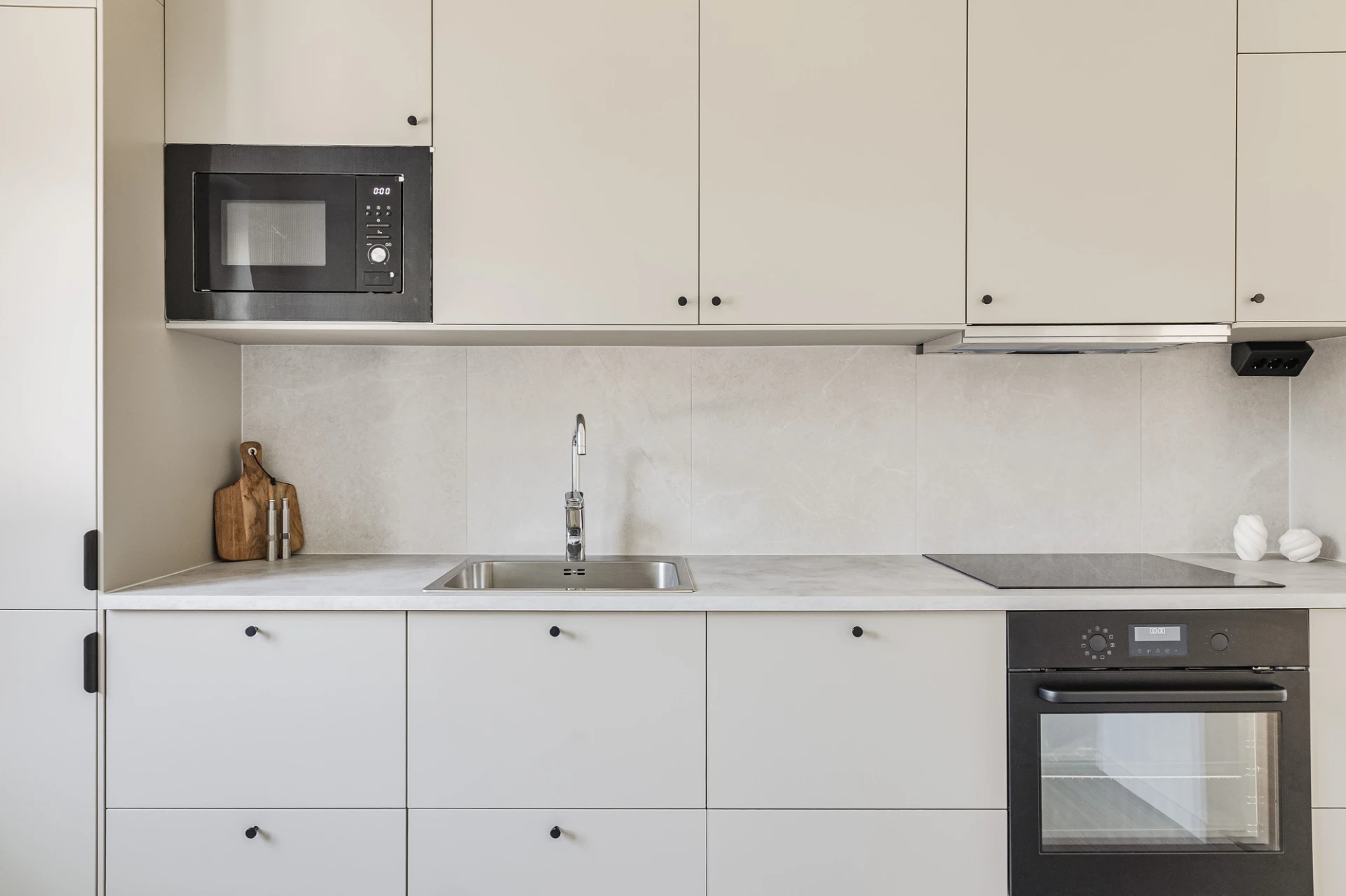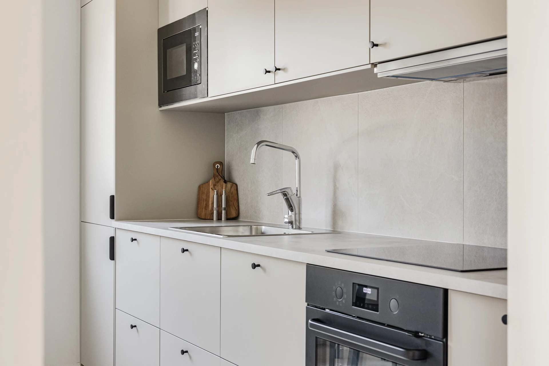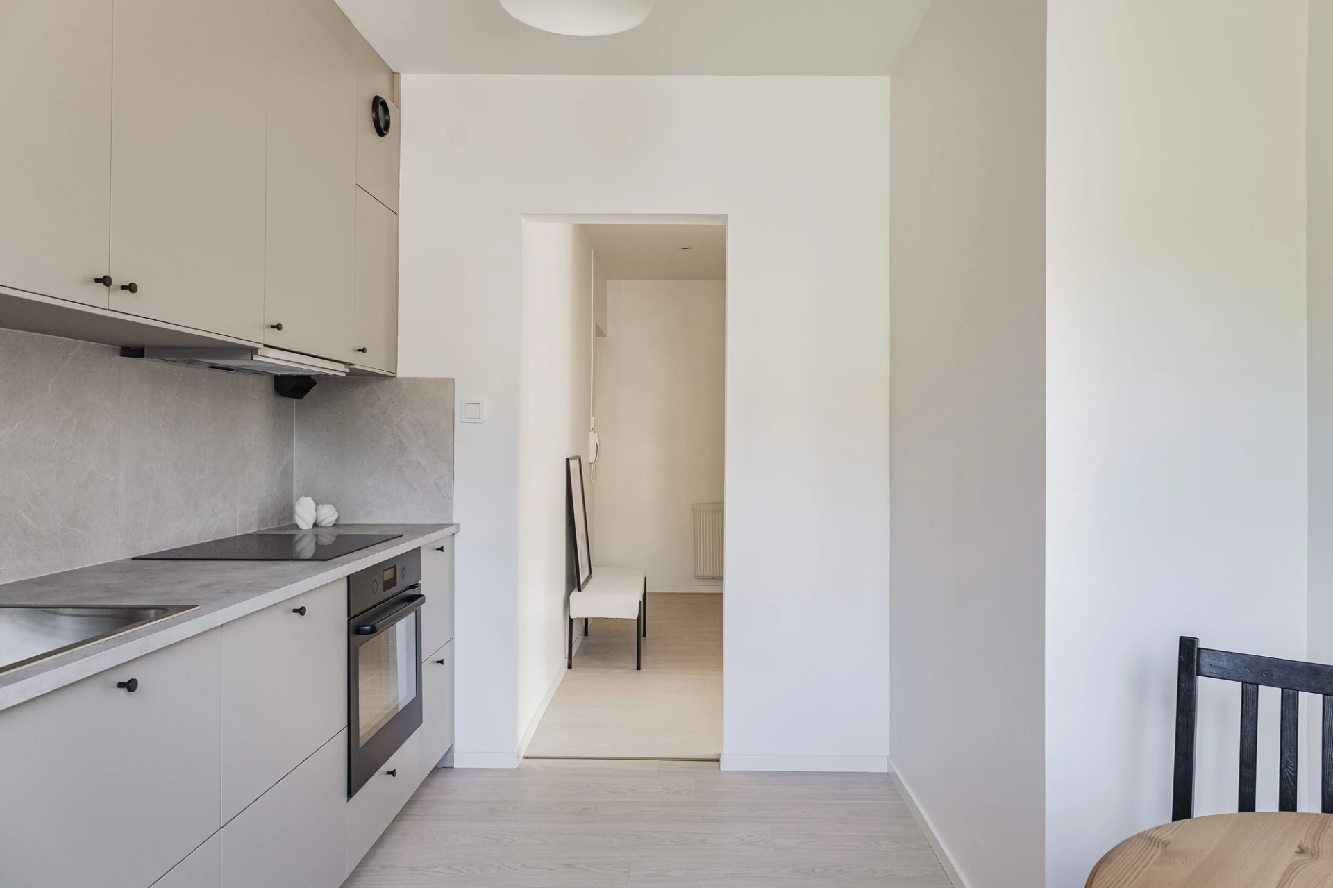Laminatgolv och ljusa, målade väggar. Köksinredning i beige, köksbänk i laminat och kaklat stänkskydd. Köket är utrustat med kombinerad kyl och frys, induktionshäll, inbyggd ugn, fläkt, inbyggd micro och diskmaskin. Alla vitvaror från Ikea (2025).