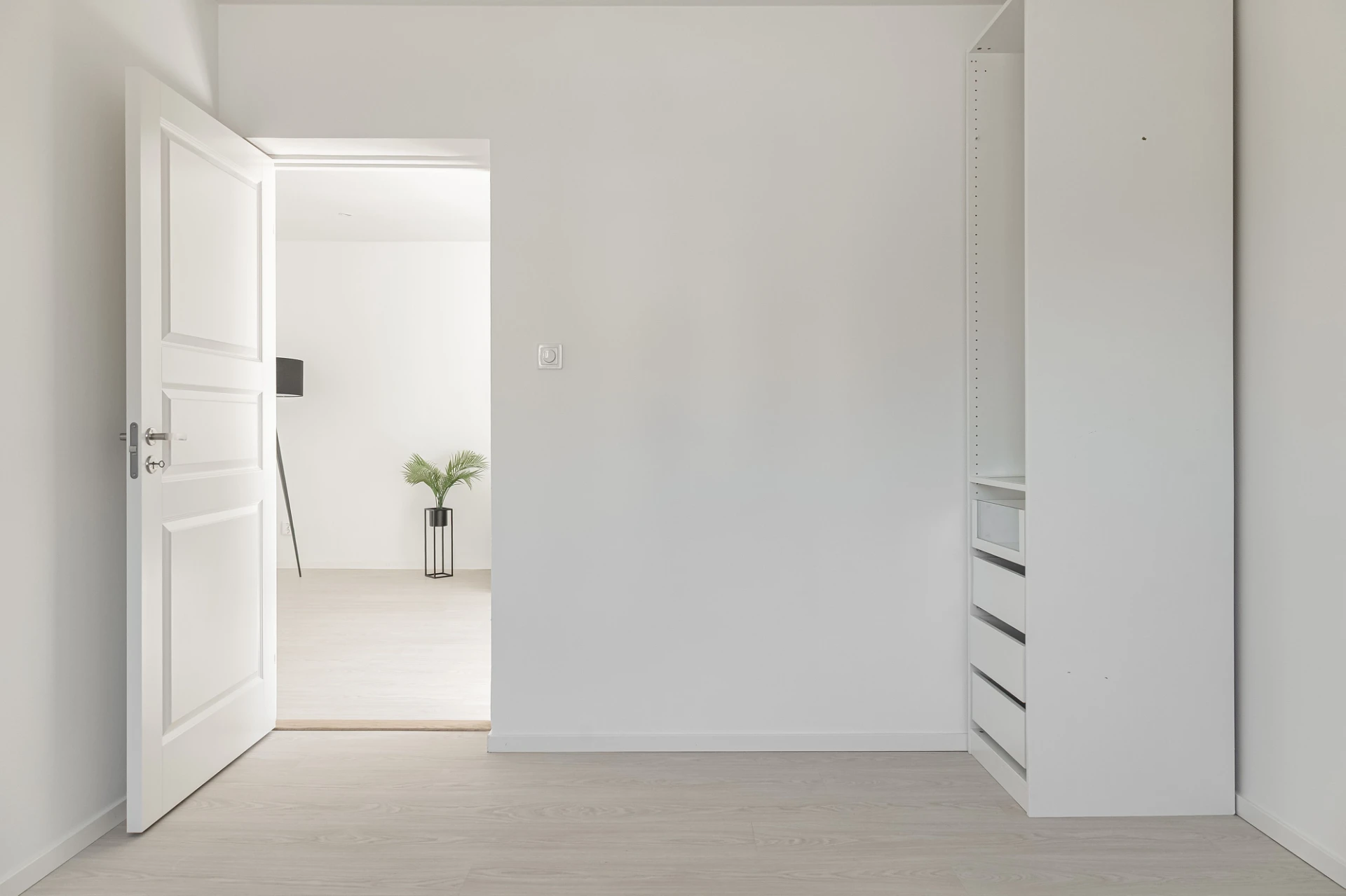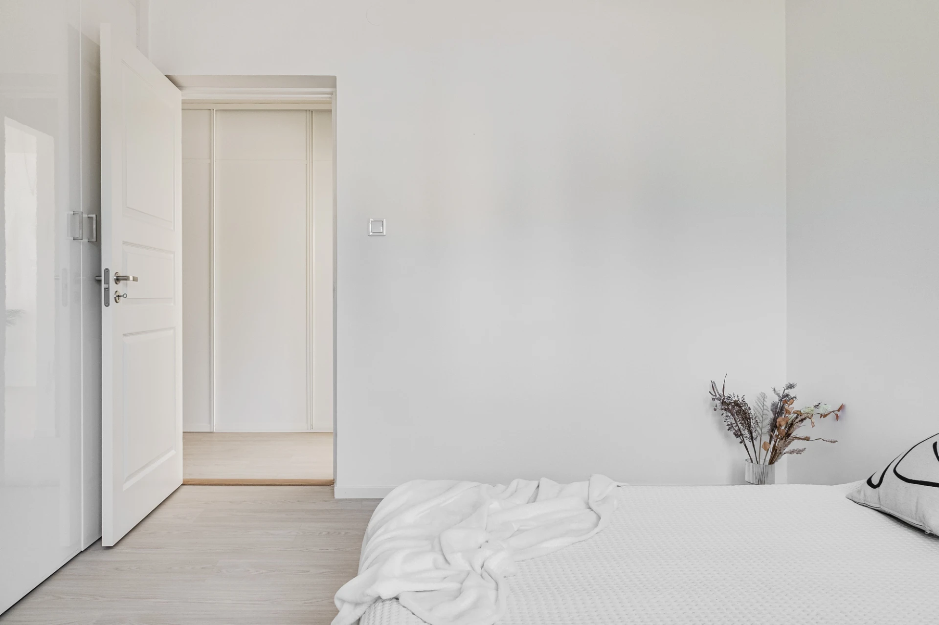 Laminatgolv och ljusa, målade väggar. Förvaring i garderob.