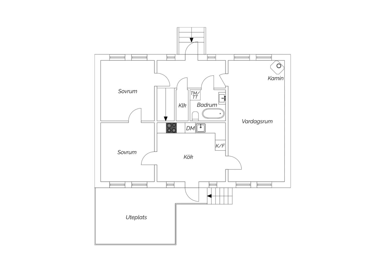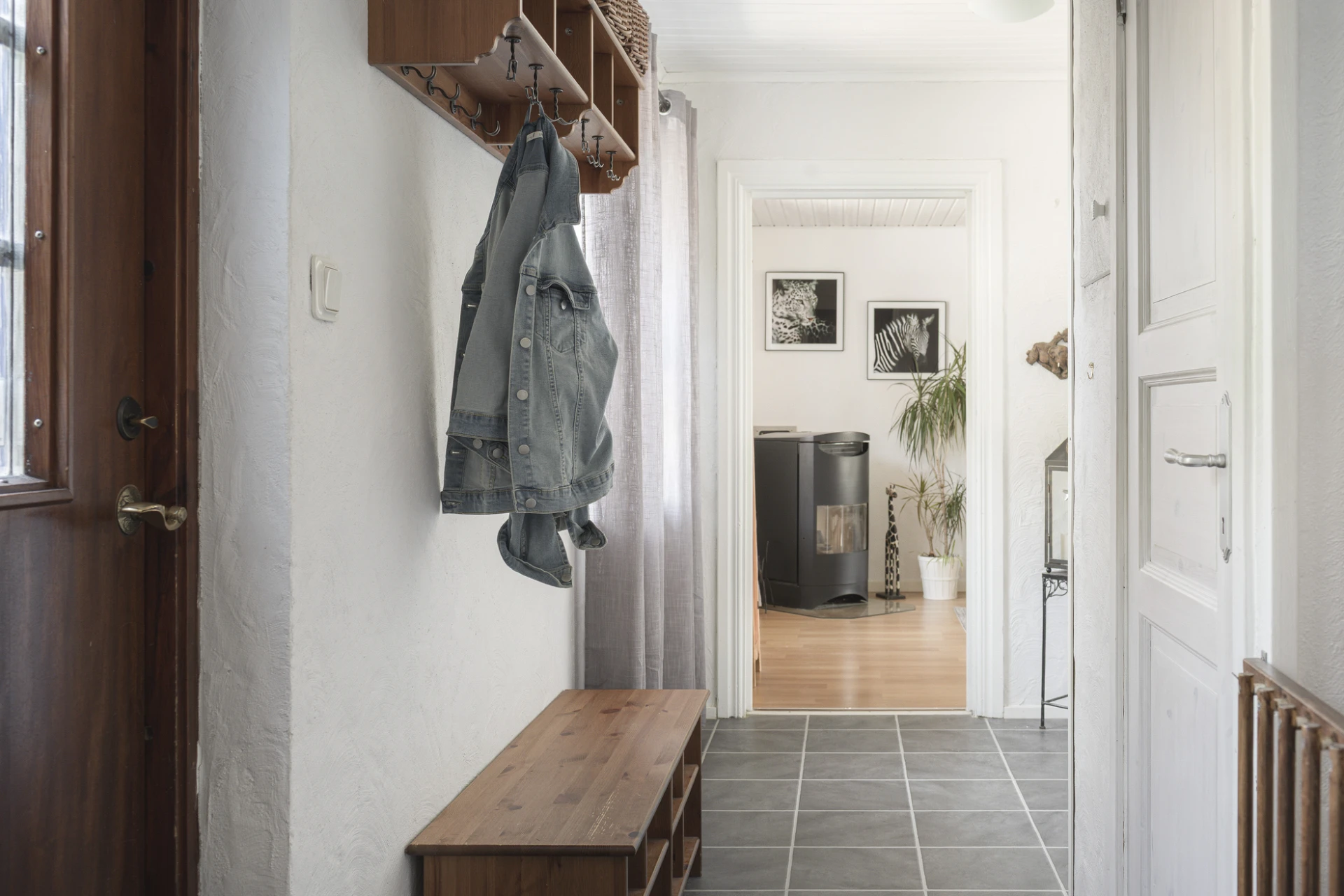 Huset har två entréer. En stor hall som nås ifrån framsidan och en ingång ifrån den härliga baksidan.