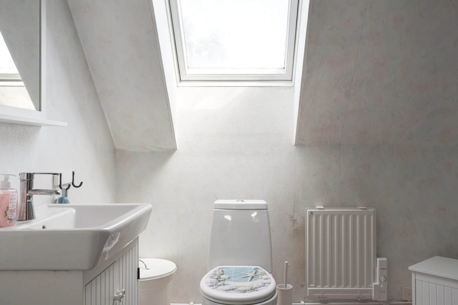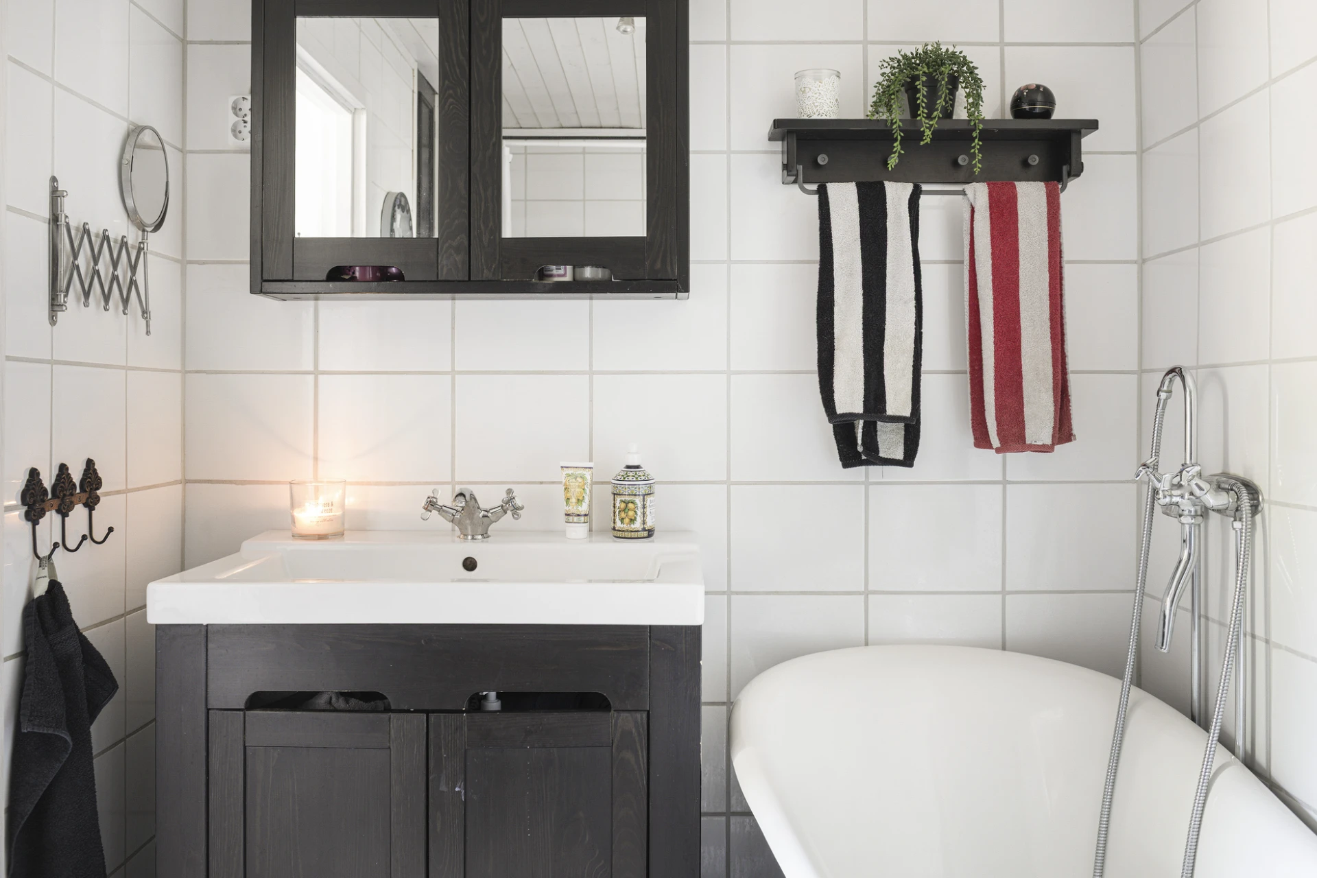 Praktiskt med ett badrum på varje våning. Utrustningen består av wc, handfat i kommod och dusch.