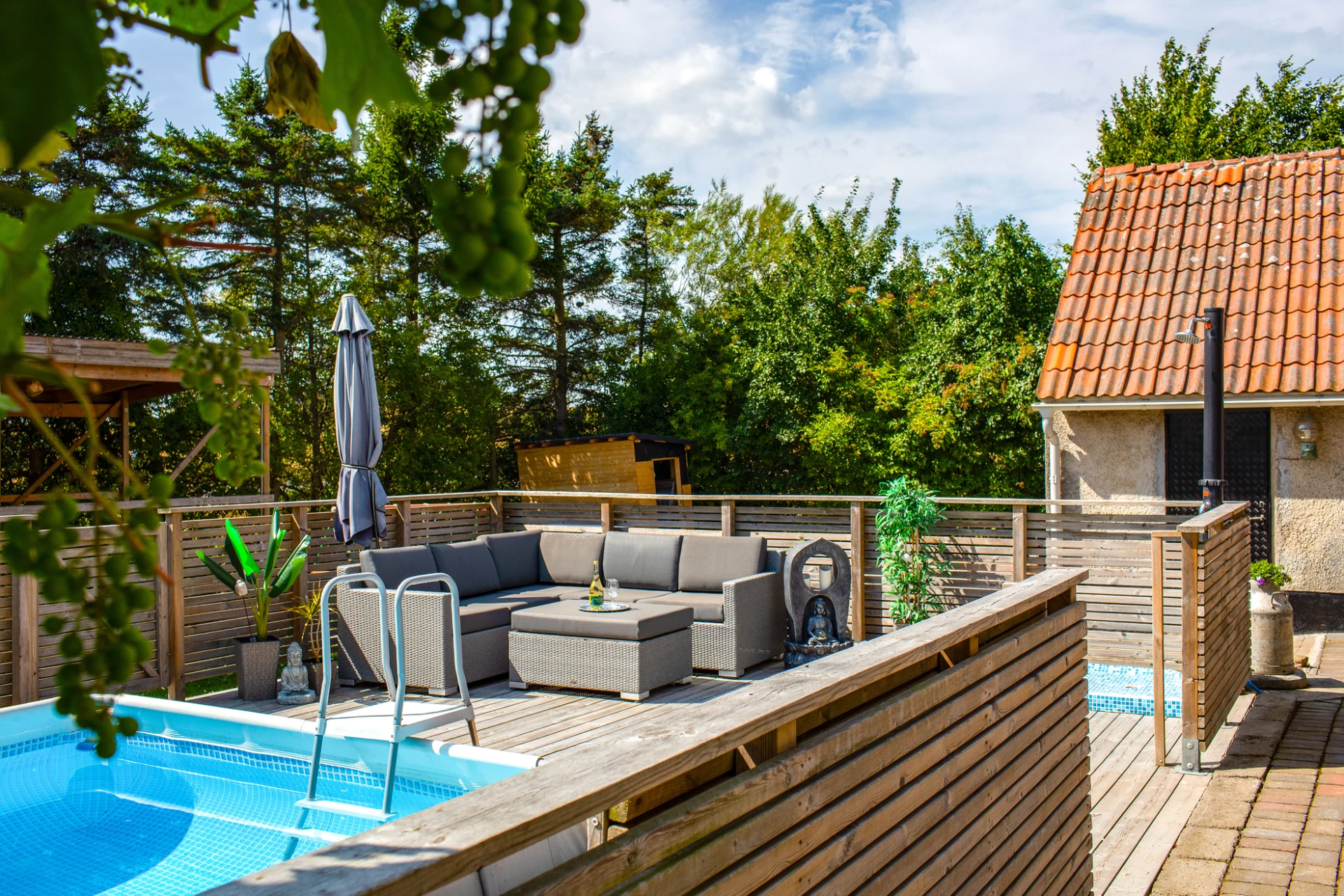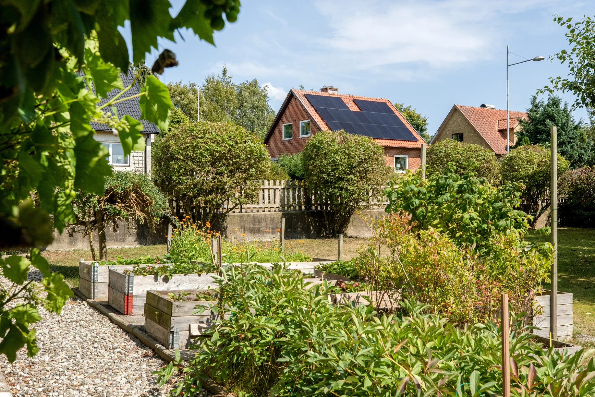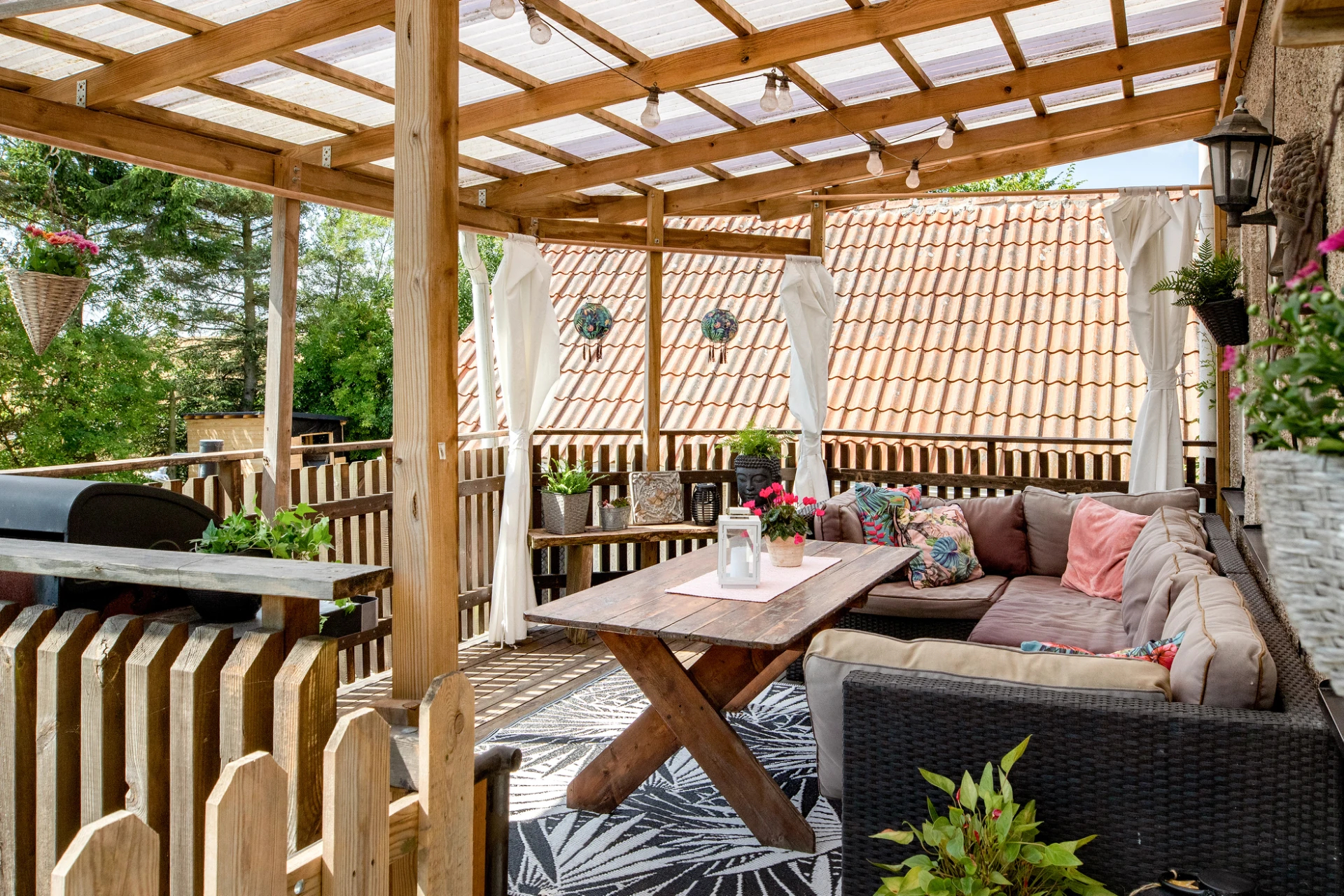 Tomten omges tryggt av staket. Med trädäck i soligt söderläge, odlingsglädje och gott om utrymme för fordon lämnar utemiljön ingen besviken. Här finns både pool och utedusch, på uteplatsen under tak njuter man oavsett väder. I trädgården samsas vindruvor, plommon och äppelträd med odlingslådor och vacker växtlighet av olika slag. Extra plus för stor uppfart med singel, hög carport och garage.