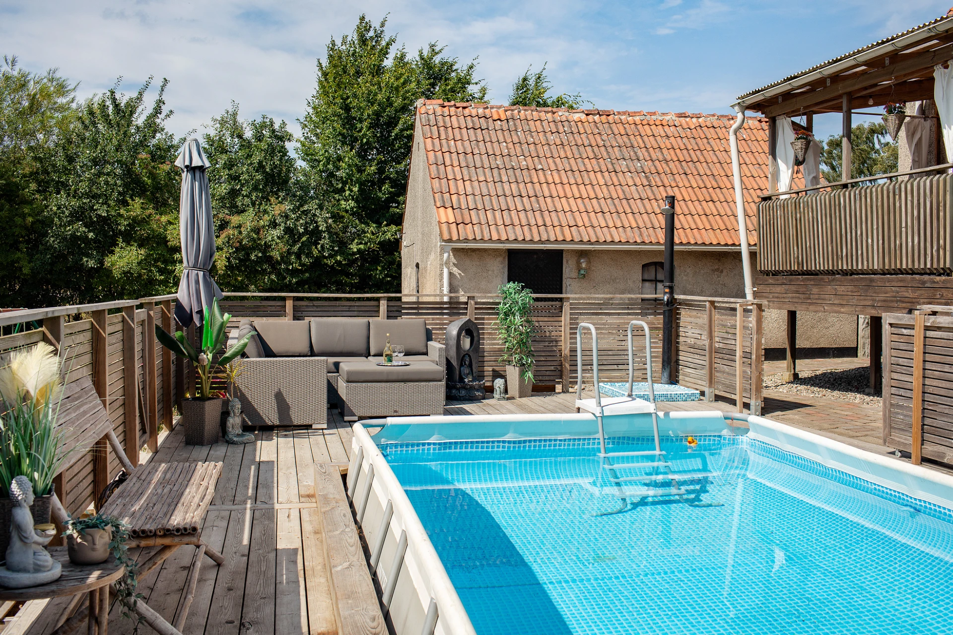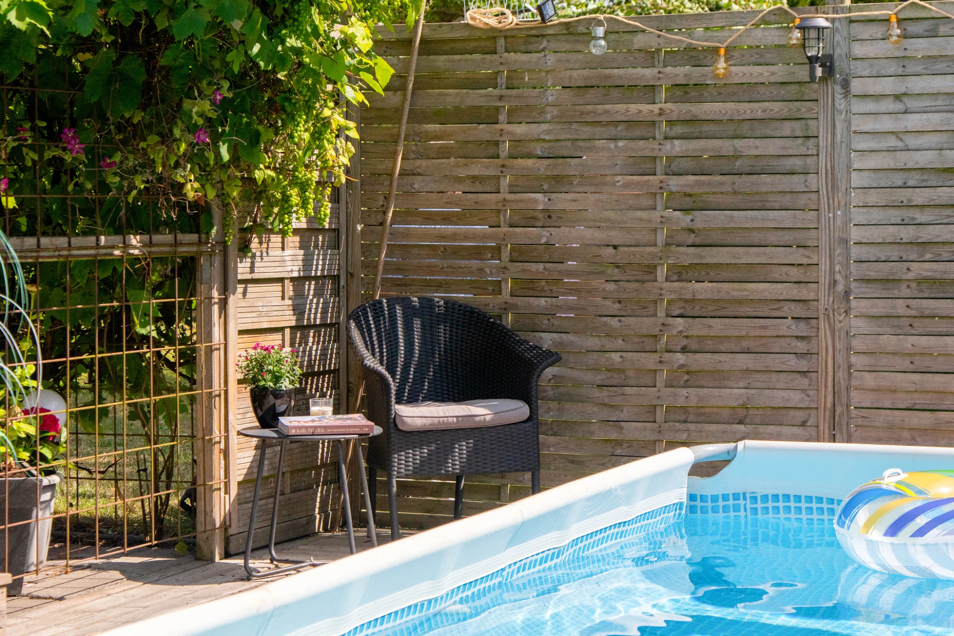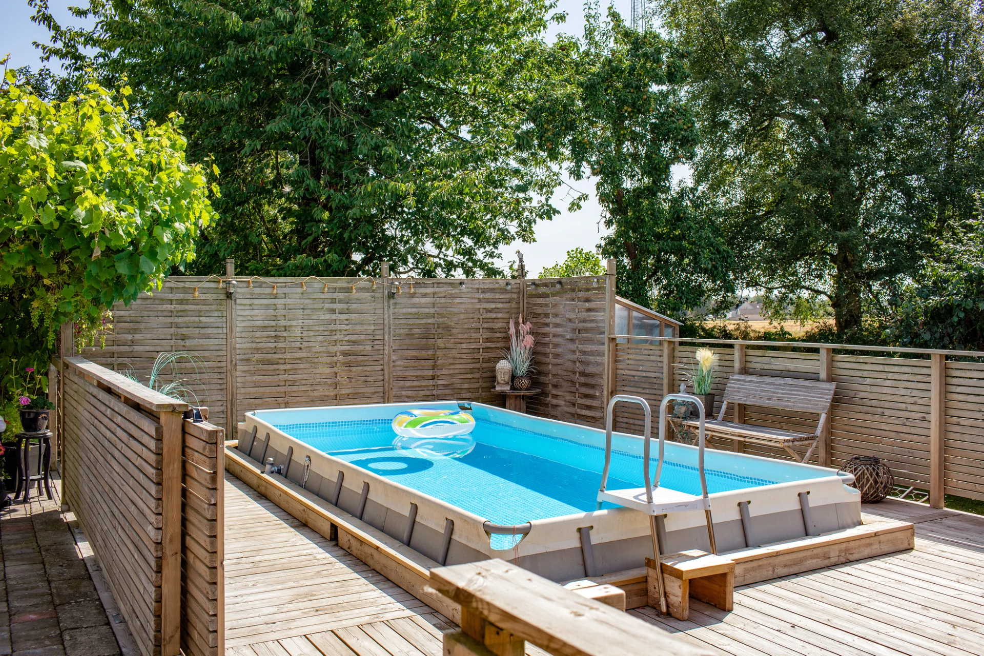 Tomten omges tryggt av staket. Med trädäck i soligt söderläge, odlingsglädje och gott om utrymme för fordon lämnar utemiljön ingen besviken. Här finns både pool och utedusch, på uteplatsen under tak njuter man oavsett väder. I trädgården samsas vindruvor, plommon och äppelträd med odlingslådor och vacker växtlighet av olika slag. Extra plus för stor uppfart med singel, hög carport och garage.