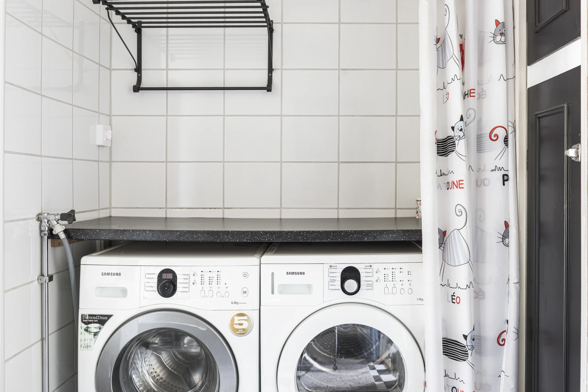 Helkaklat i tidlösa kulörer. Renoverat 2016. Utrustningen består av handfat i kommod, wc, badkar samt tvättmaskin och torktumlare.