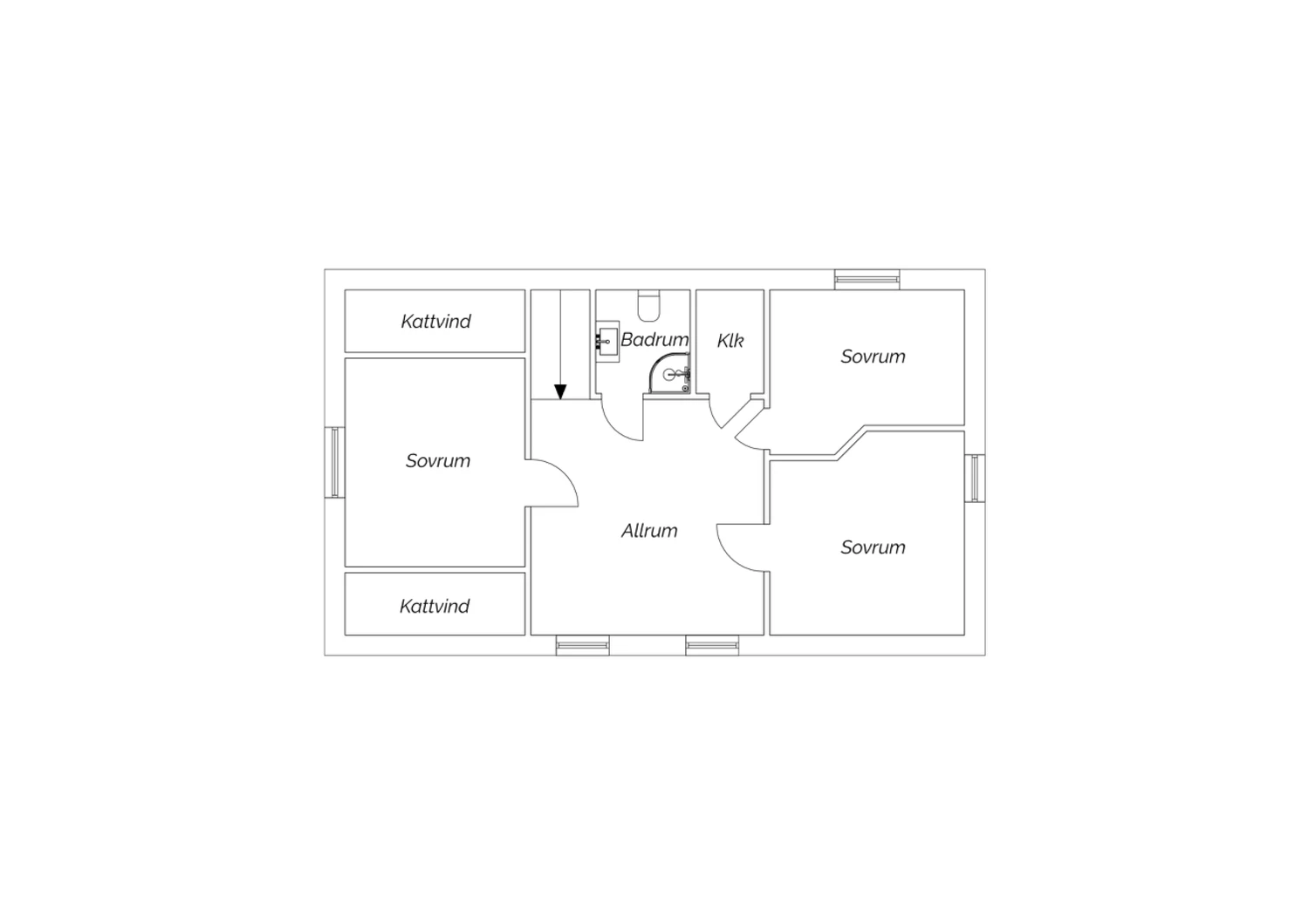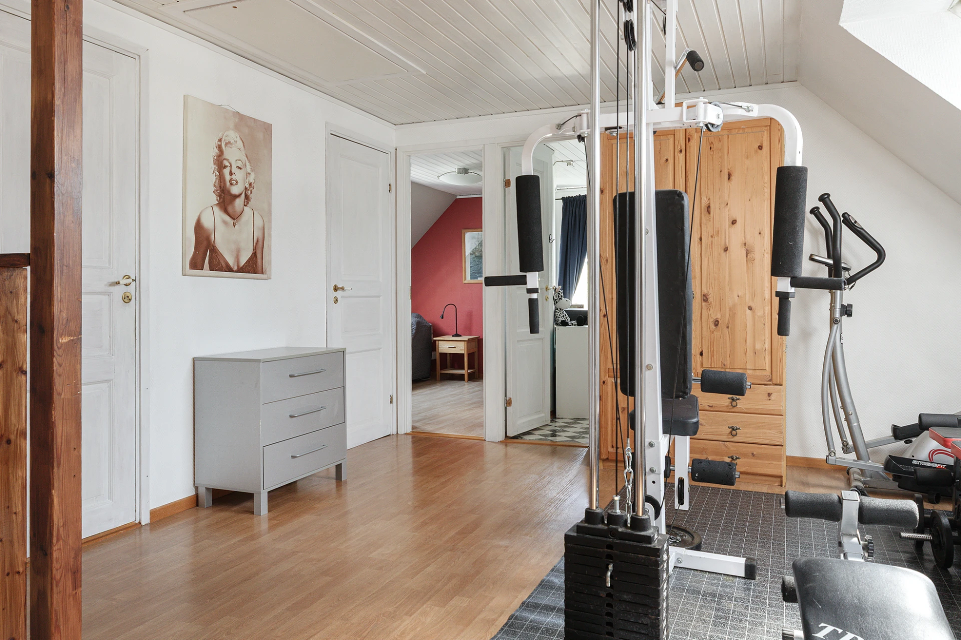 En trappa upp. Allrum i mitten av ovanvåningen.