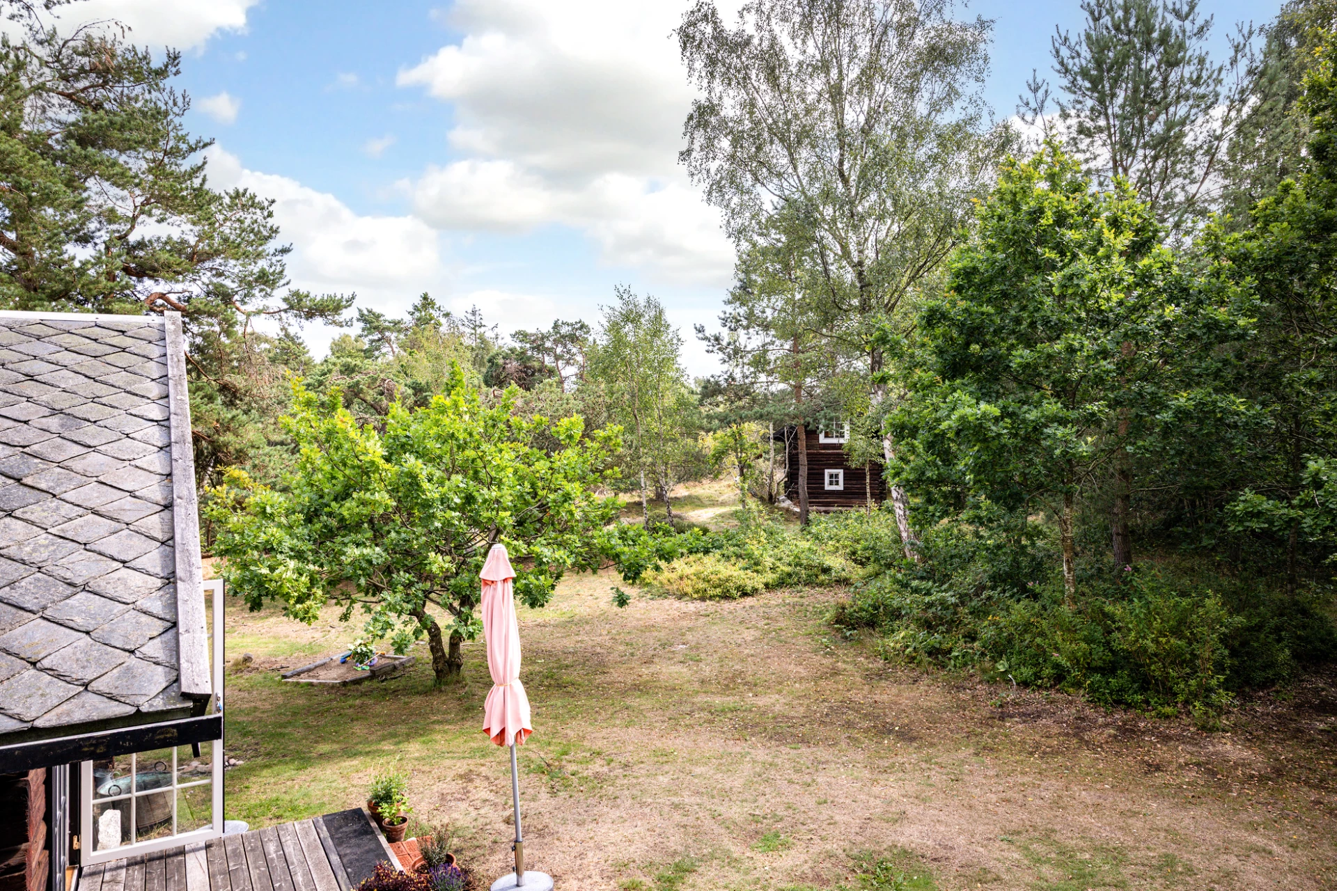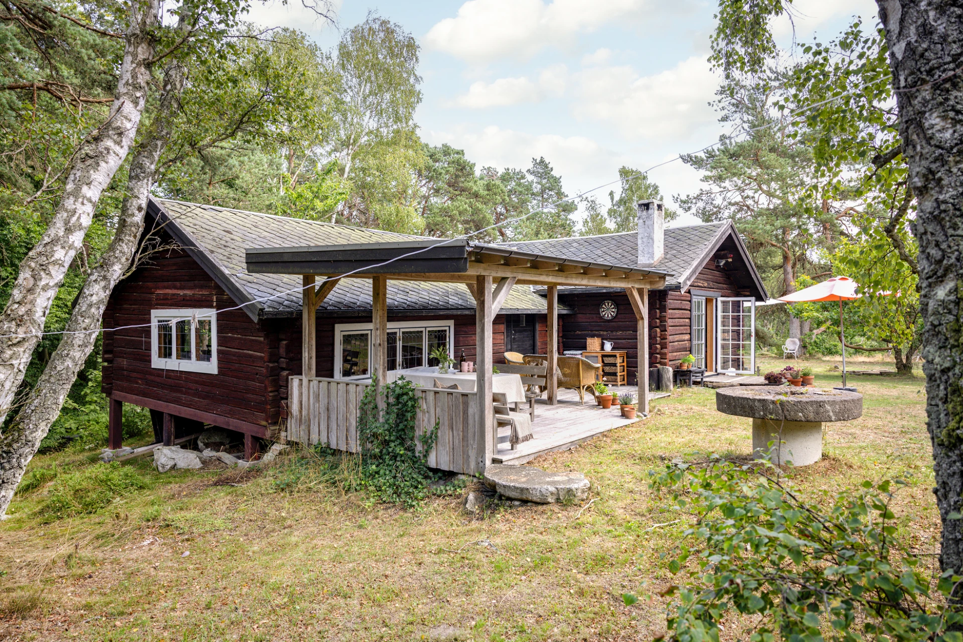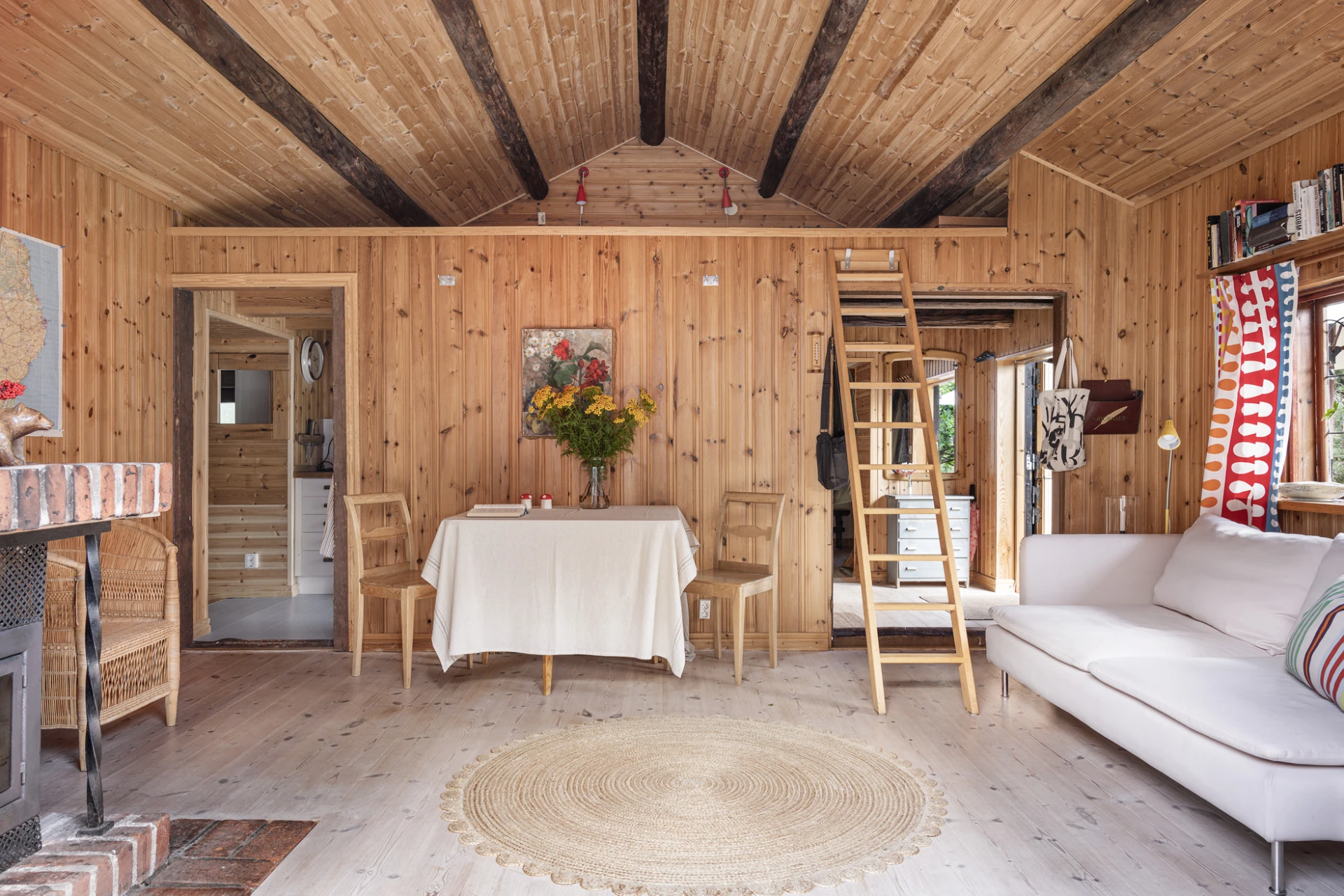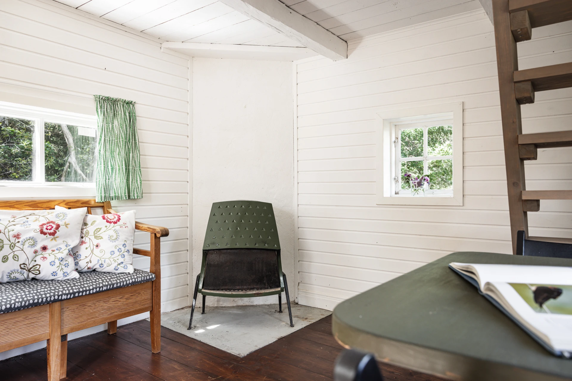 Friliggande härbre i 1,5-plan. En perfekt gäststuga. Solig veranda. Vacker grön kamin. Mysigt sovloft.