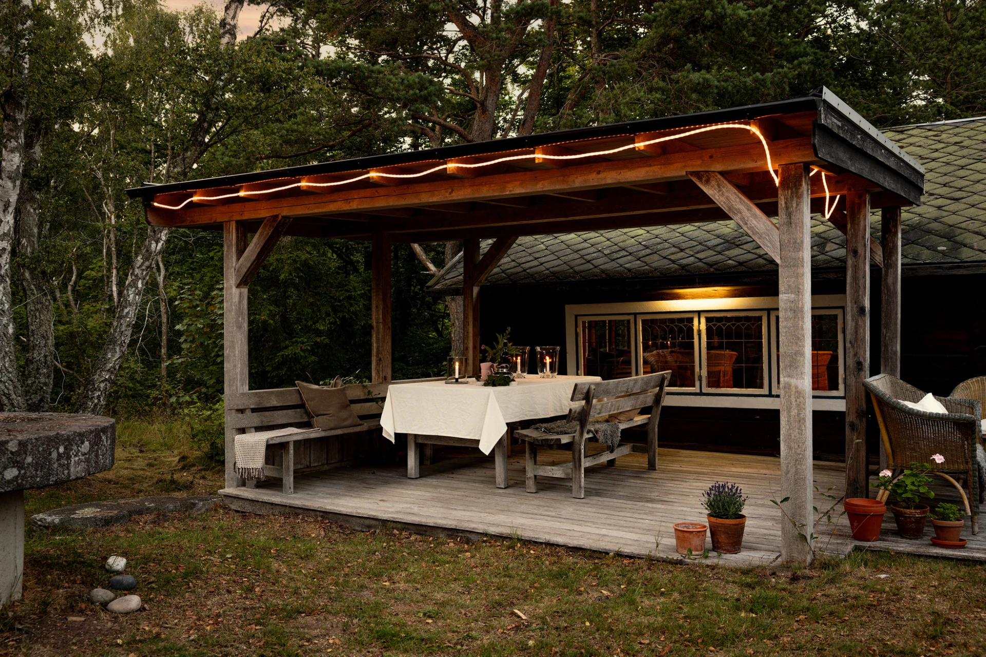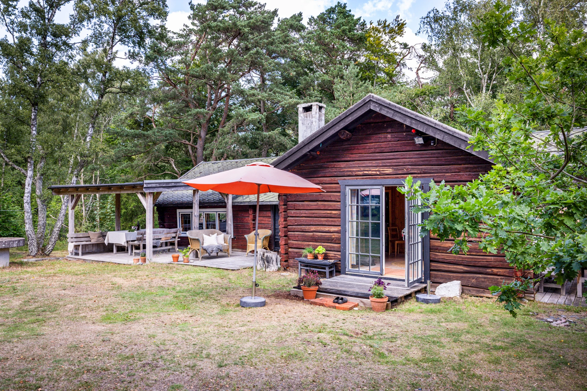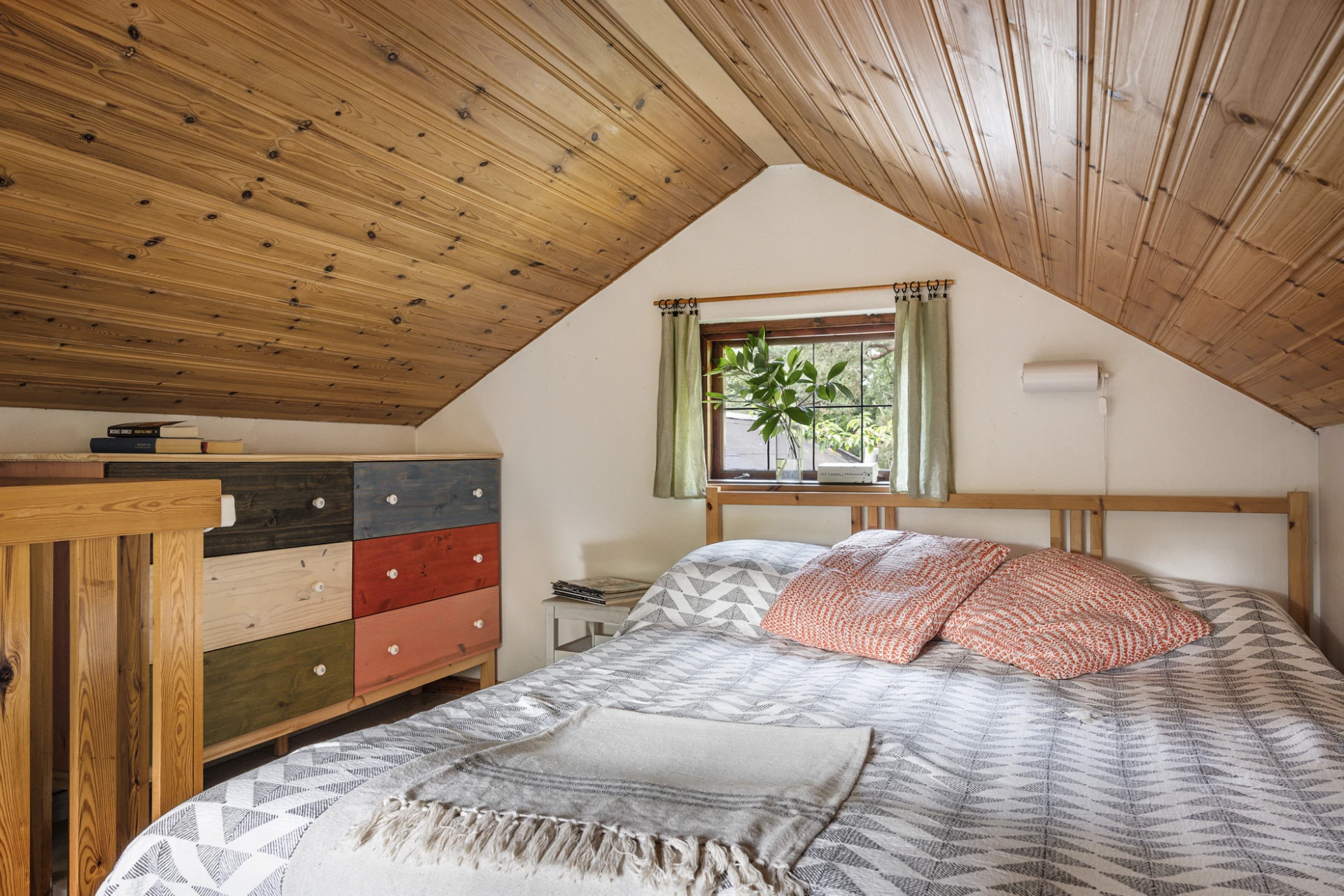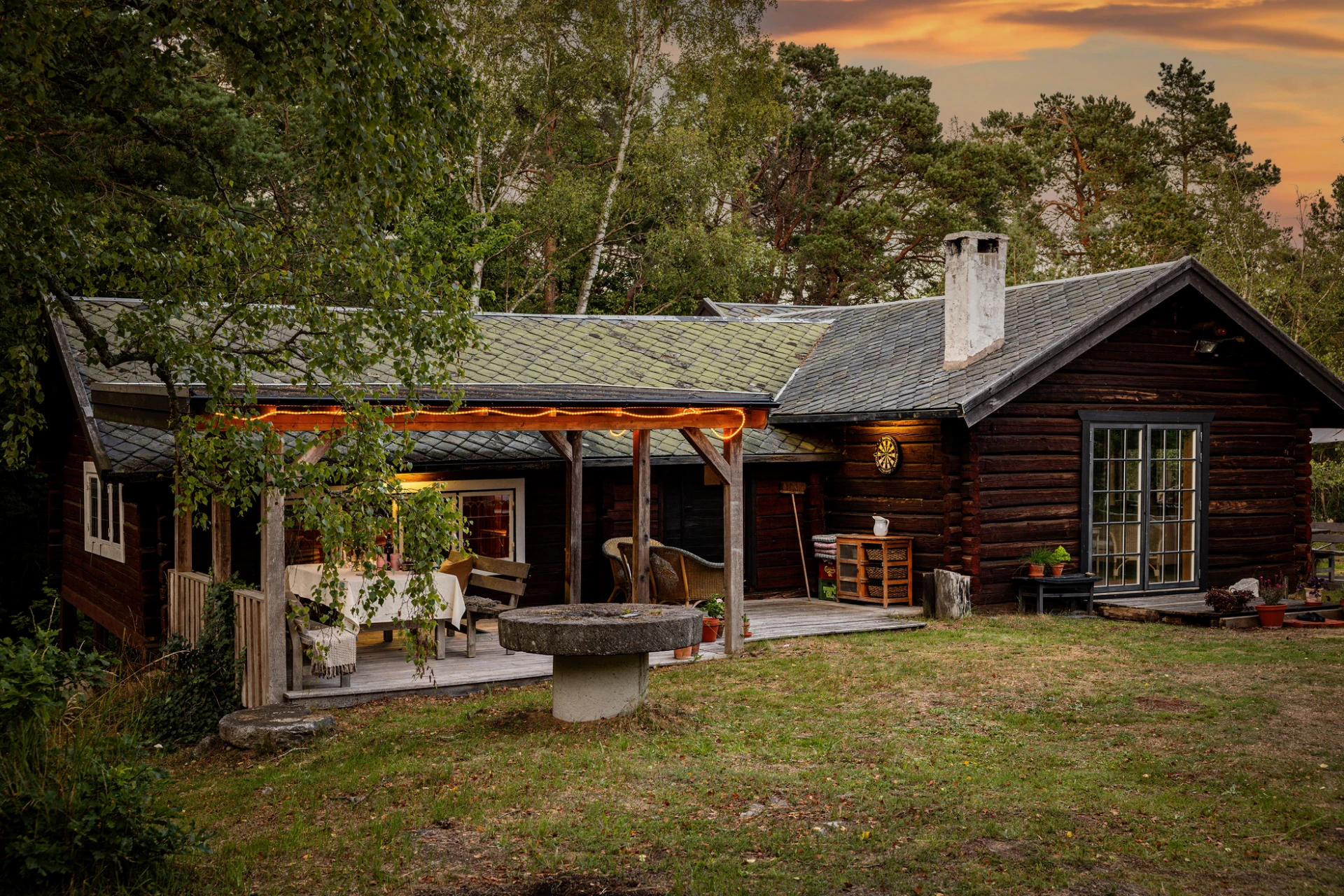 Friliggande härbre i 1,5-plan. En perfekt gäststuga. Solig veranda. Vacker grön kamin. Mysigt sovloft.