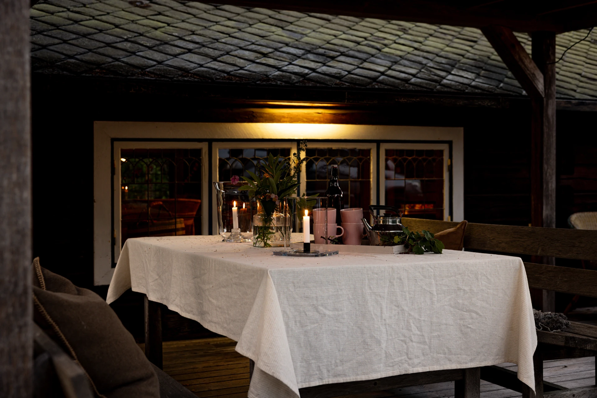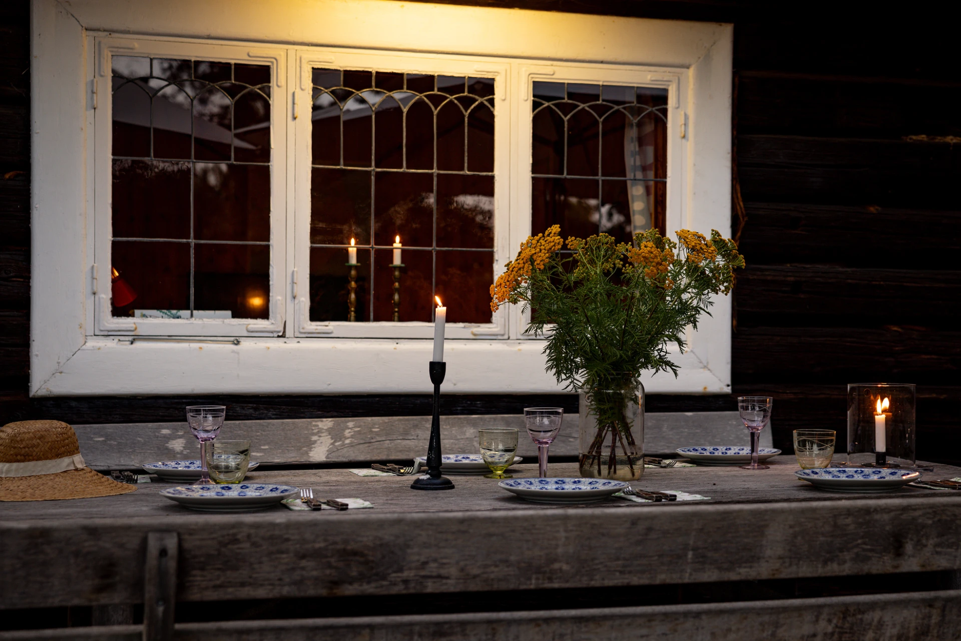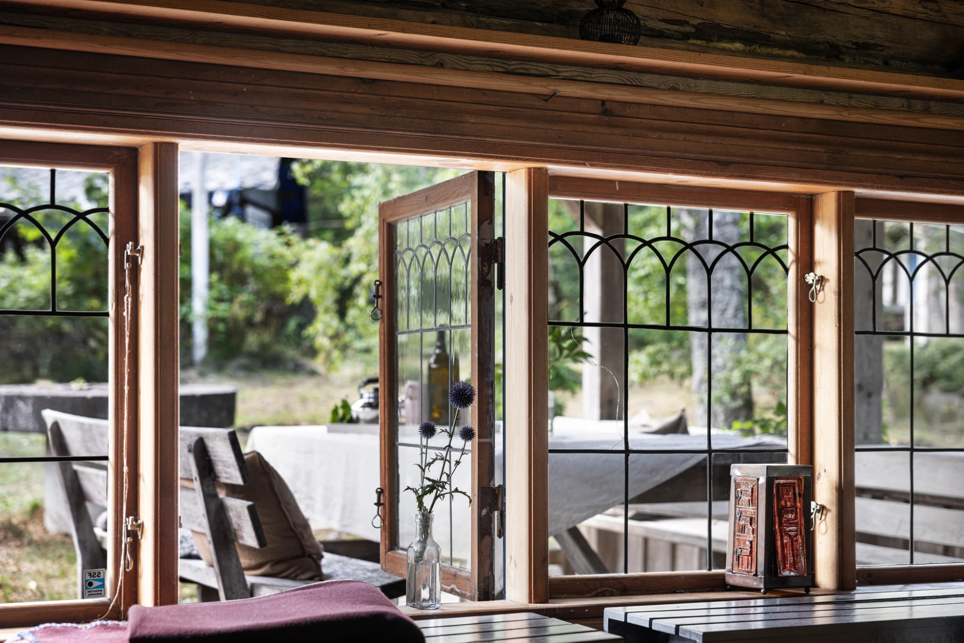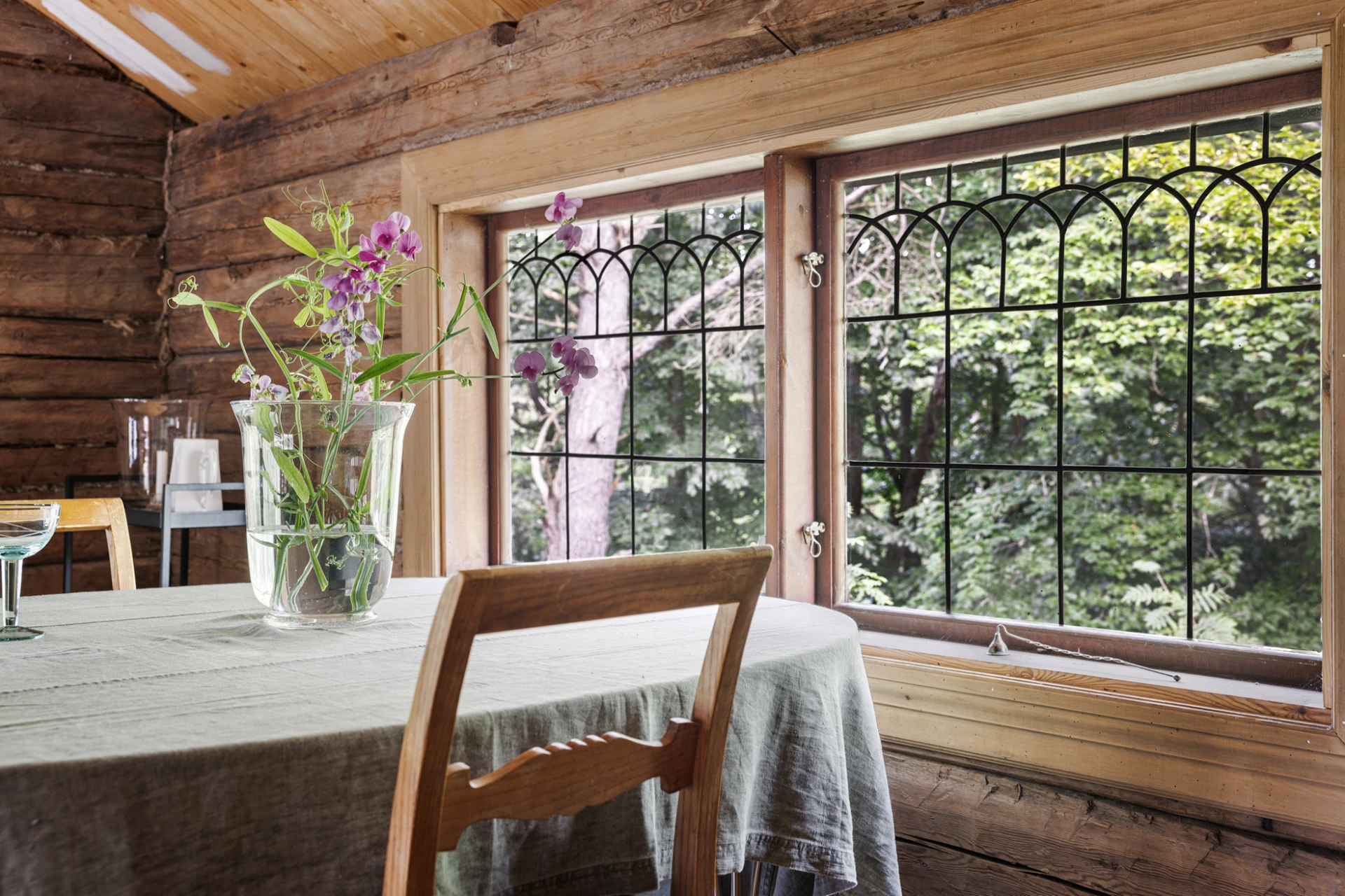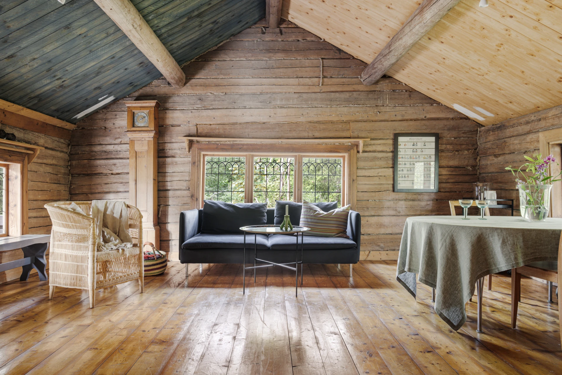 Fantastiskt rum! Huset störtsta rum, här får alla plats. Råa timmerväggar och lågt sittande blyinfattade fönster.