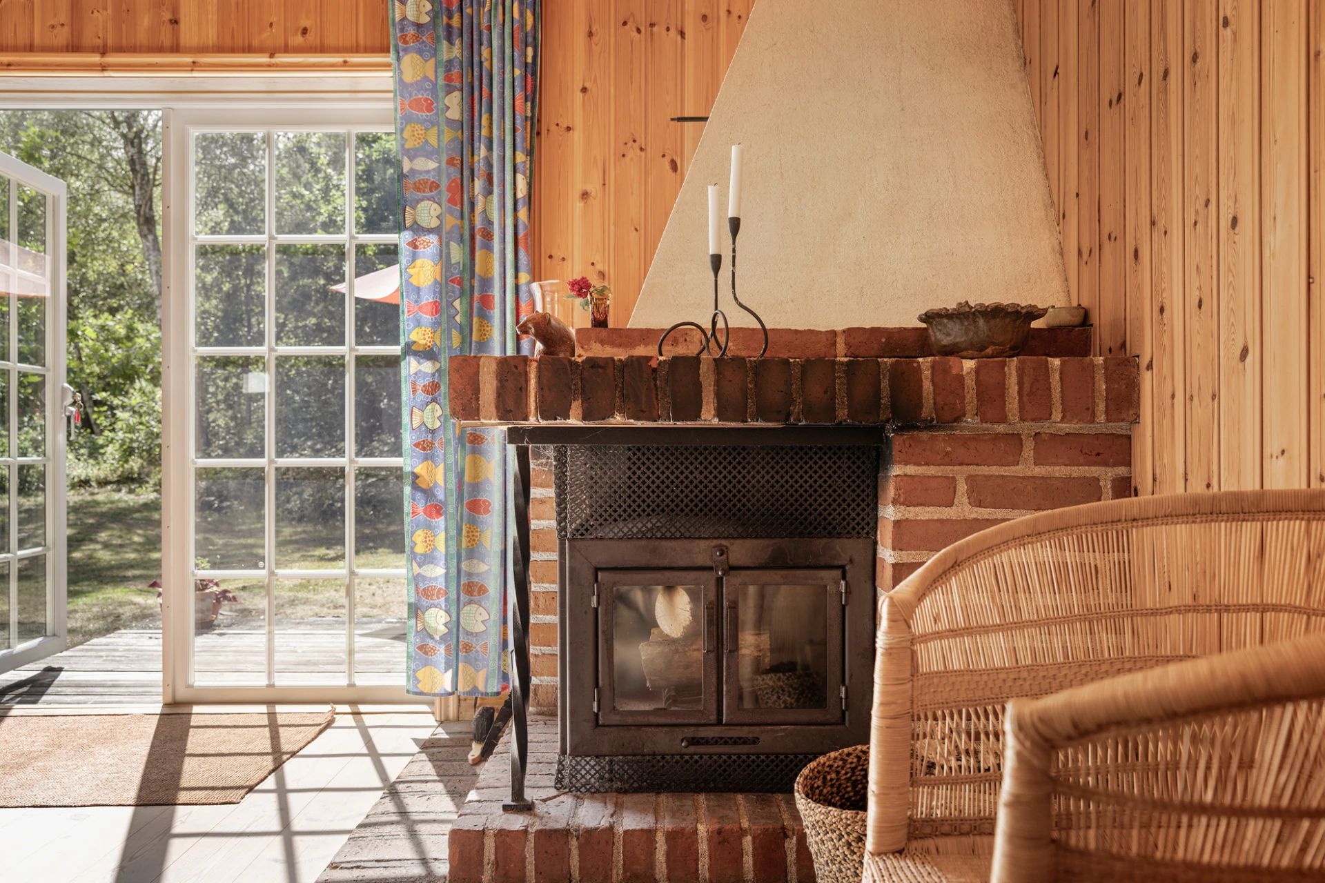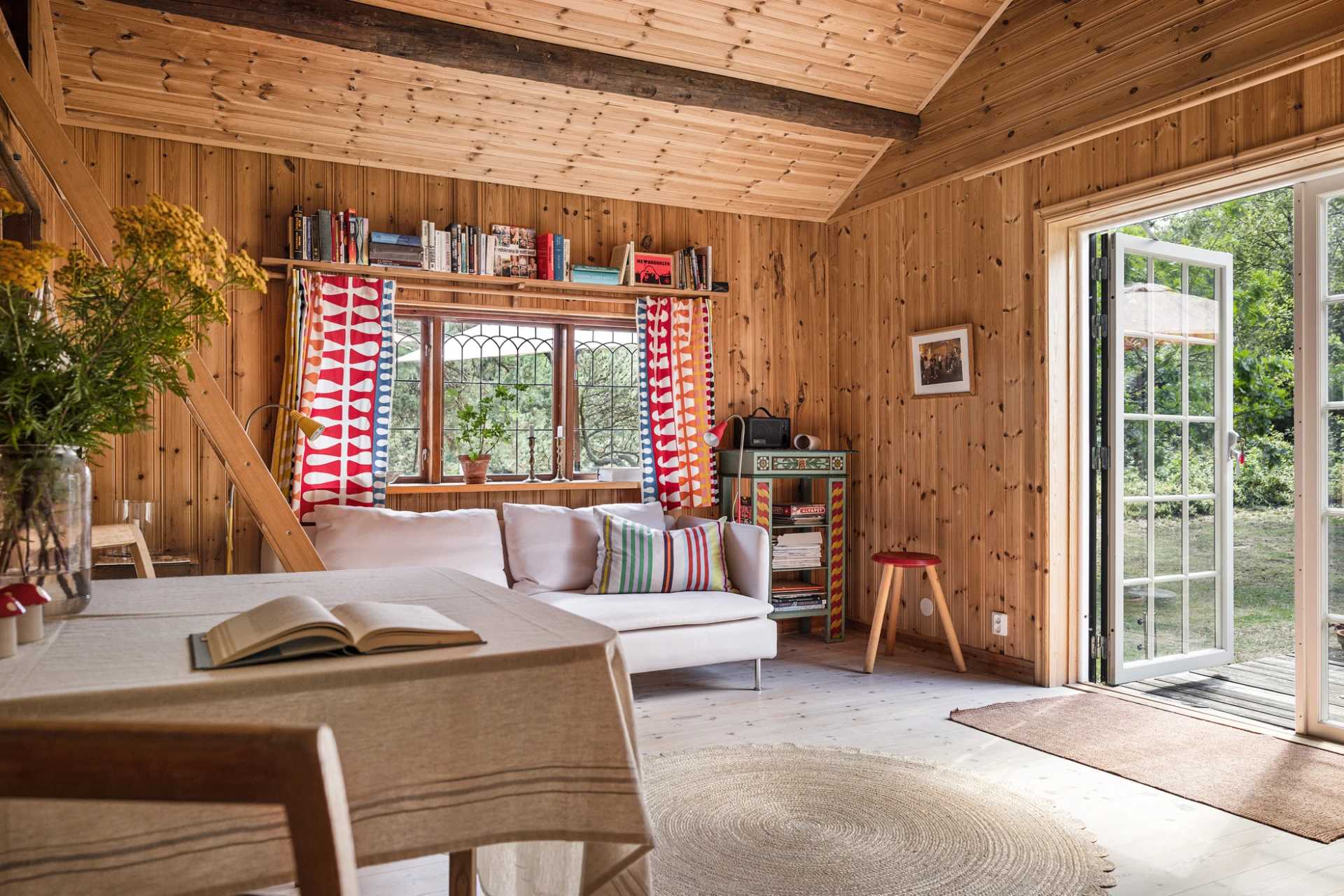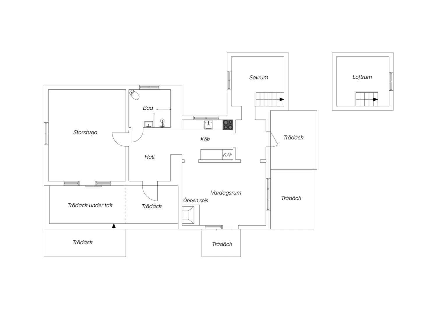 Ljust och rymligt rum med öppet upp i nock. Utgång via glasade altandörrar till soligt trädäck. Värmande kamin.