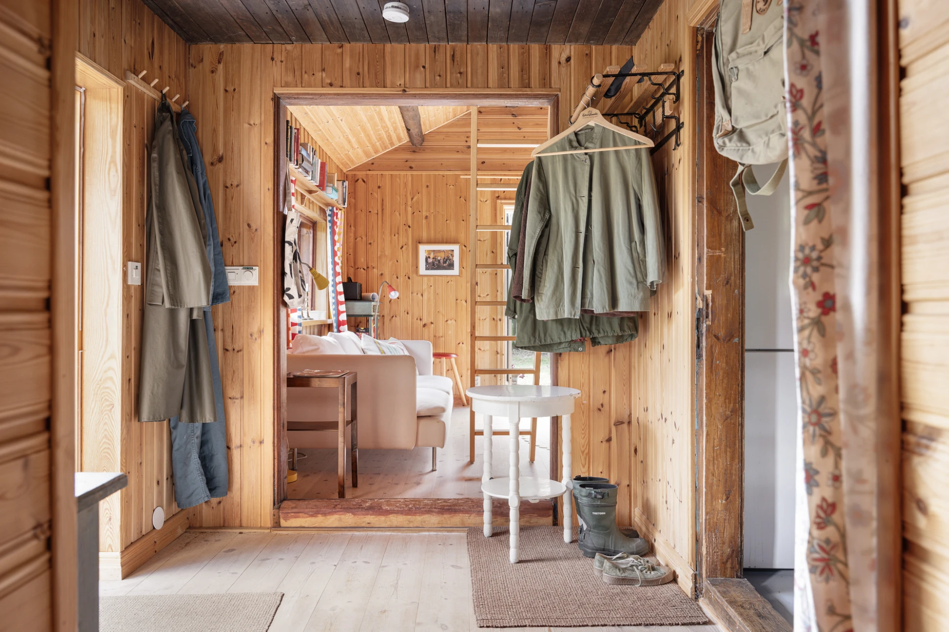 Välkommen in via härligt trädäck med underbar vy över naturtomten. Hall med plats för kläder och skor. Genom hela bostaden löper enhetligt lackat furugolv.