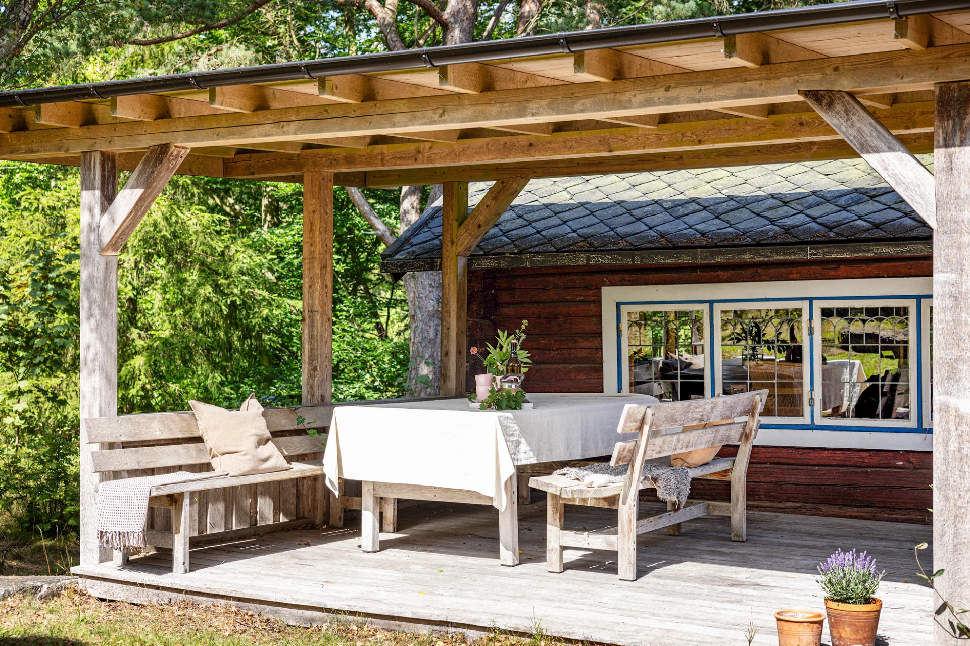 Det fristående härbret: Installation av el. Nytt tak. En trappa som förbinder nedervåning med övervåning, invändig målning med linolja. Trädäck.