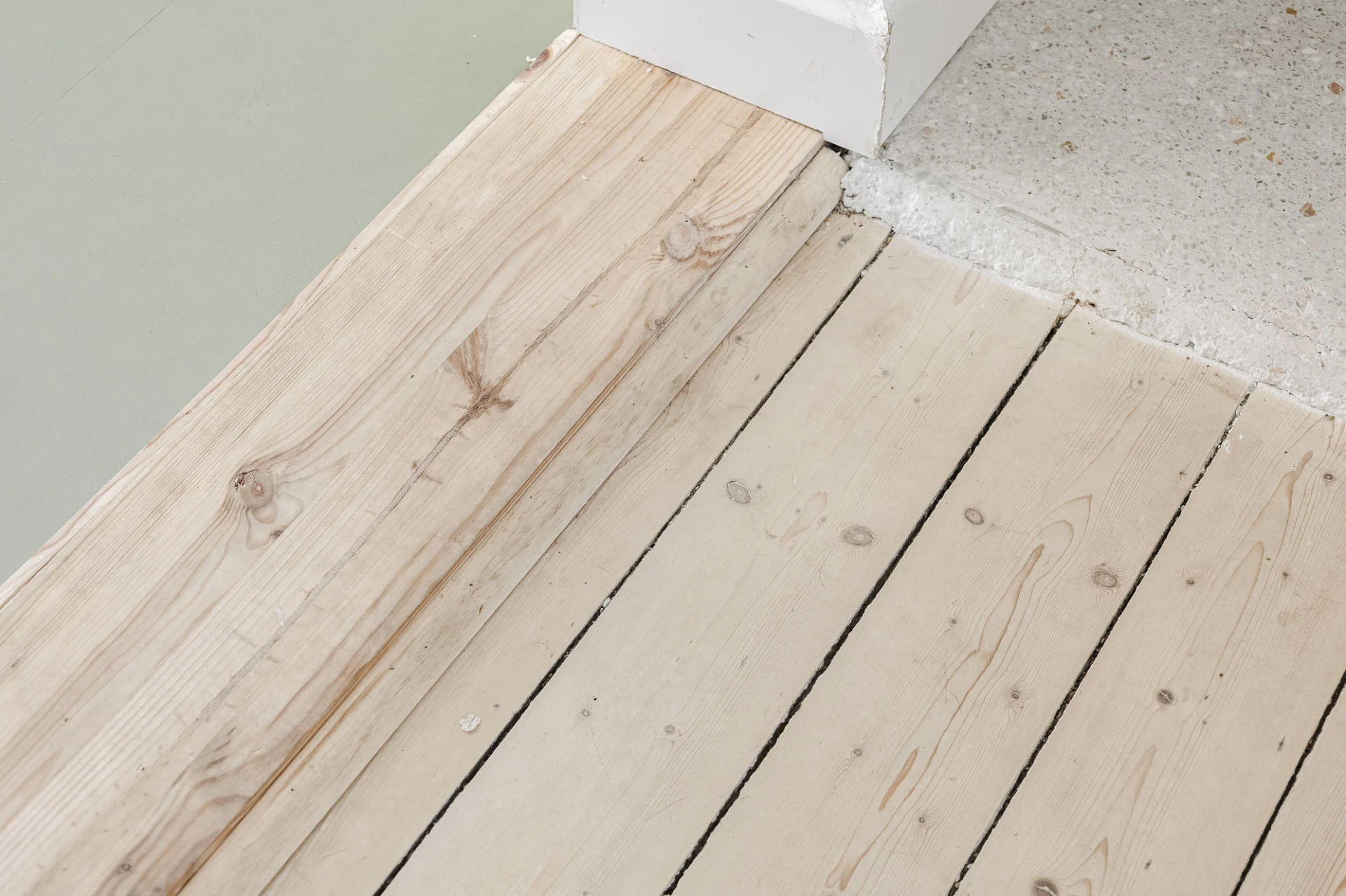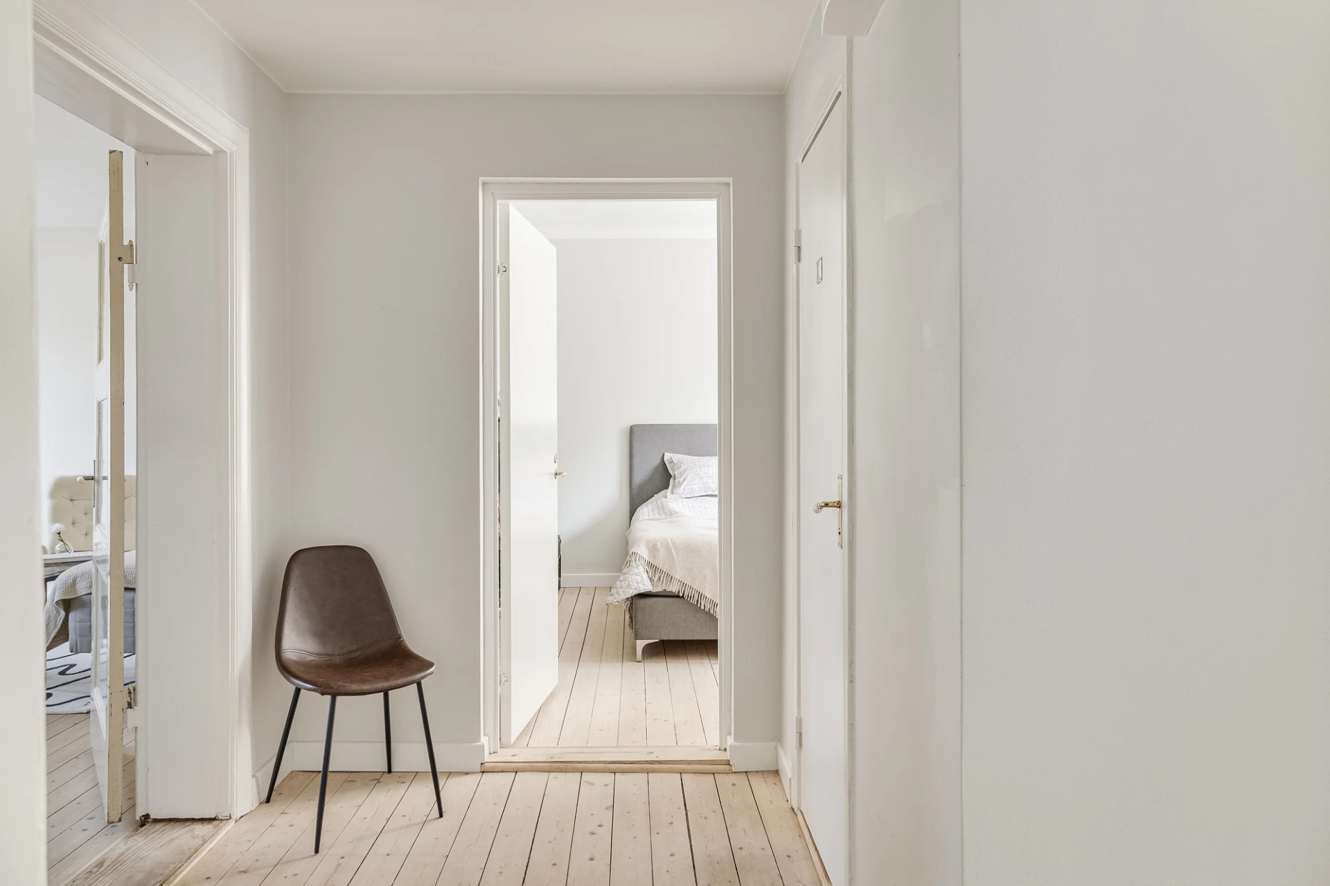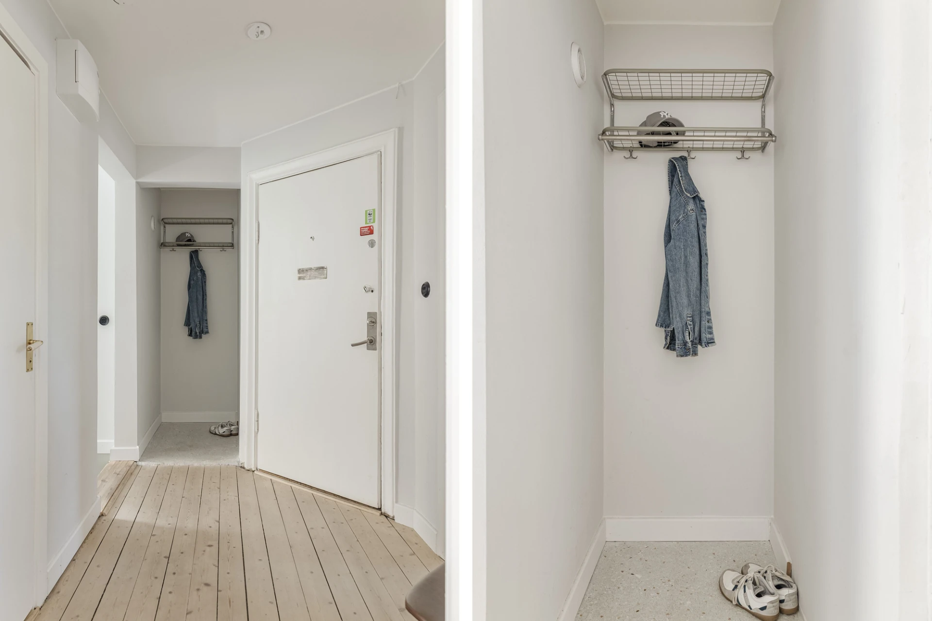 Välkomnande hall med plats för avhängning i ett gatt. Ljusgråa väggar och brädgolv.