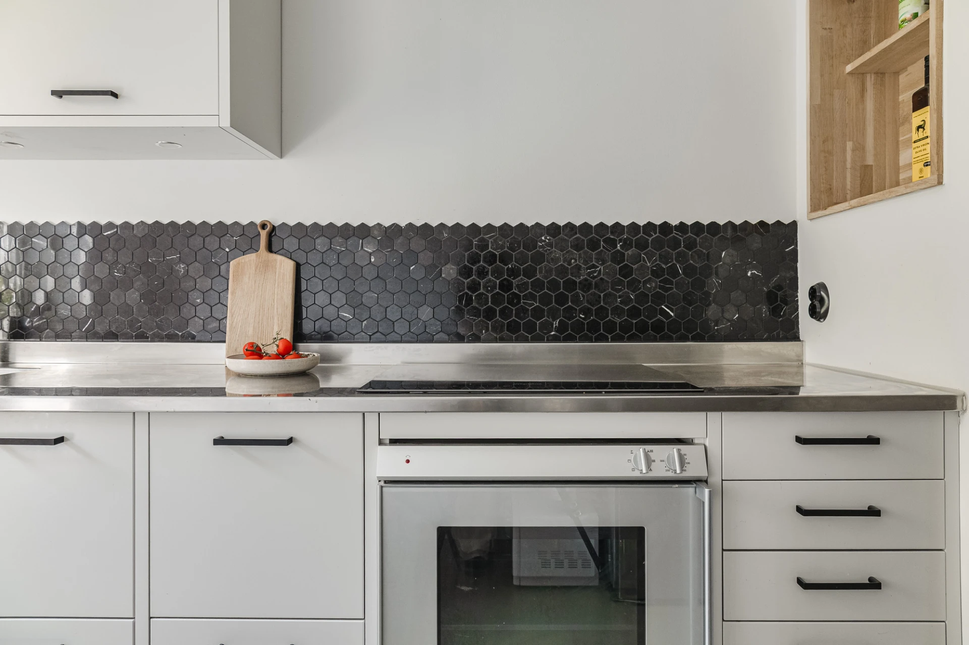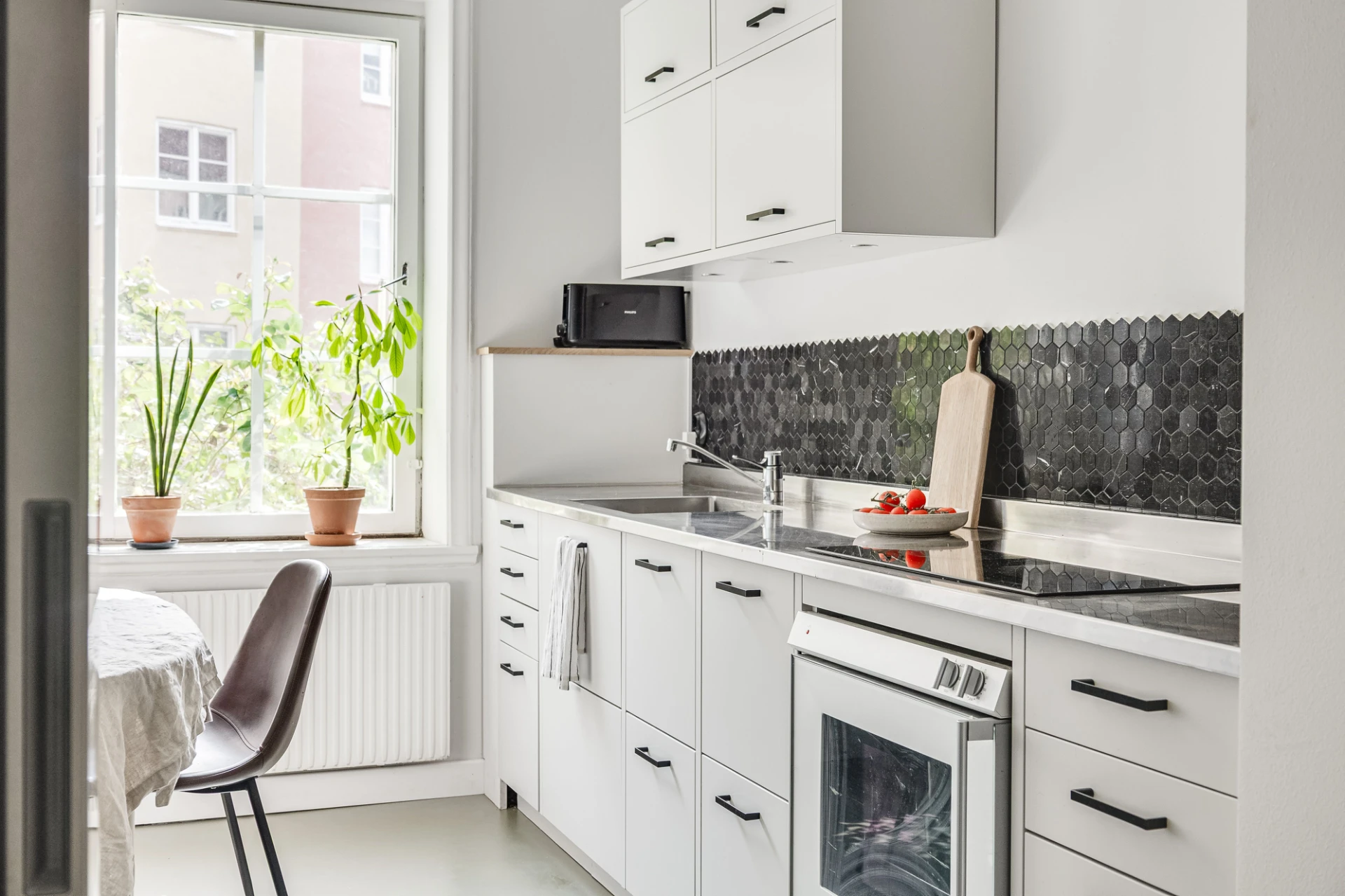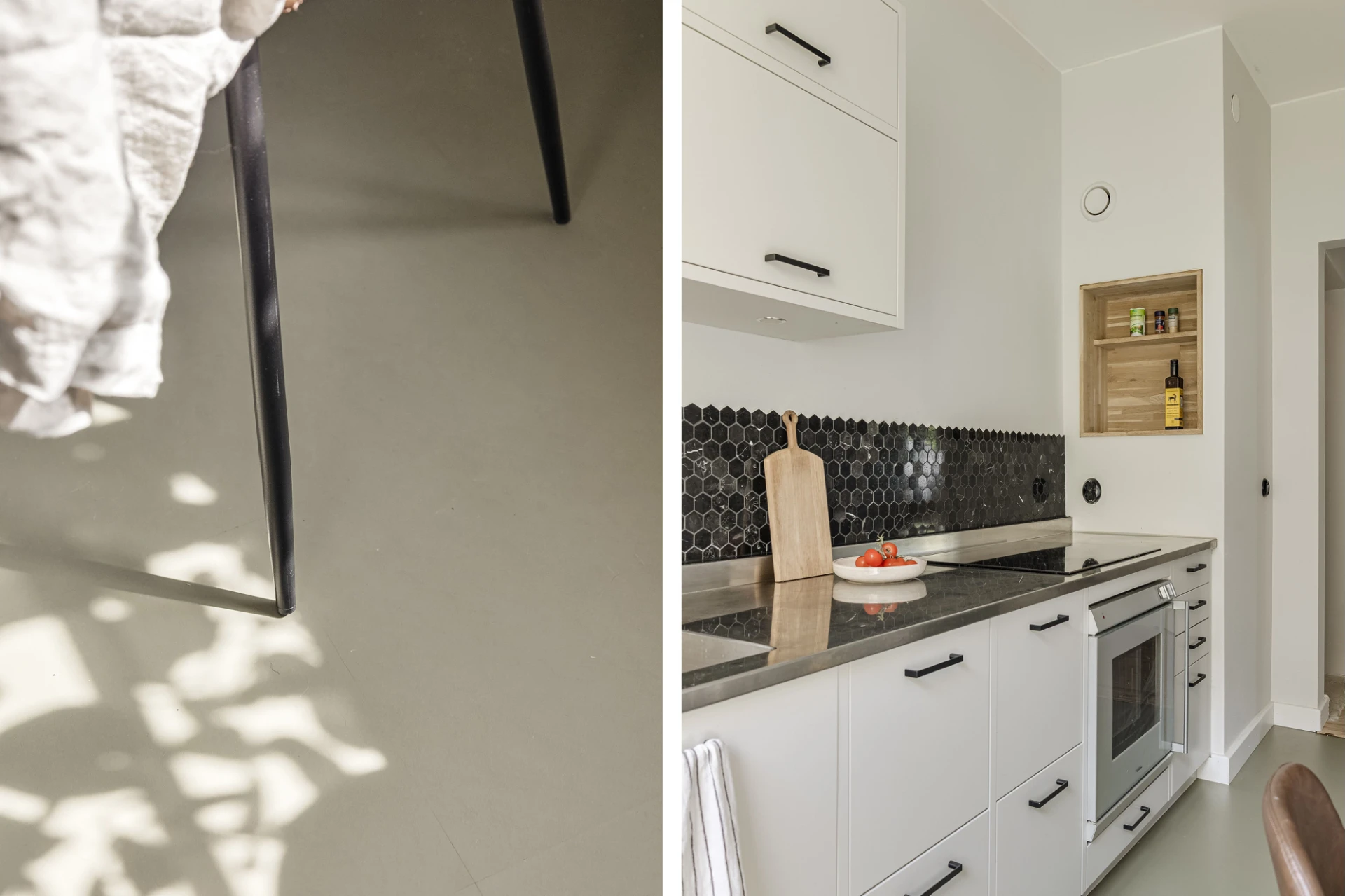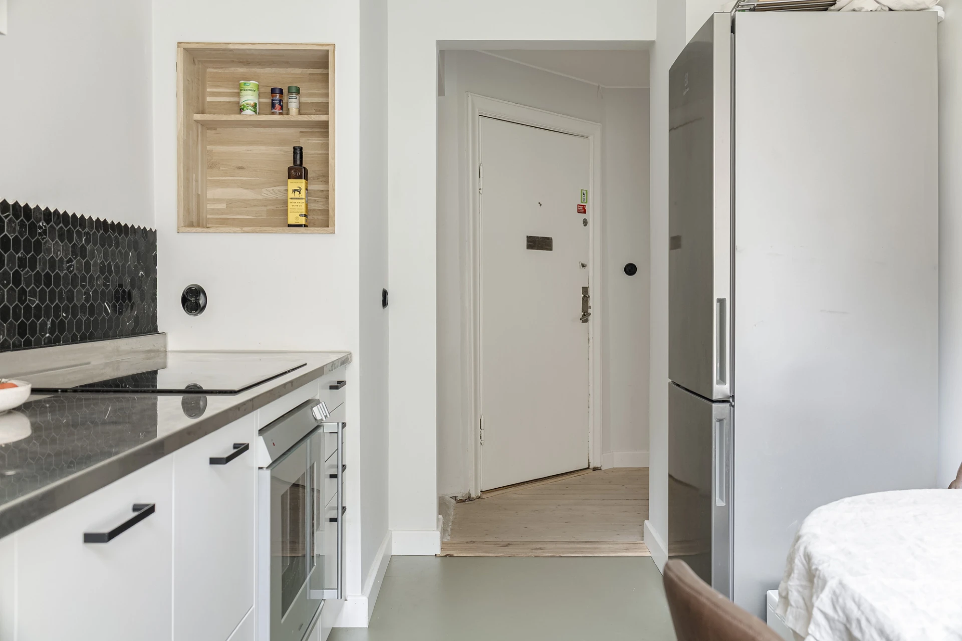 Stilrent kök från Ballingslöv med ljusgrå köksinredning med svart marmormosaik ovan bänkskivan i rostfristål. Utrustningen består av spis, ugn, kyl och frys. Matplats för ca fyra personer.