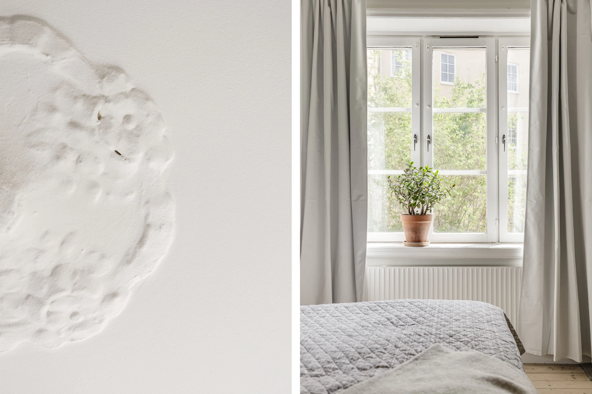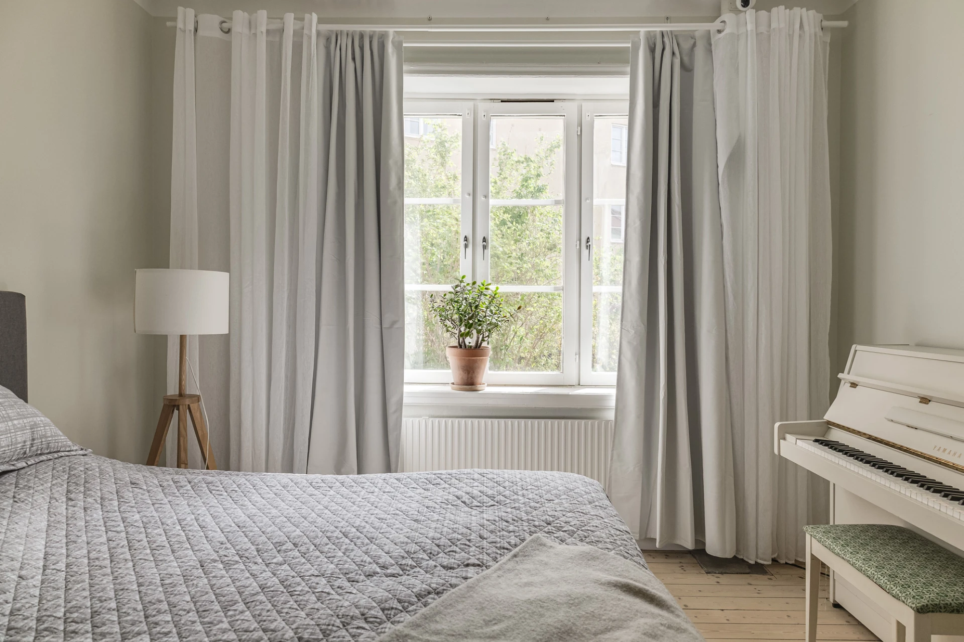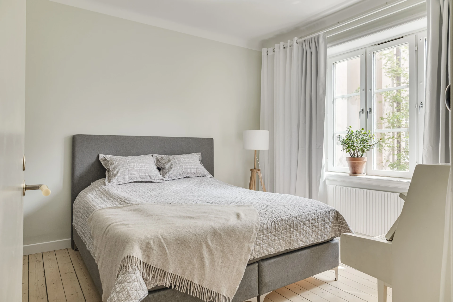 På rofyllt läge finner vi sovrummet som är beläget mot föreningens grönskande innergård. Ljusgröna väggar och brädgolv. Här ryms en dubbelsäng och garderober om behovet finns.