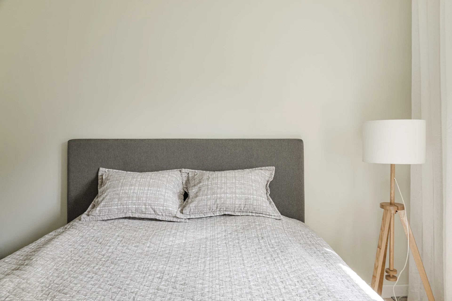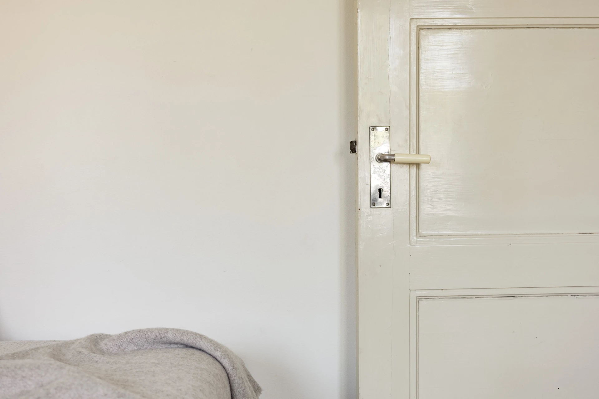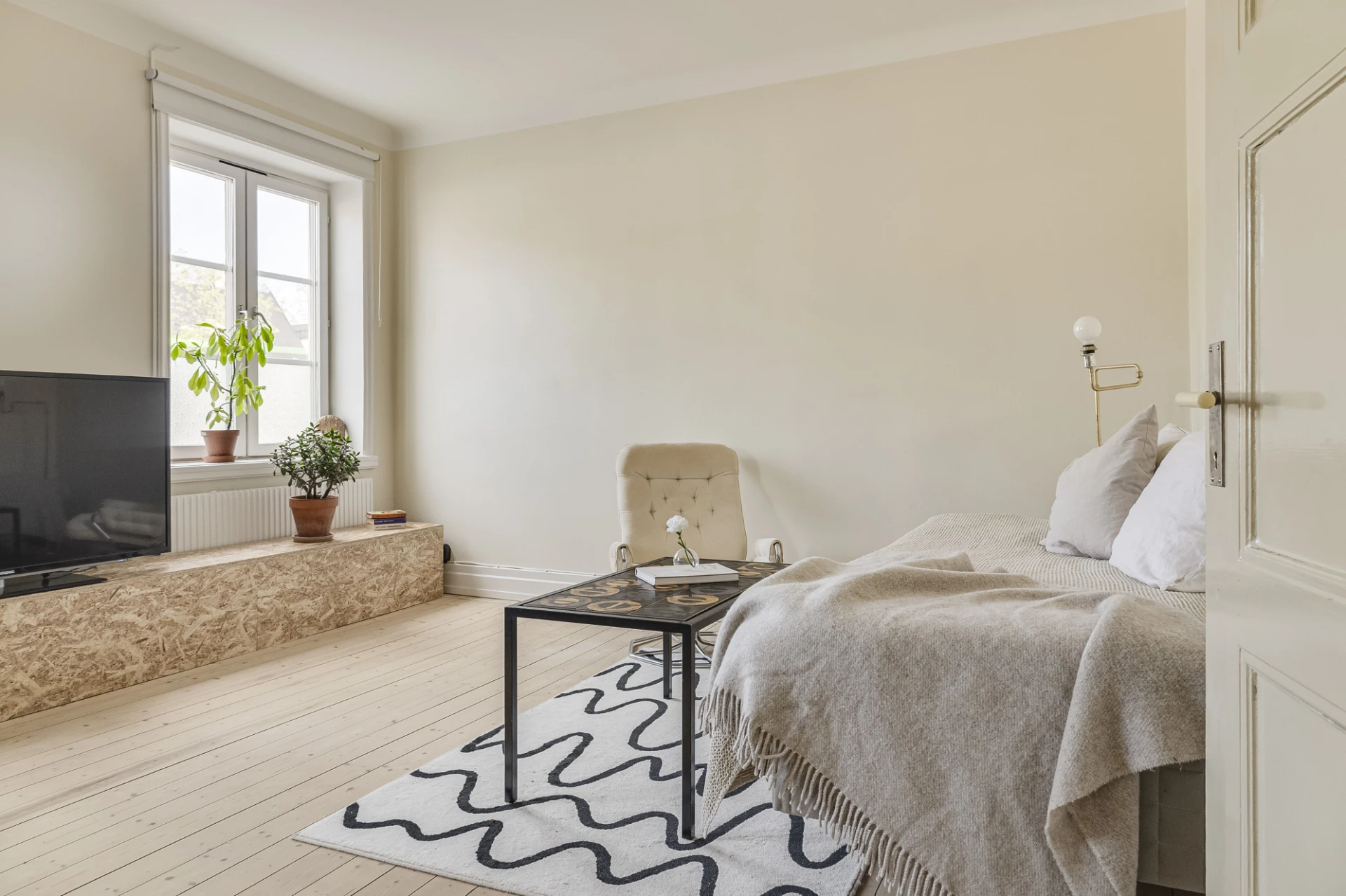 På rofyllt läge finner vi sovrummet som är beläget mot föreningens grönskande innergård. Ljusgröna väggar och brädgolv. Här ryms en dubbelsäng och garderober om behovet finns.