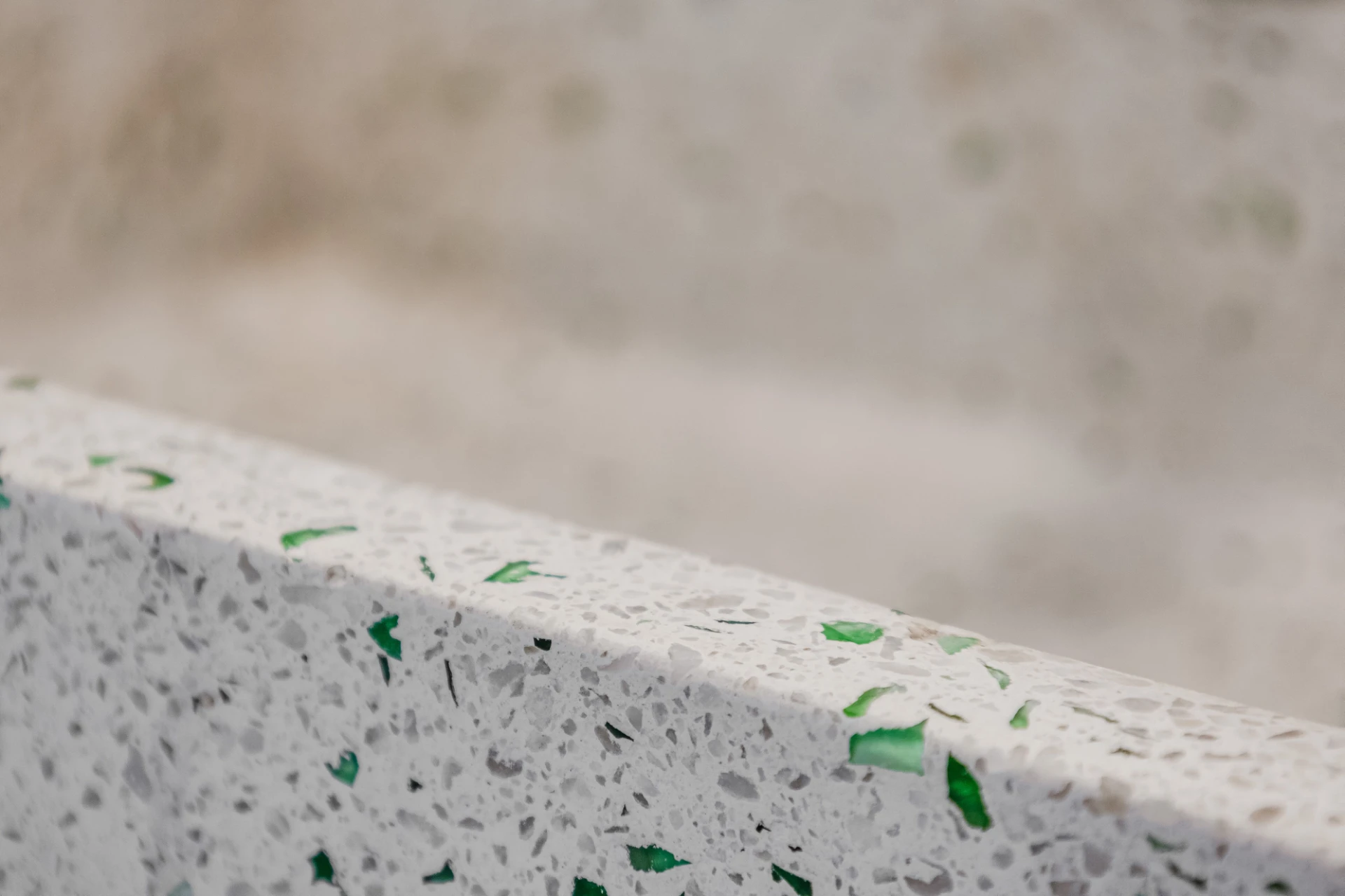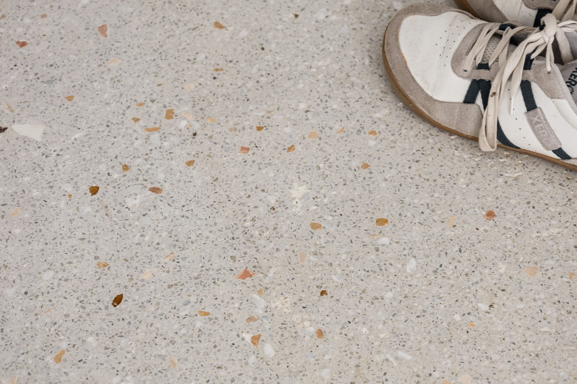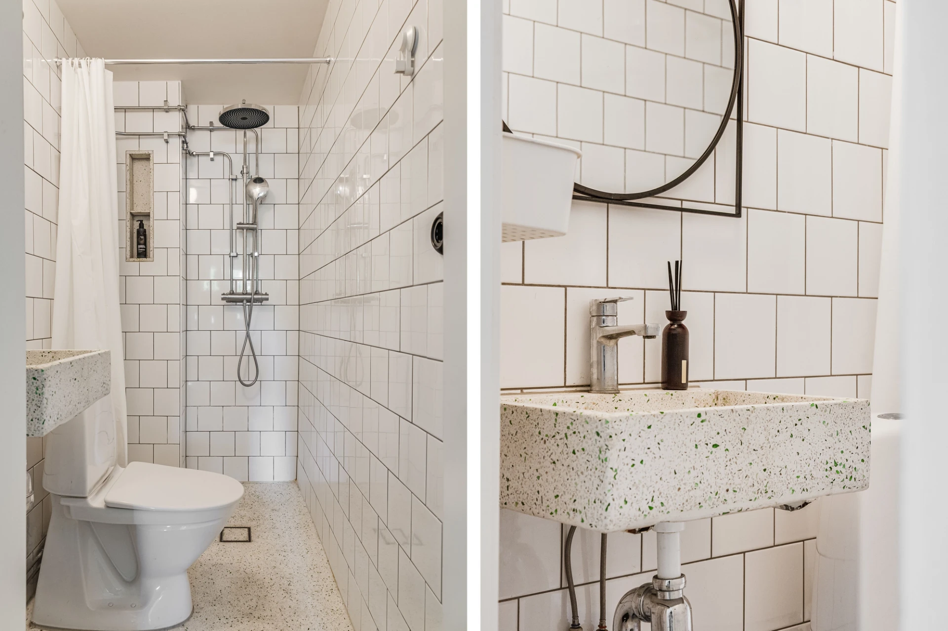 Smakfullt badrum med golv och handfat är i terrazzo. Väggarna är helkaklade i vitt. Utrustningen består av wc, handfat och dusch.