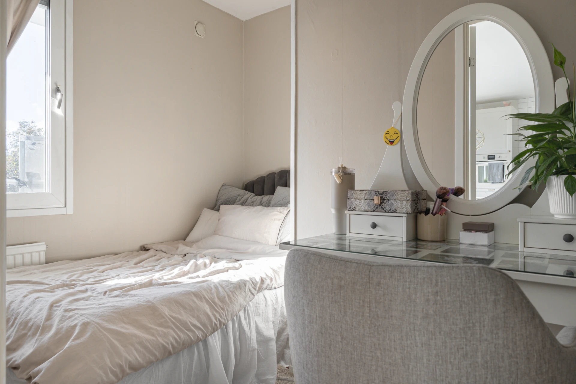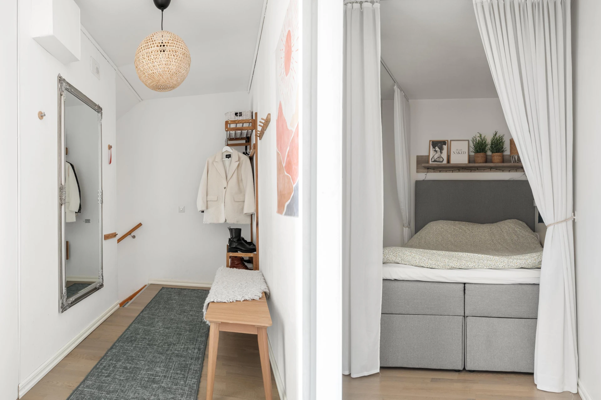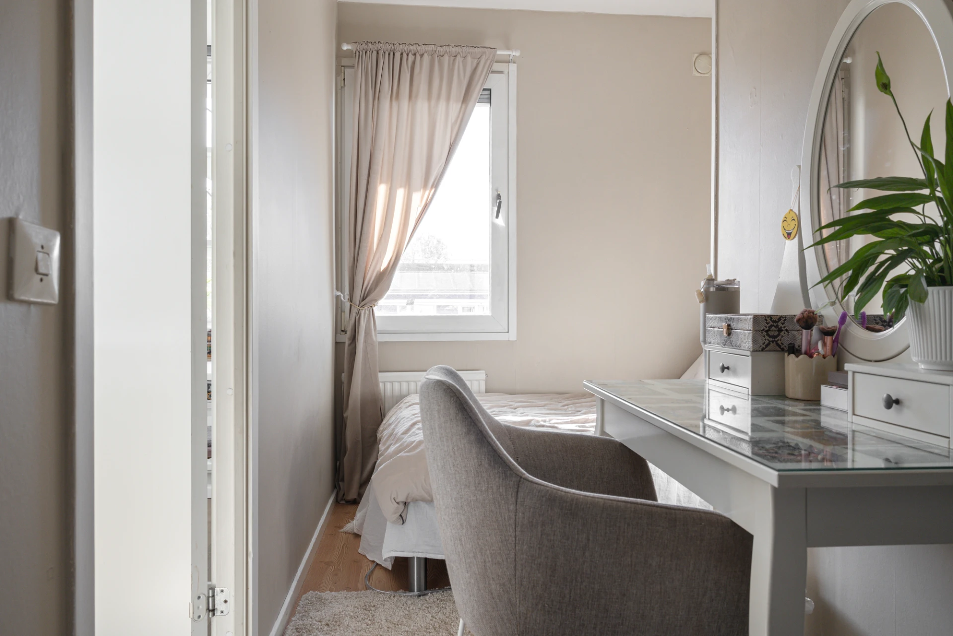 Laminatgolv och beigemålade väggar. Här finns en garderob.