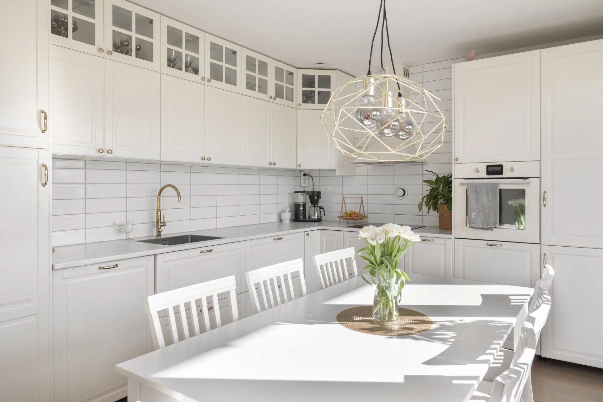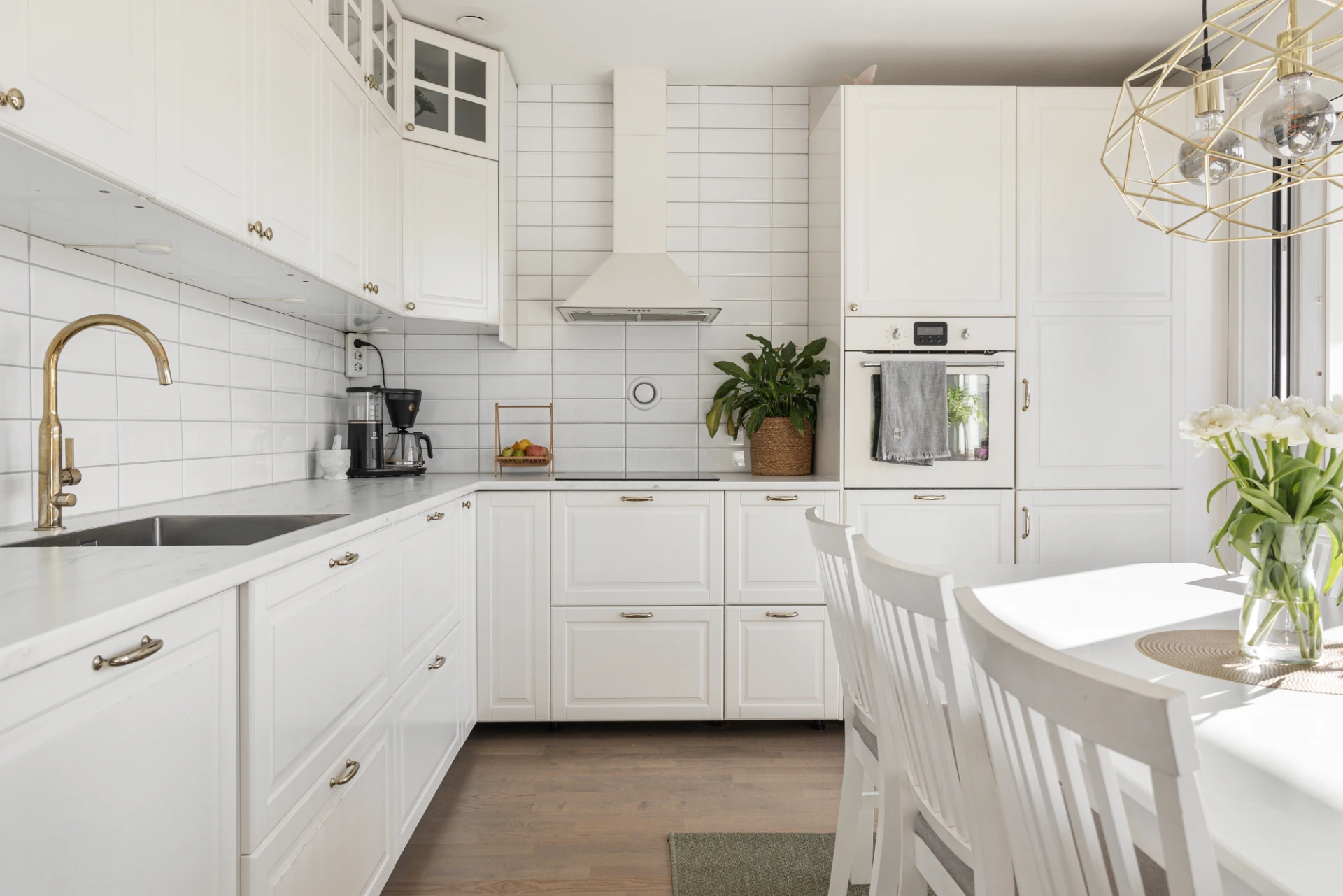 Vit köksinredning (2018), delvis med luckor med glasinfattning, beslag i mässing och vitt kakel ovan ljus, marmorerad arbetsbänk i laminat. Köket är utrustat med integrerad kyl/frys, vägghängd ugn, keramisk spishäll, fläkt, integrerad diskmaskin och diskho. Parkettgolv och ljusa väggar.