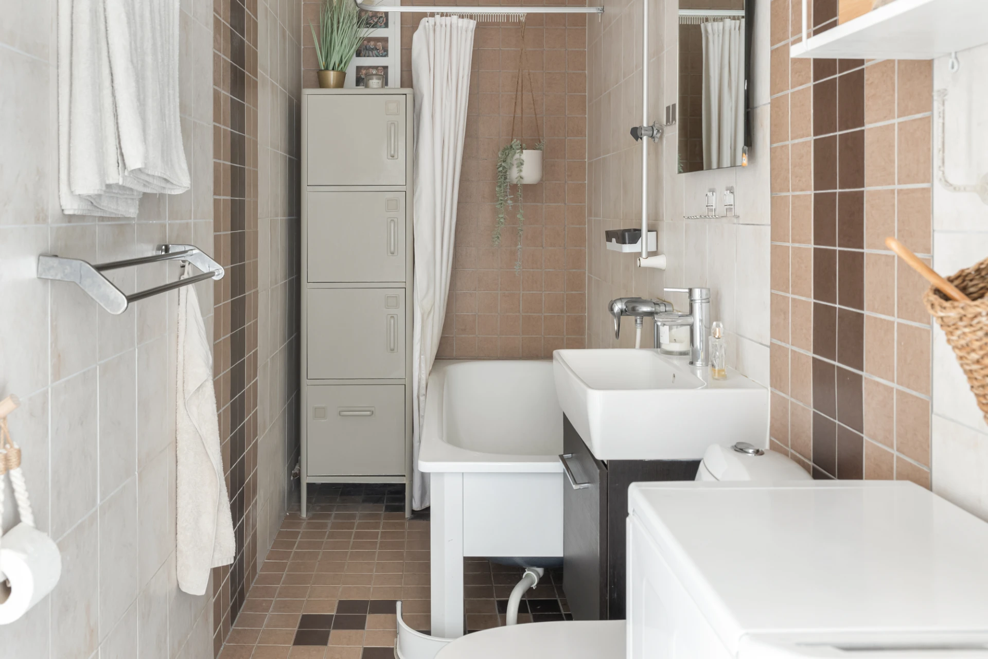 Beige och brun klinker och kakel. Badrummet är utrustat med WC, handfat med kommod, dusch och toppmatad tvättmaskin (2022).