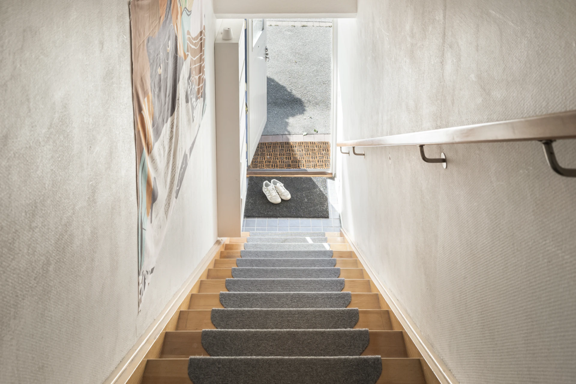 Entré från våning 1 med trappa upp till bostaden på våning 2. Grå klinker och ljusa väggar.
