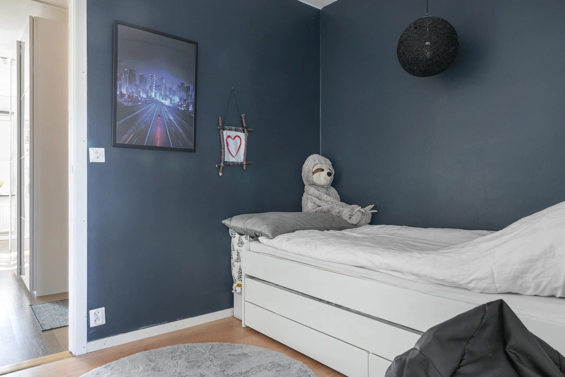 Sovrummet är idag avdelat till två mindre sovrum. Väggen kan enkelt tas ner utan att göra skada på golv och väggar. Nuvarande ägare erbjuder sig gärna att återställa detta innan inflytt om nuvarande planlösning ej önskas. Laminatgolv och målade väggar.