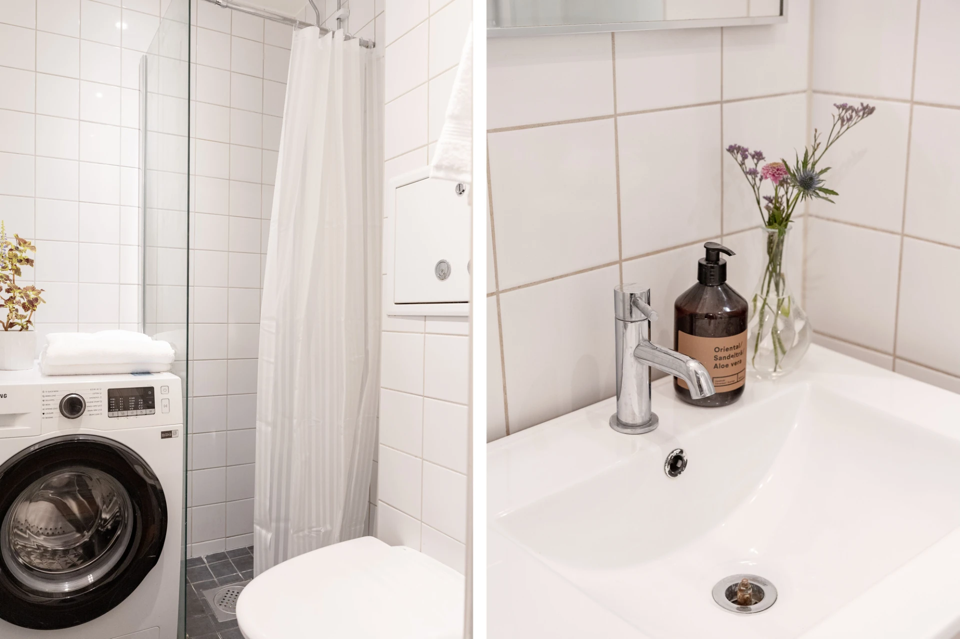 Grå klinker och vitt kakel. Utrustat med dusch med duschvägg i klarglas, vägghängd wc, handfat med vit kommod, spegel och tvättmaskin (Samsung). Infällda spotlights i tak.