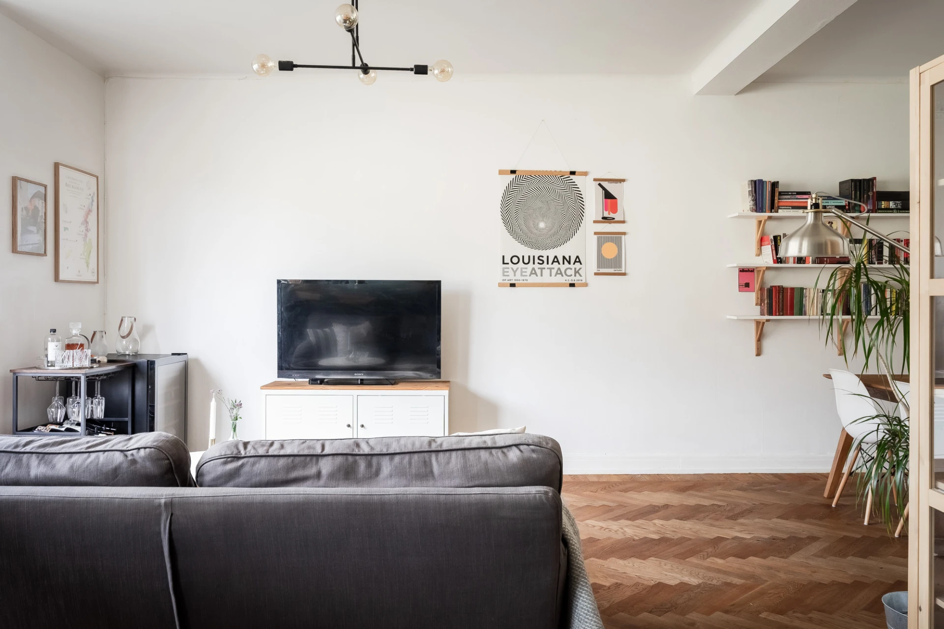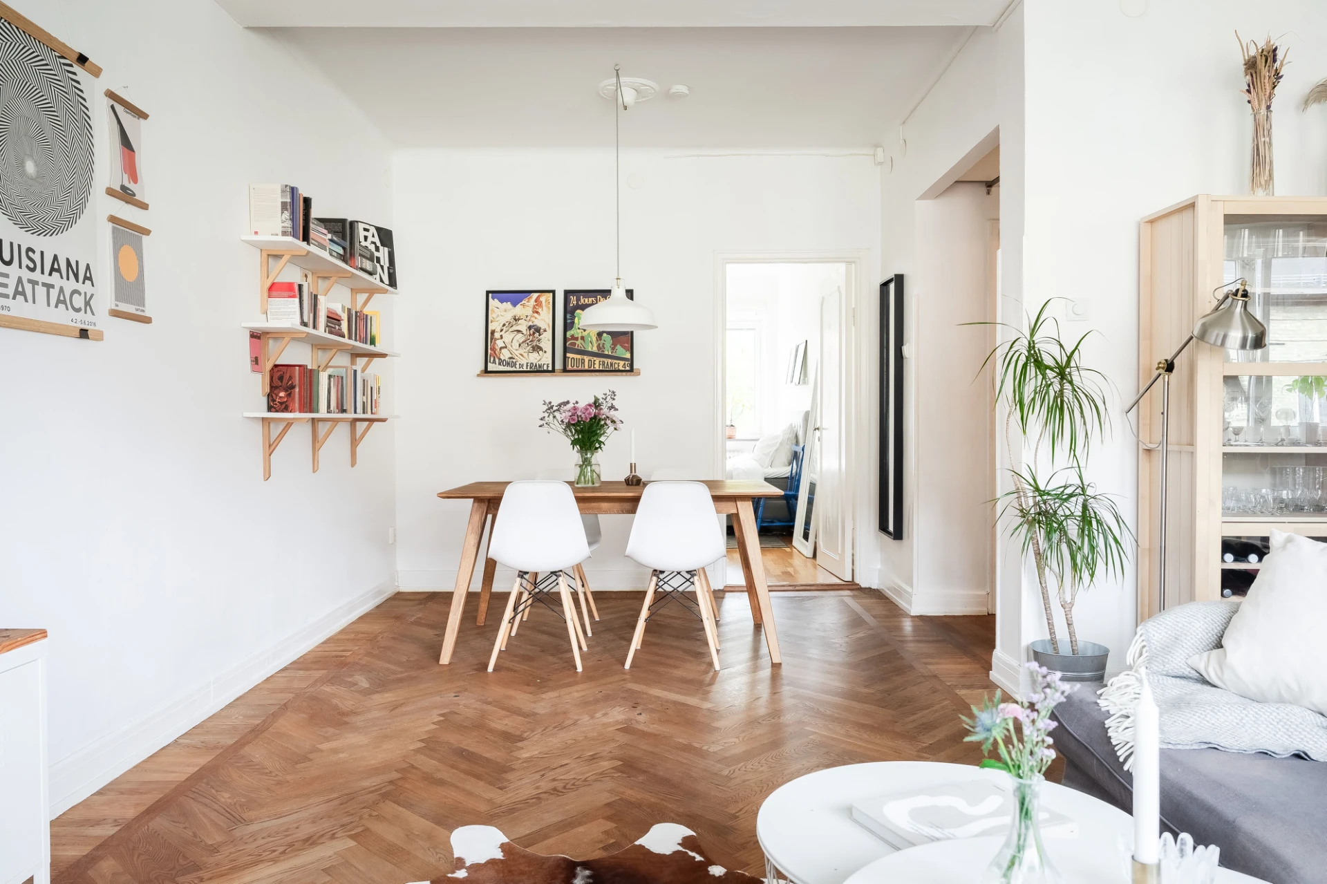 Fiskbensparkett och vita väggar. Plats för soffa och matbord. Lamprosetter. Utgång till balkong.