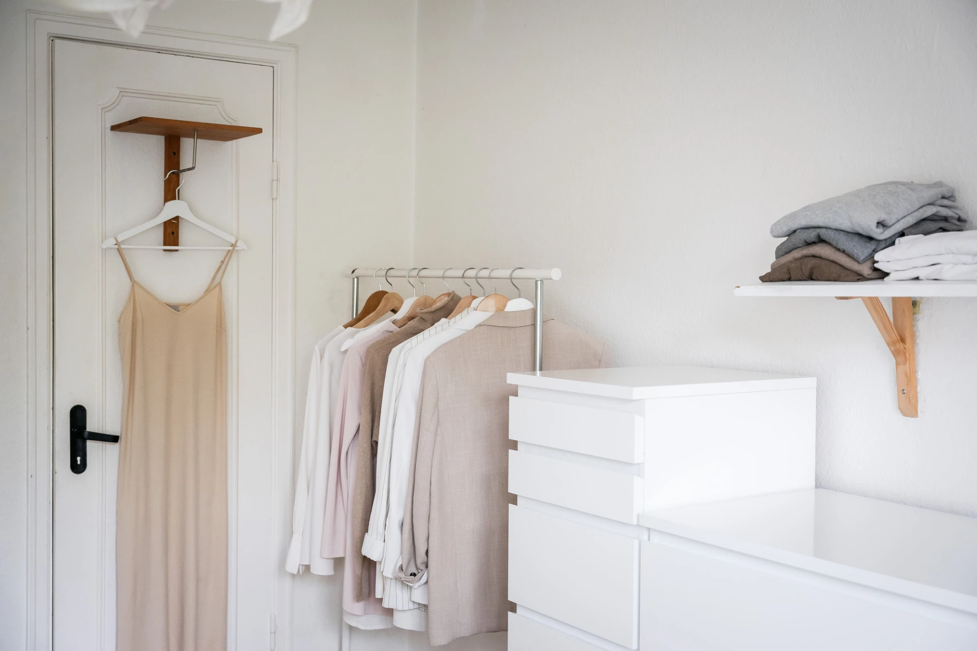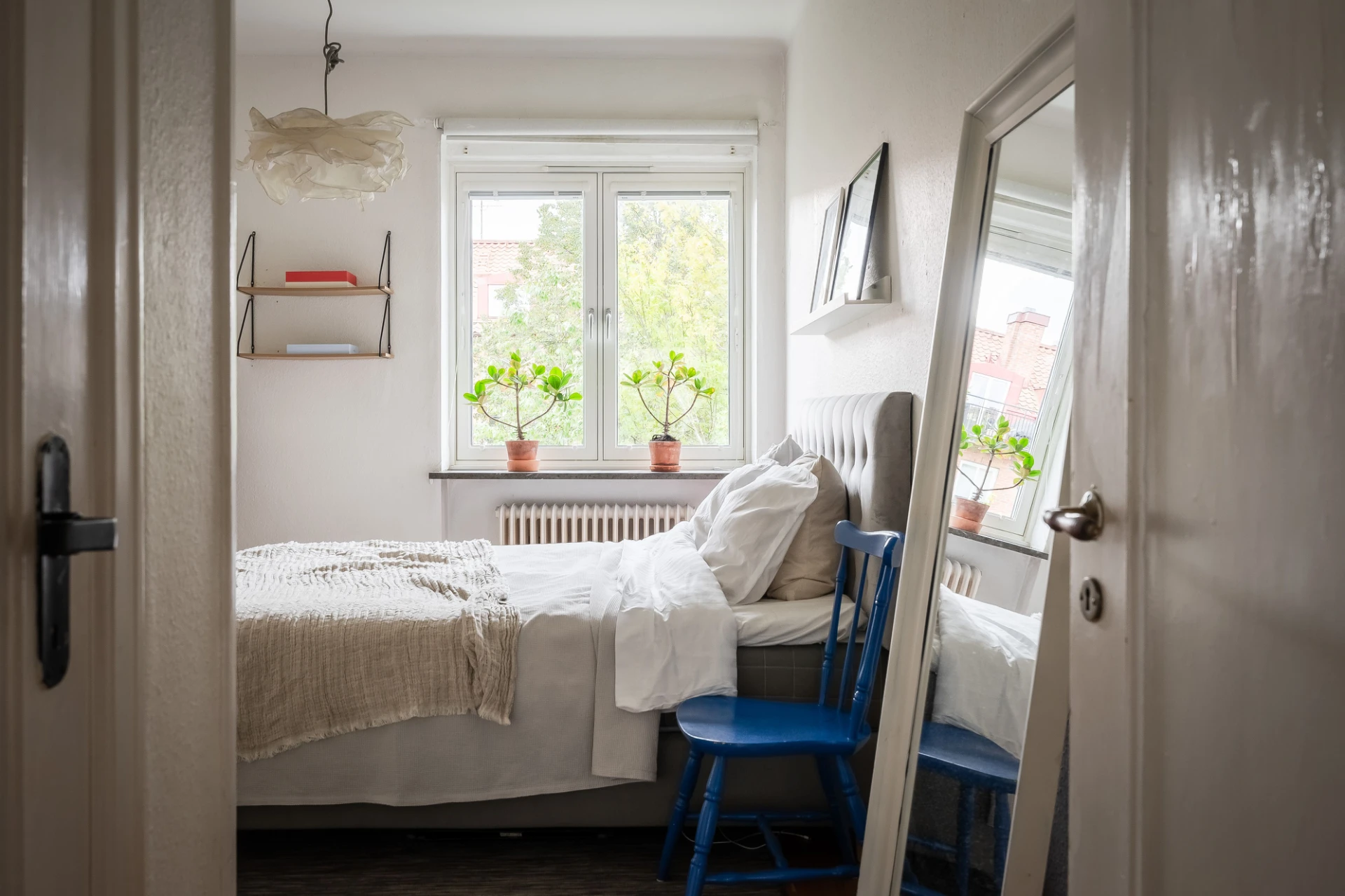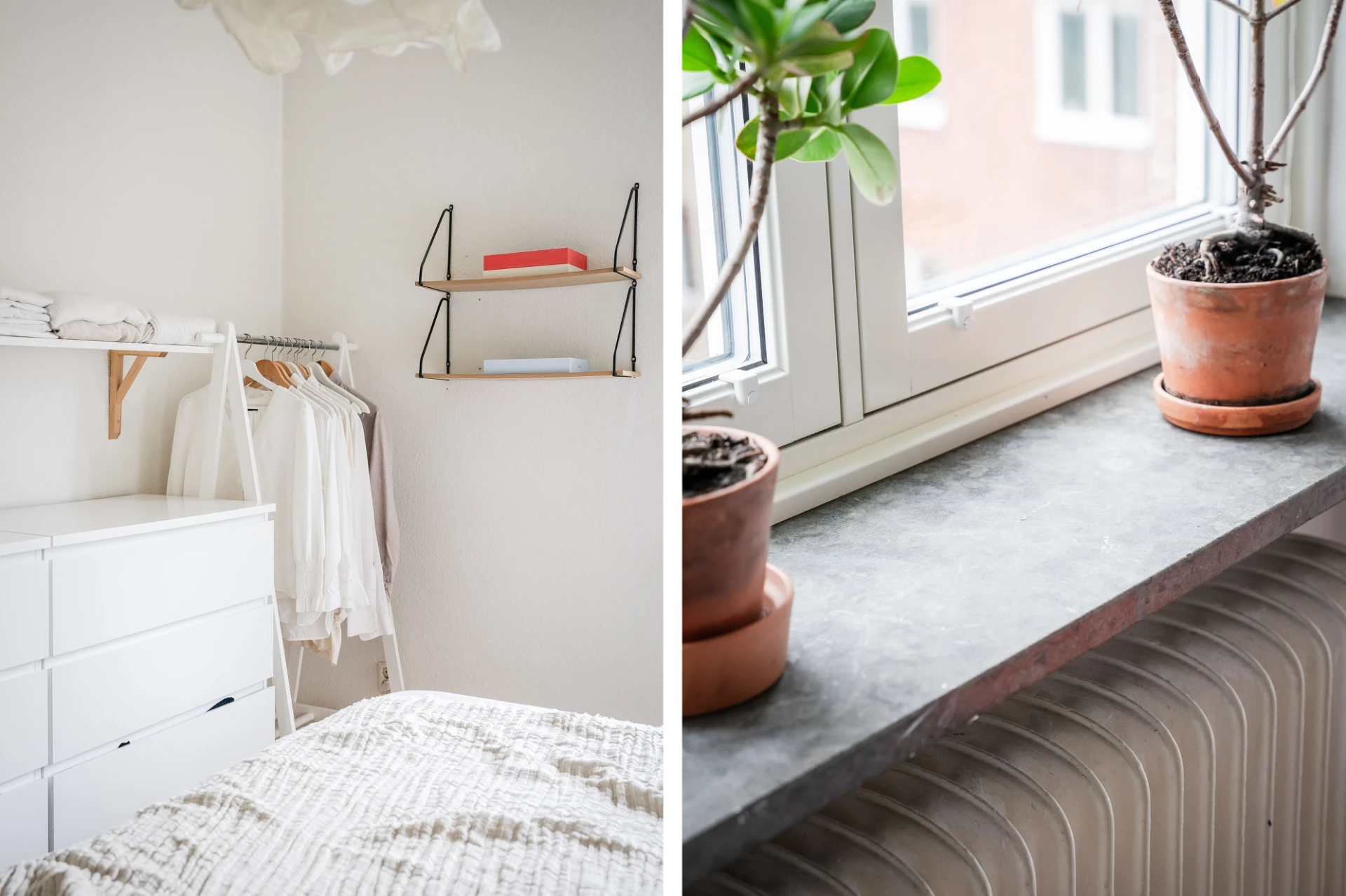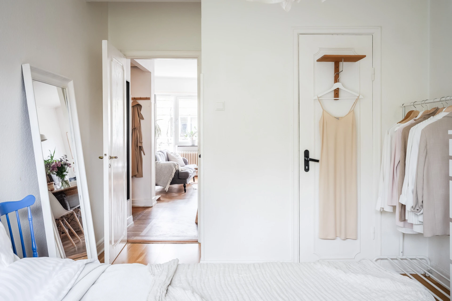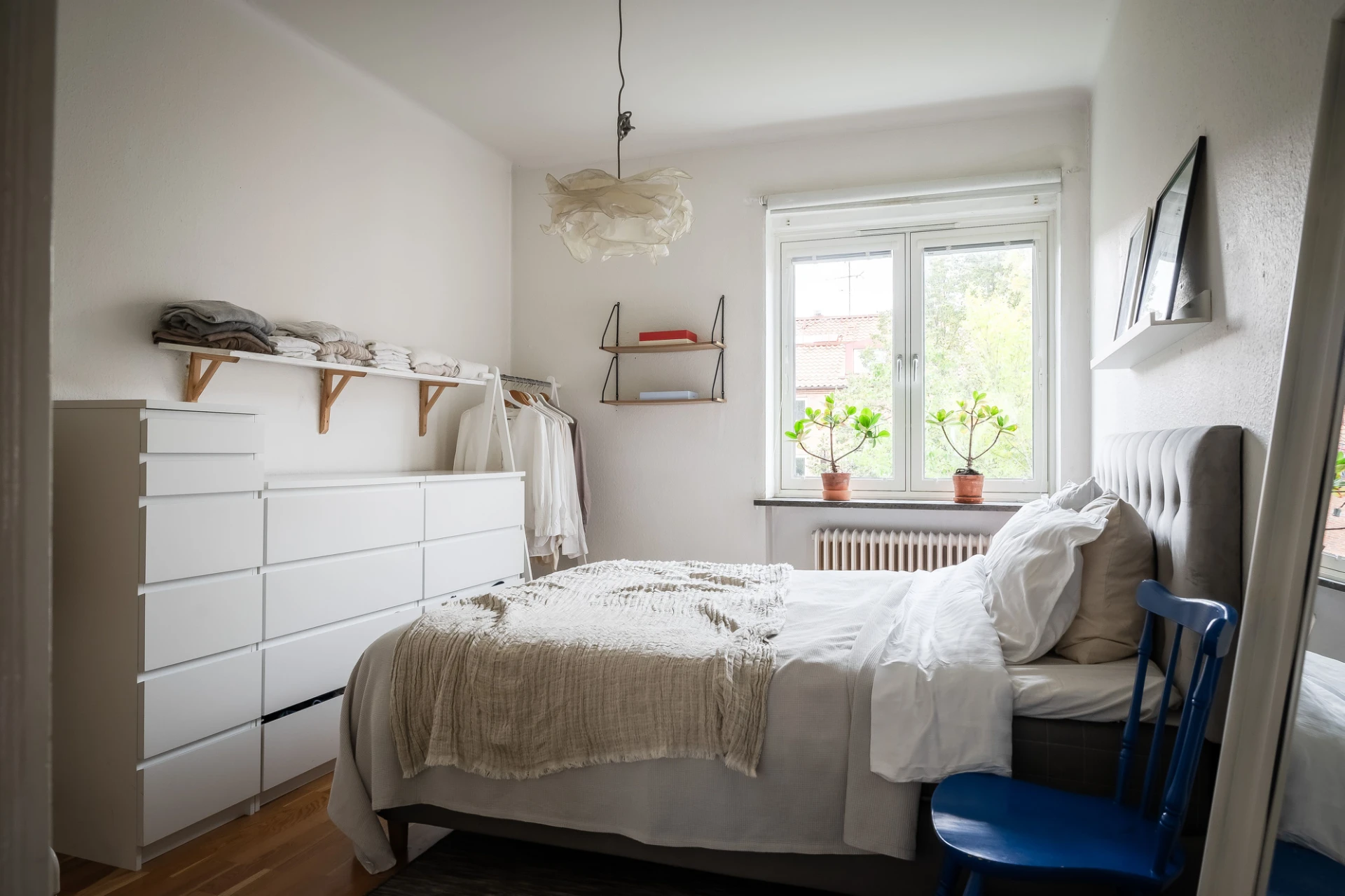 Parkettgolv och vita väggar. Plats för dubbelsäng. Lamprosett. Förvaring i en klädkammare samt en inbyggd garderob.