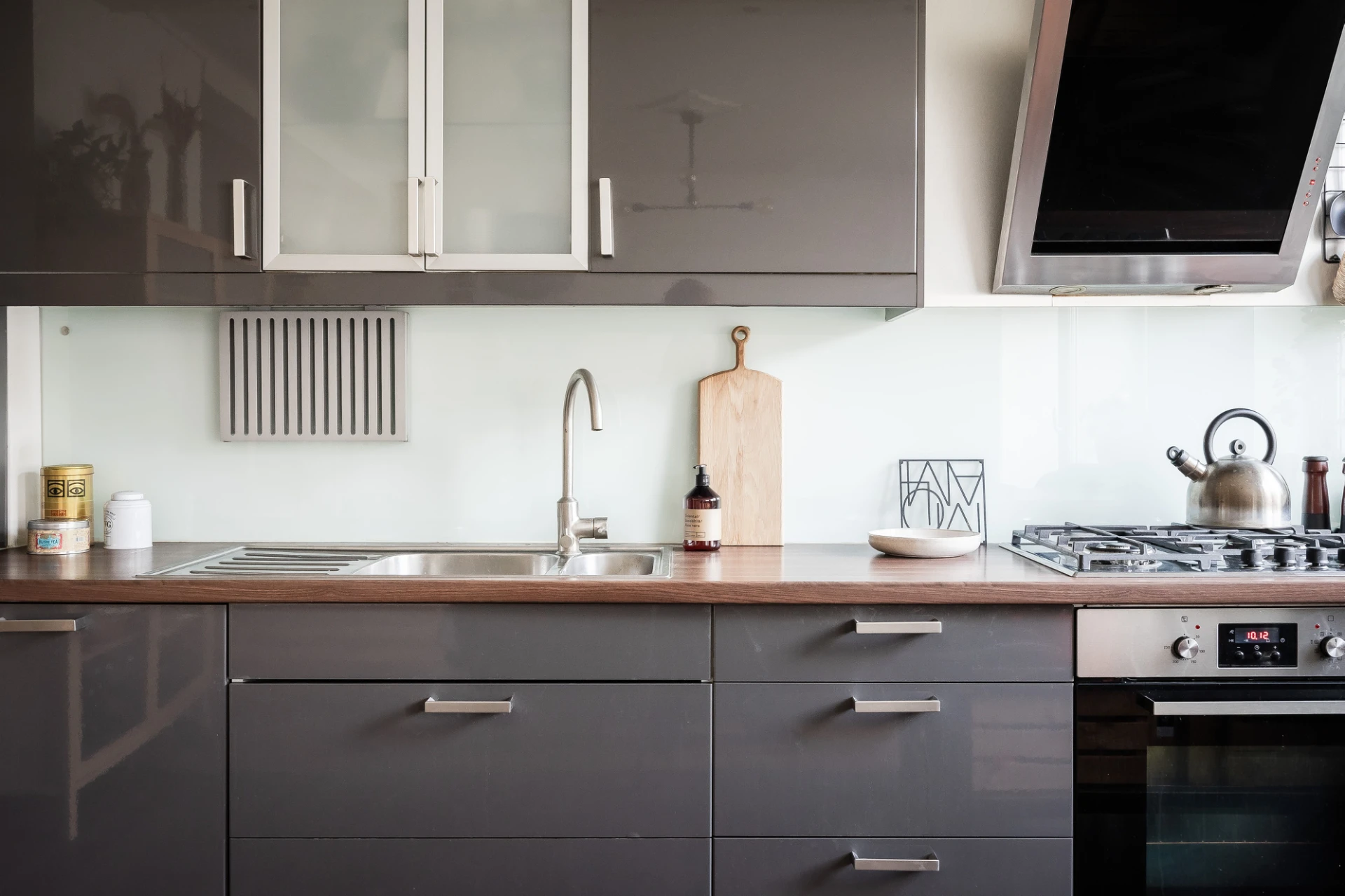 Laminatgolv och vita väggar. Grå köksinredning och stänkskydd i glas ovan trämönstrad bänkskiva. Utrustat med integrerad kyl/frys, gashäll, ugn, fläkt och integrerad diskmaskin. Köket ligger i öppen planlösning med vardagsrummet.