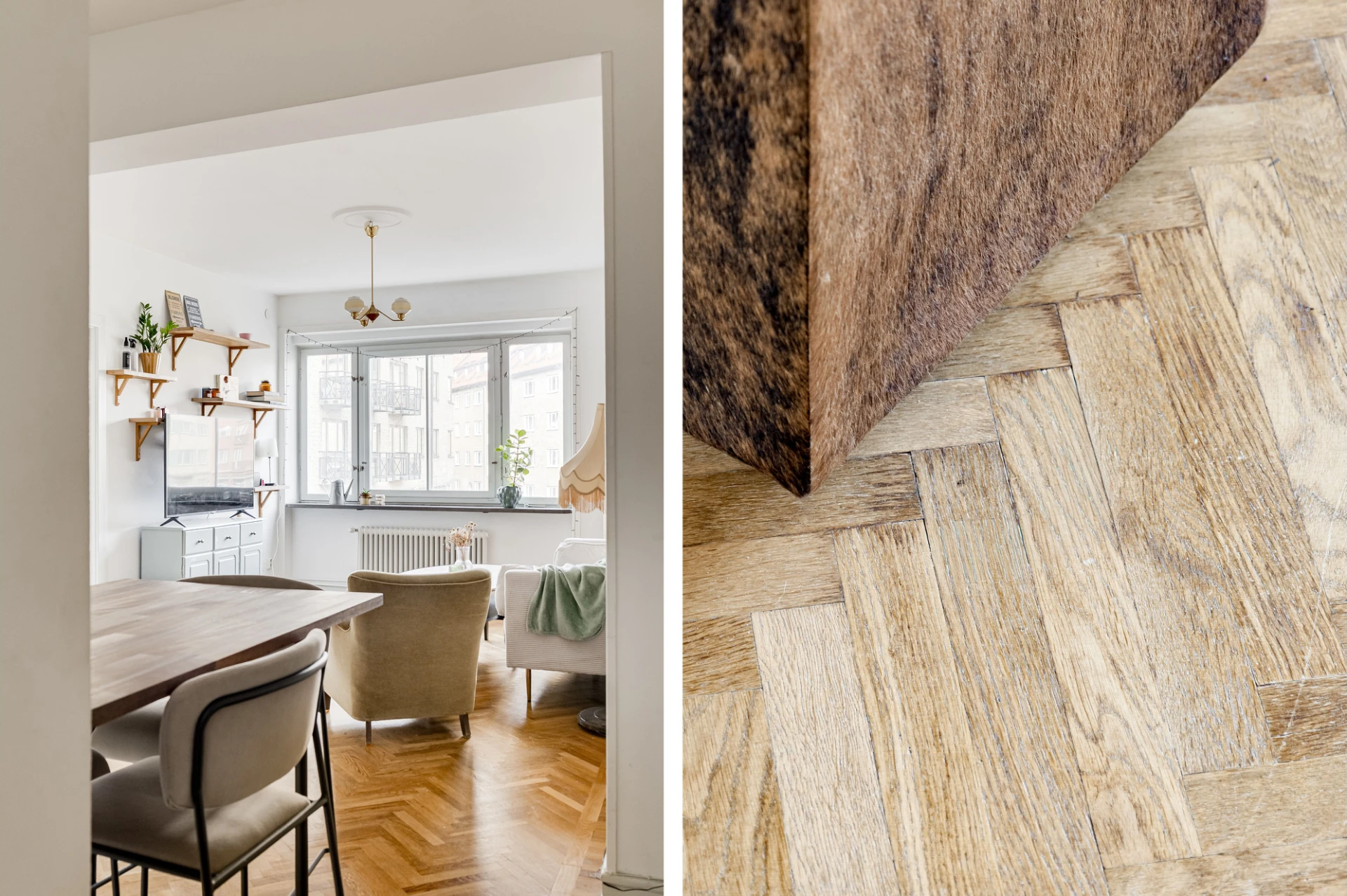 Fiskbensparkett och gröna väggar. Klädkammare.